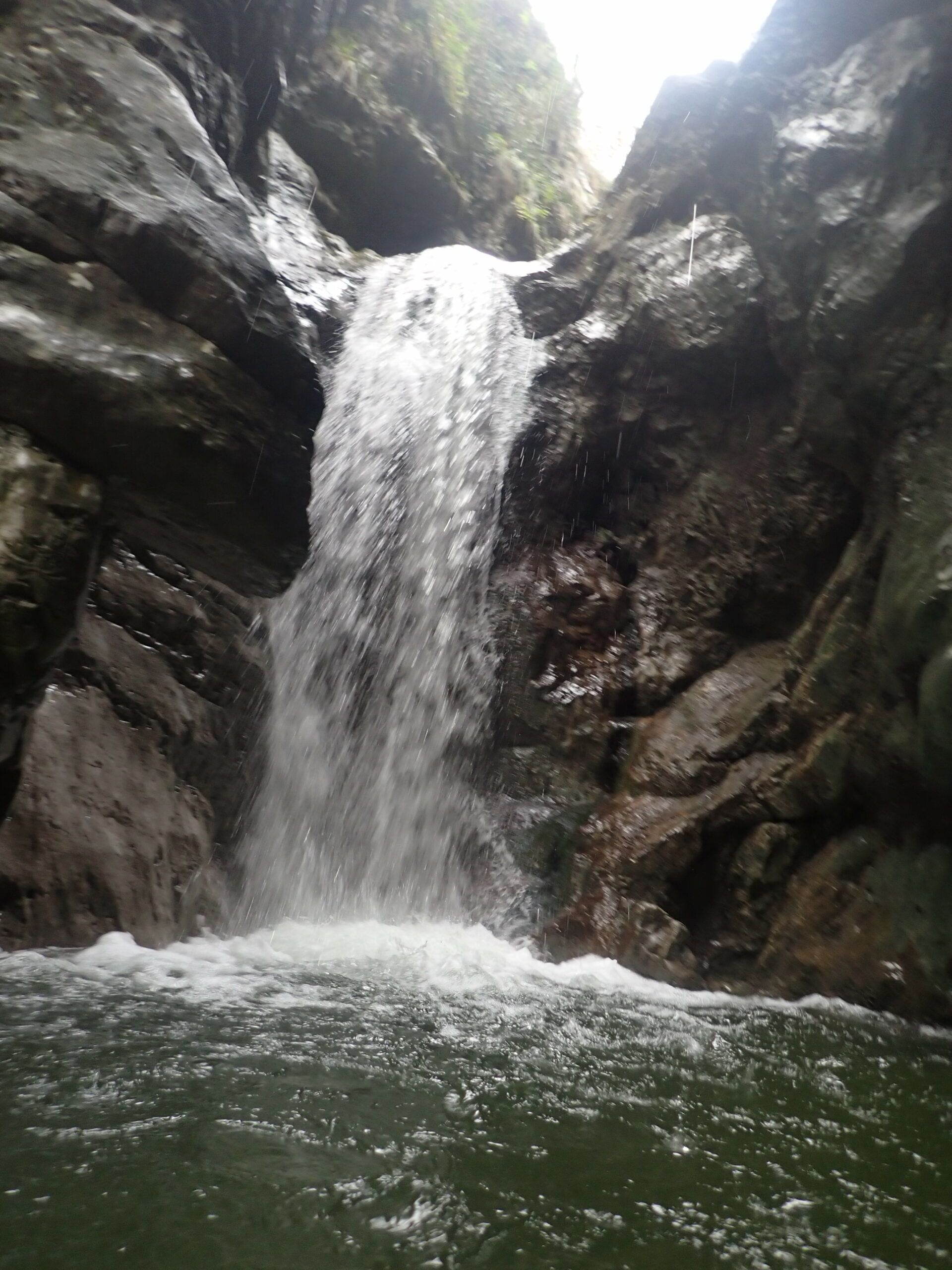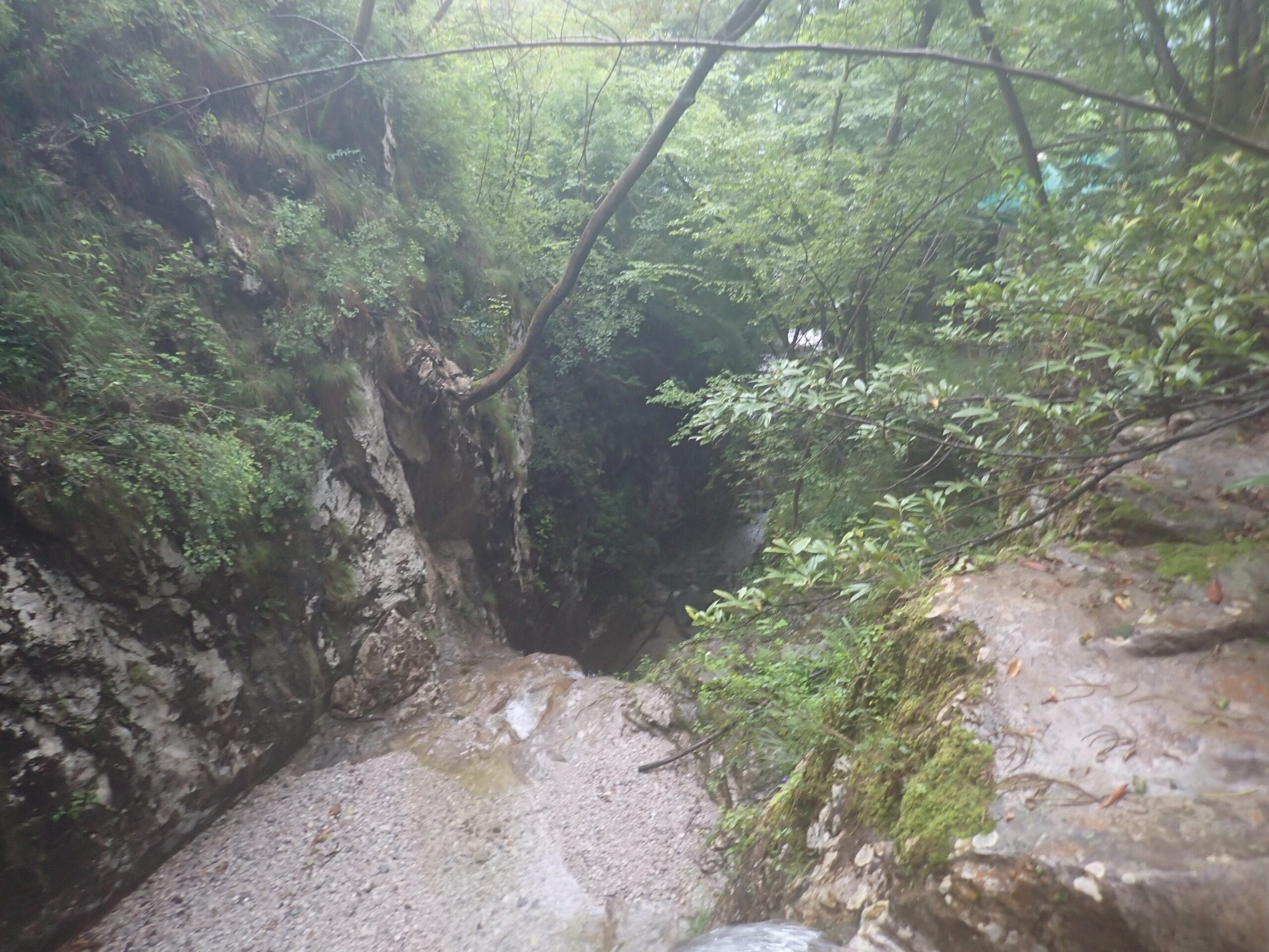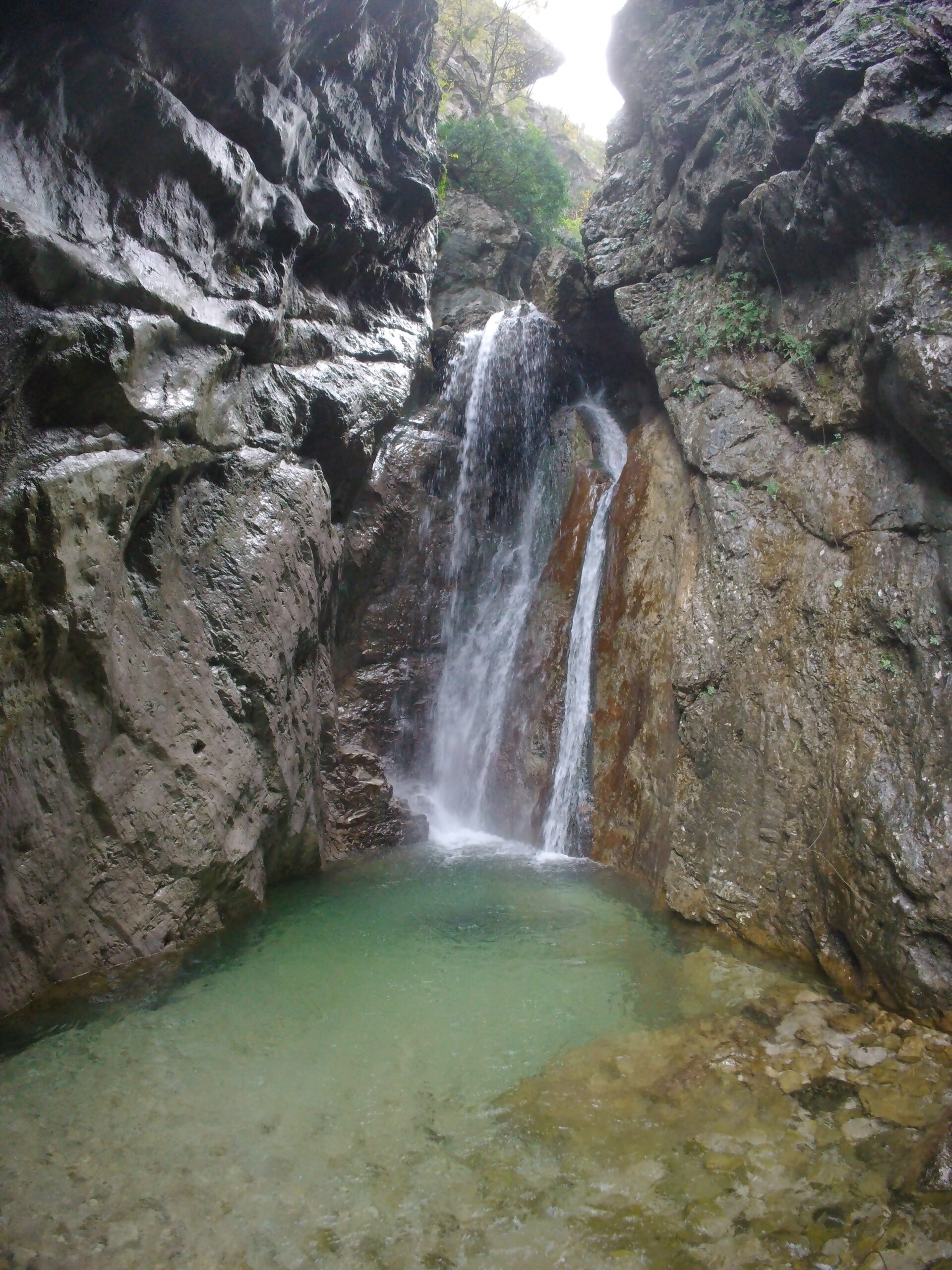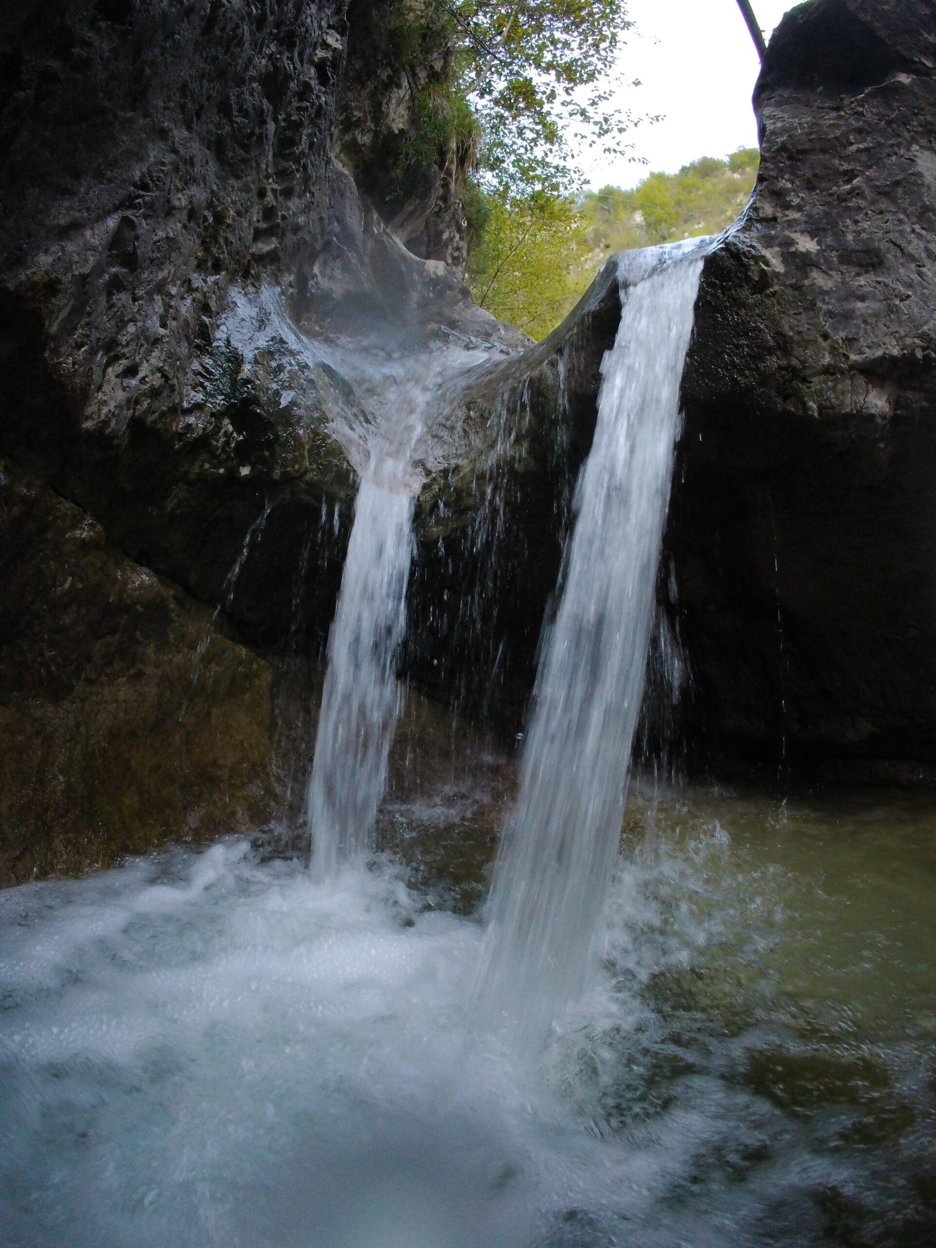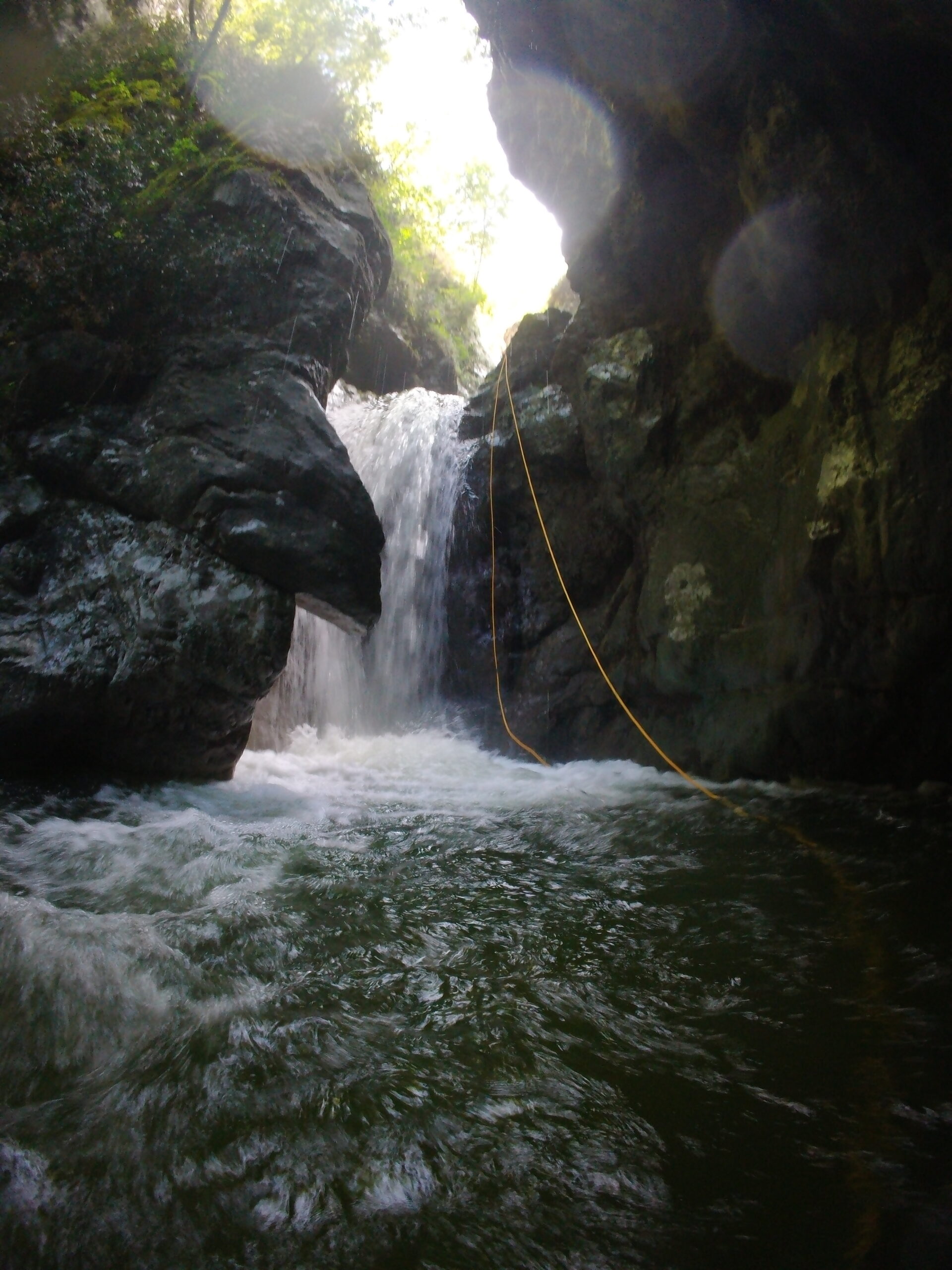 La discesa è una lunga serie di calate e disarrampicatine purtroppo senza tuffi rilevanti. Nella prima parte si sussegono diverse calate, tra cui anche le più alte, su roccia sempre abbastanza scivolosa, con qualche facile mancorrente. Superata questa parte si trova un tratto piano abbastanza aperto dove si cammina.