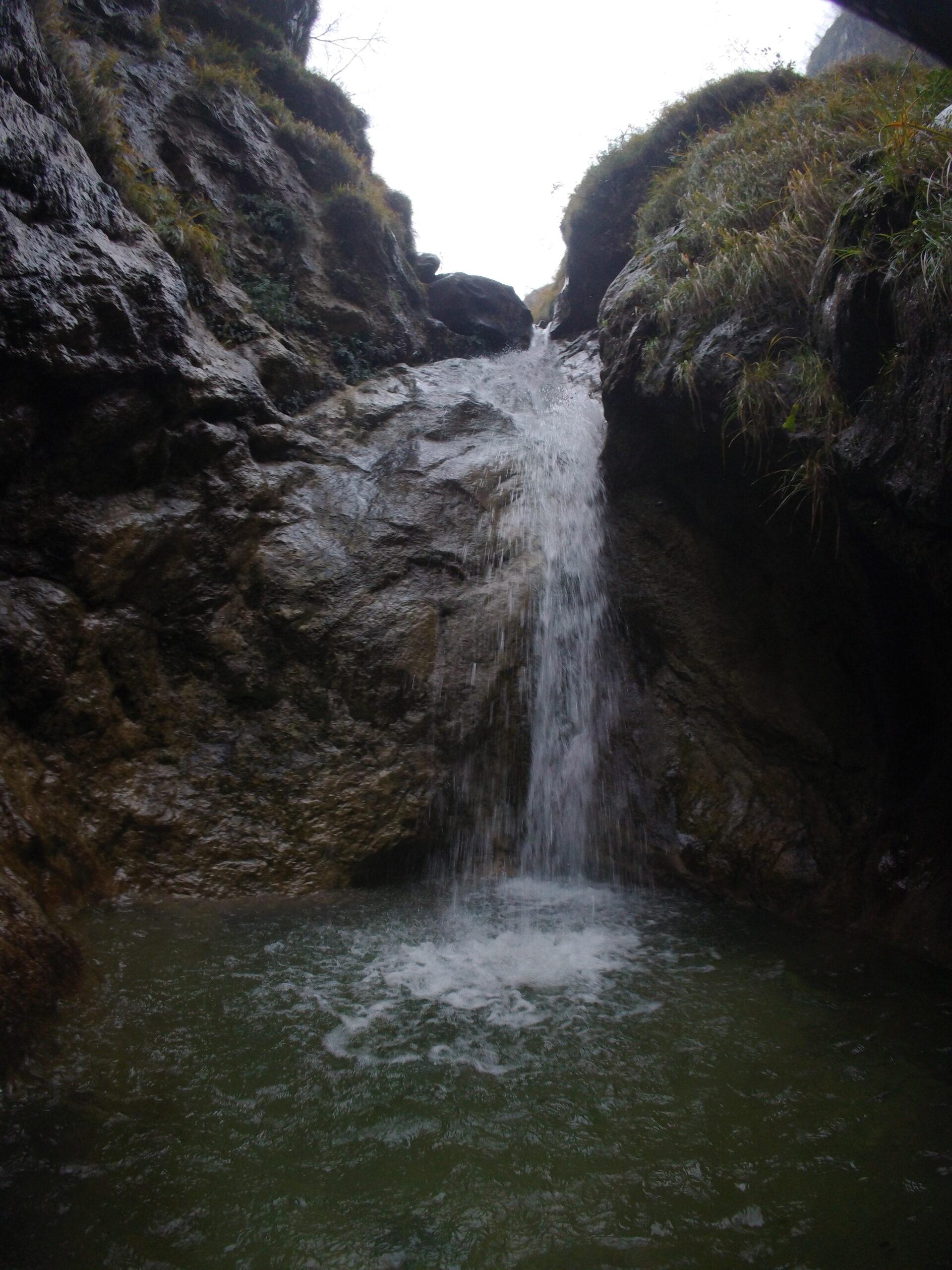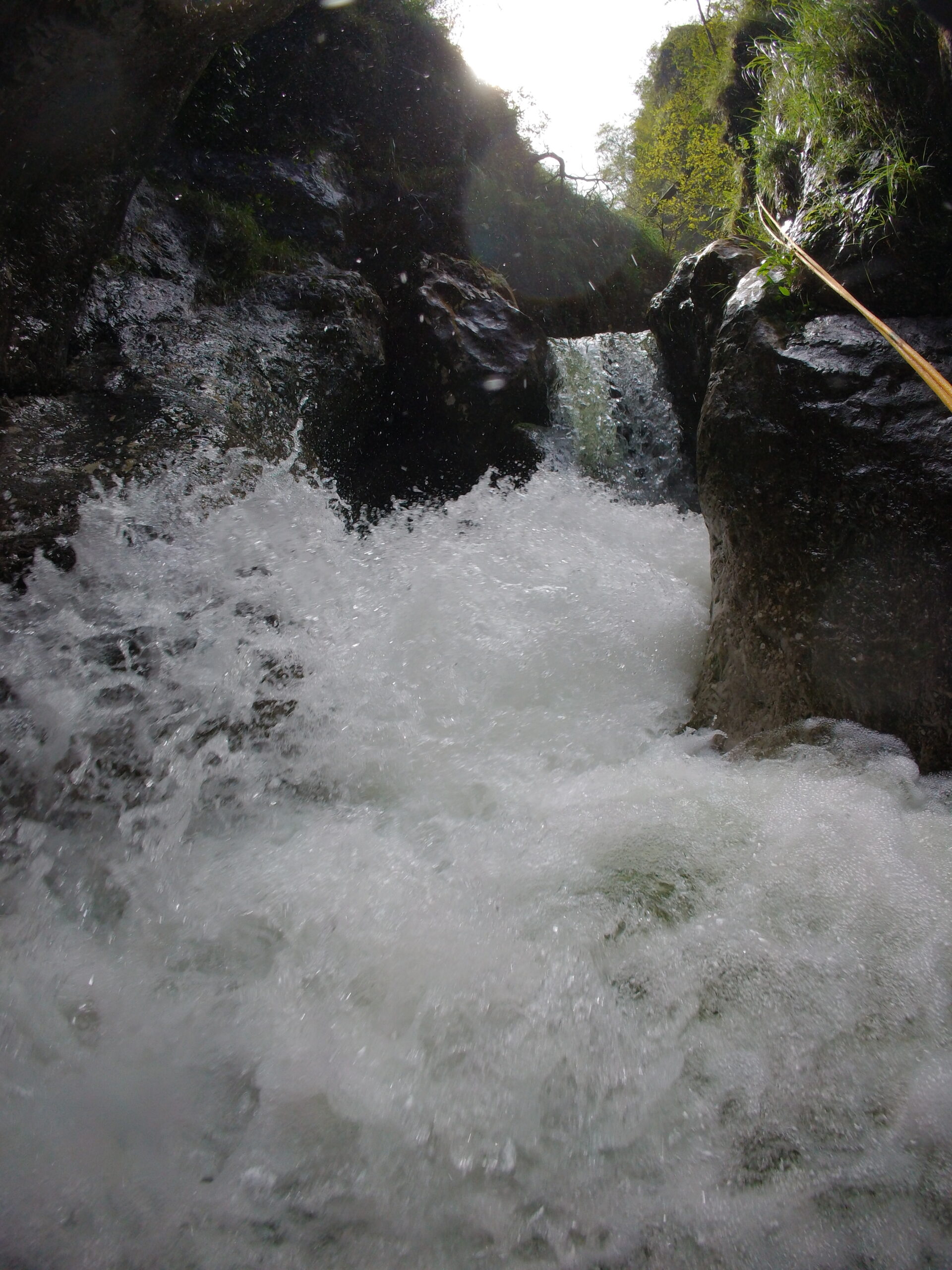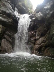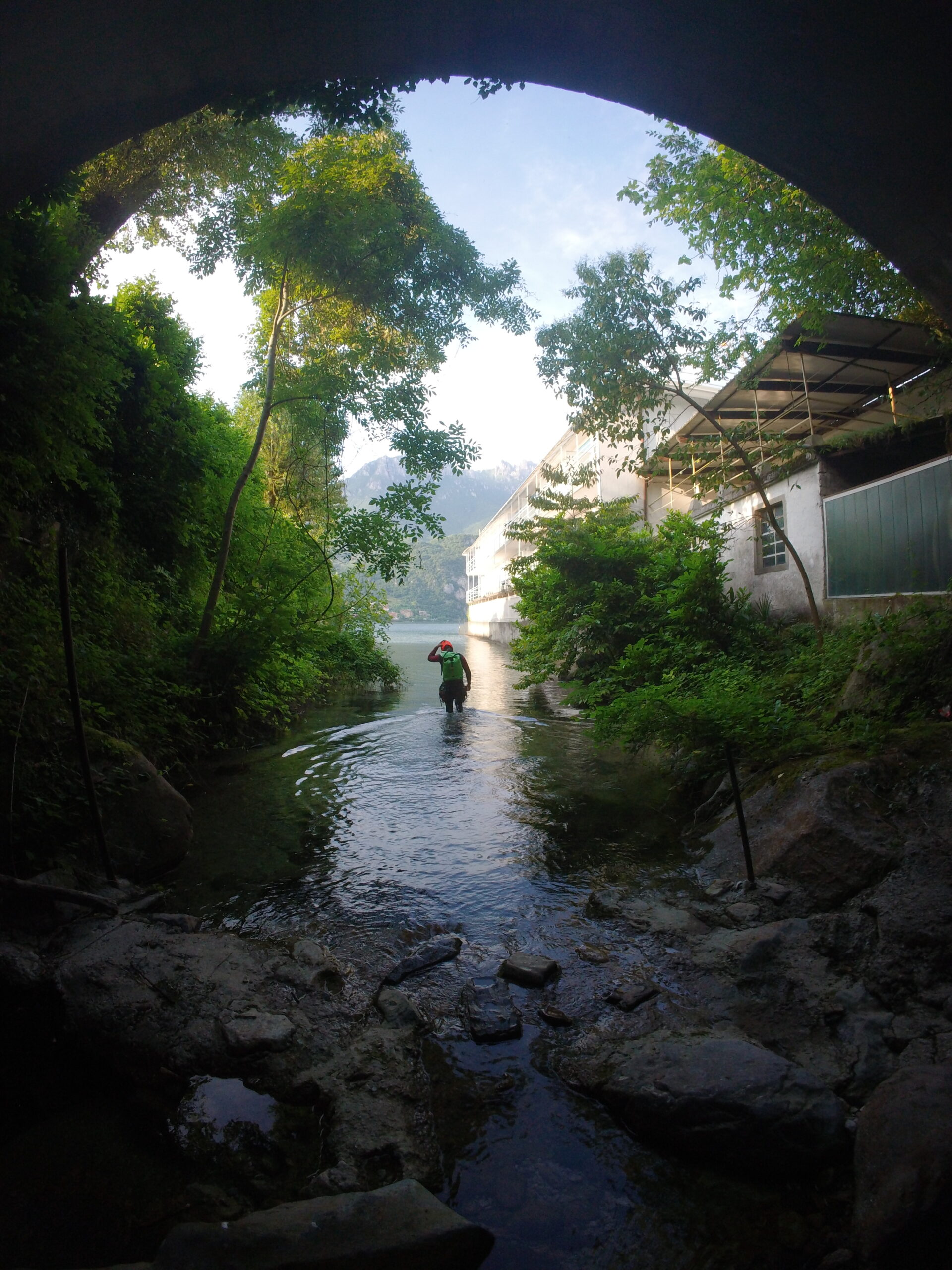 L’ultima parte è la più facile, anche se sempre molto scivolosa: si prosegue fino a un vascone artificiale, che si supera con attenzione con calata da albero o disarrampicando con attenzione su delle staffe vecchie nel muro. Si trova poi un salto che si scende sulla destra tramite catena e scaletta fissa, e una catena su terreno un po’ liscio permette di scendere fino ad altri infissi artificiali, dove il ponticello sulla destra è la seconda via di fuga. Qui il canyon diventa abbastanza inforrato, e l’ultima serie di 4-5 calate (alcune molto scivolose, attenzione) portano all’uscita sotto la strada e accanto al motel Nautilus, uscendo direttamente nel lago (storicamente c’era una rete a cui passar sotto, ma che quest’anno non abbiamo trovato).