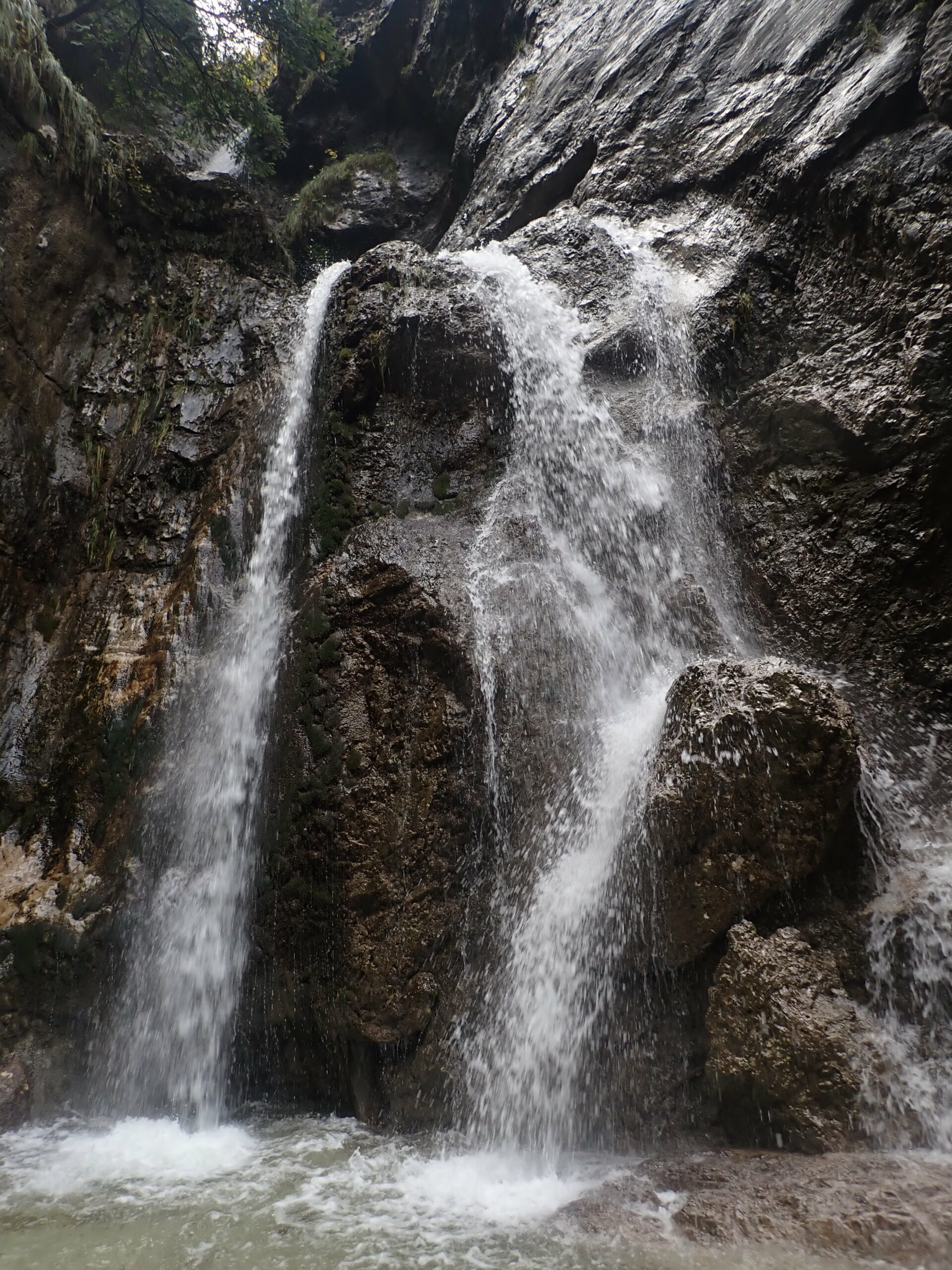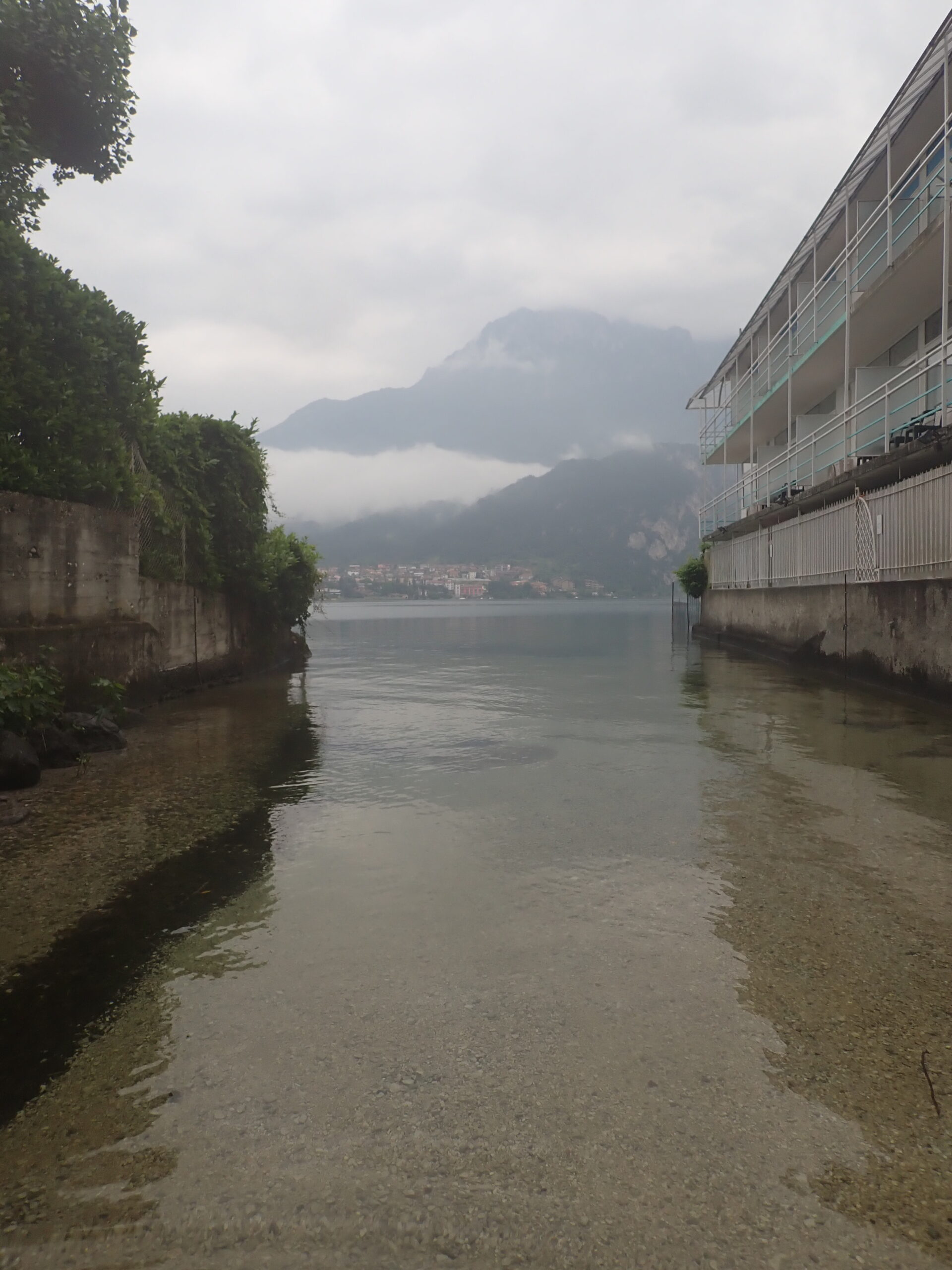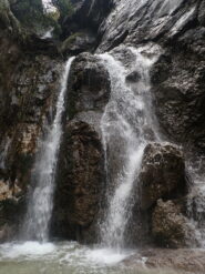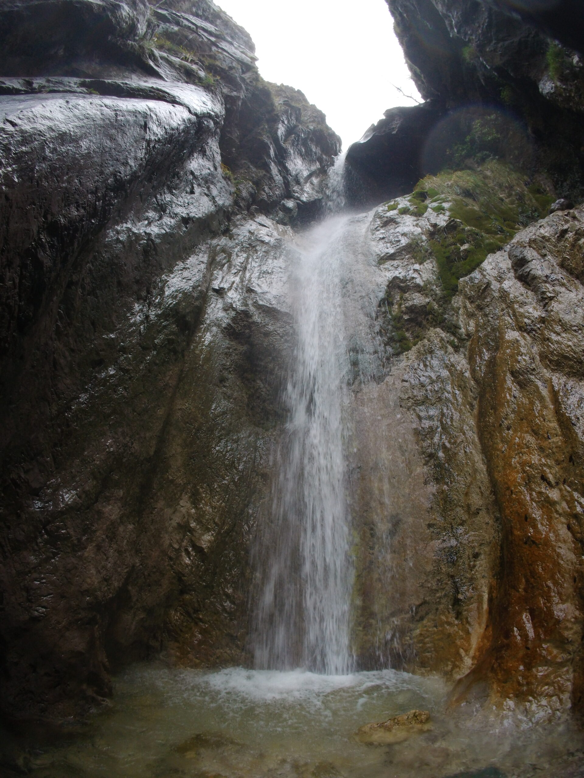 L’ultima parte è la più facile, anche se sempre molto scivolosa: si prosegue fino a un vascone artificiale, che si supera con attenzione con calata da albero o disarrampicando con attenzione su delle staffe vecchie nel muro. Si trova poi un salto che si scende sulla destra tramite catena e scaletta fissa, e una catena su terreno un po’ liscio permette di scendere fino ad altri infissi artificiali, dove il ponticello sulla destra è la seconda via di fuga. Qui il canyon diventa abbastanza inforrato, e l’ultima serie di 4-5 calate (alcune molto scivolose, attenzione) portano all’uscita sotto la strada e accanto al motel Nautilus, uscendo direttamente nel lago (storicamente c’era una rete a cui passar sotto, ma che quest’anno non abbiamo trovato).