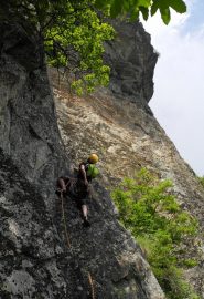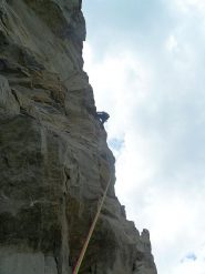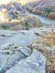 - L2) Salire sotto allo strapiombo, spostarsi a destra e salire verticalmente per una decina di metri; passare a destra di alcuni massi instabili e continuare lungo lo sperone raggiungendo poi a sinistra, un punto di sosta su un terrazzo vicino a una grande quercia (5b, friends utili)