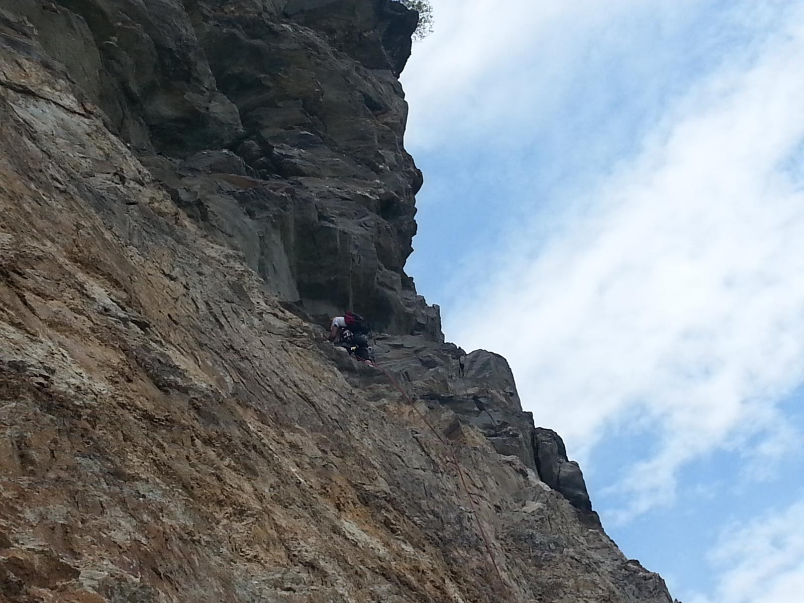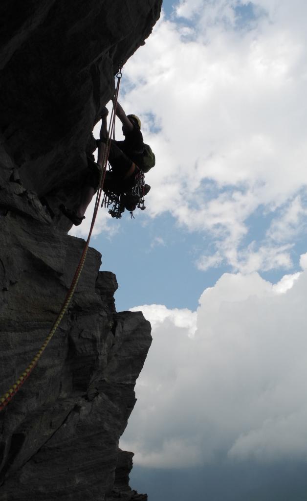 - L9) Attraversare a destra e risalire uno sperone strapiombante ma ben appigliato fino ad un piccolo punto di sosta sul margine destro del tetto (6a, 6b)