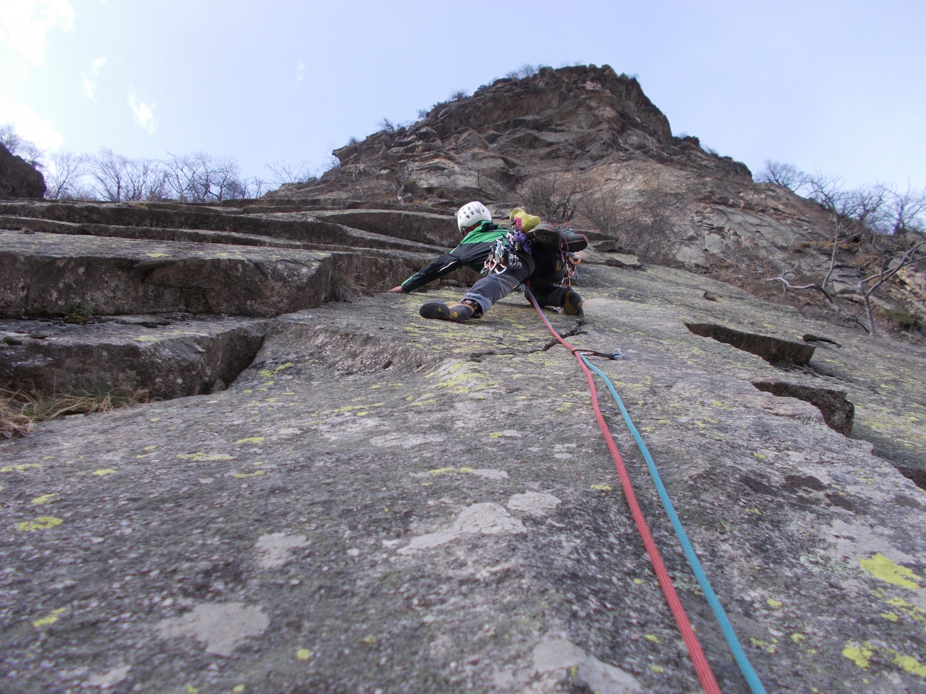 - L4) Continuare con bella arrampicata su lame staccate e fessure fino a una cengia (5c)