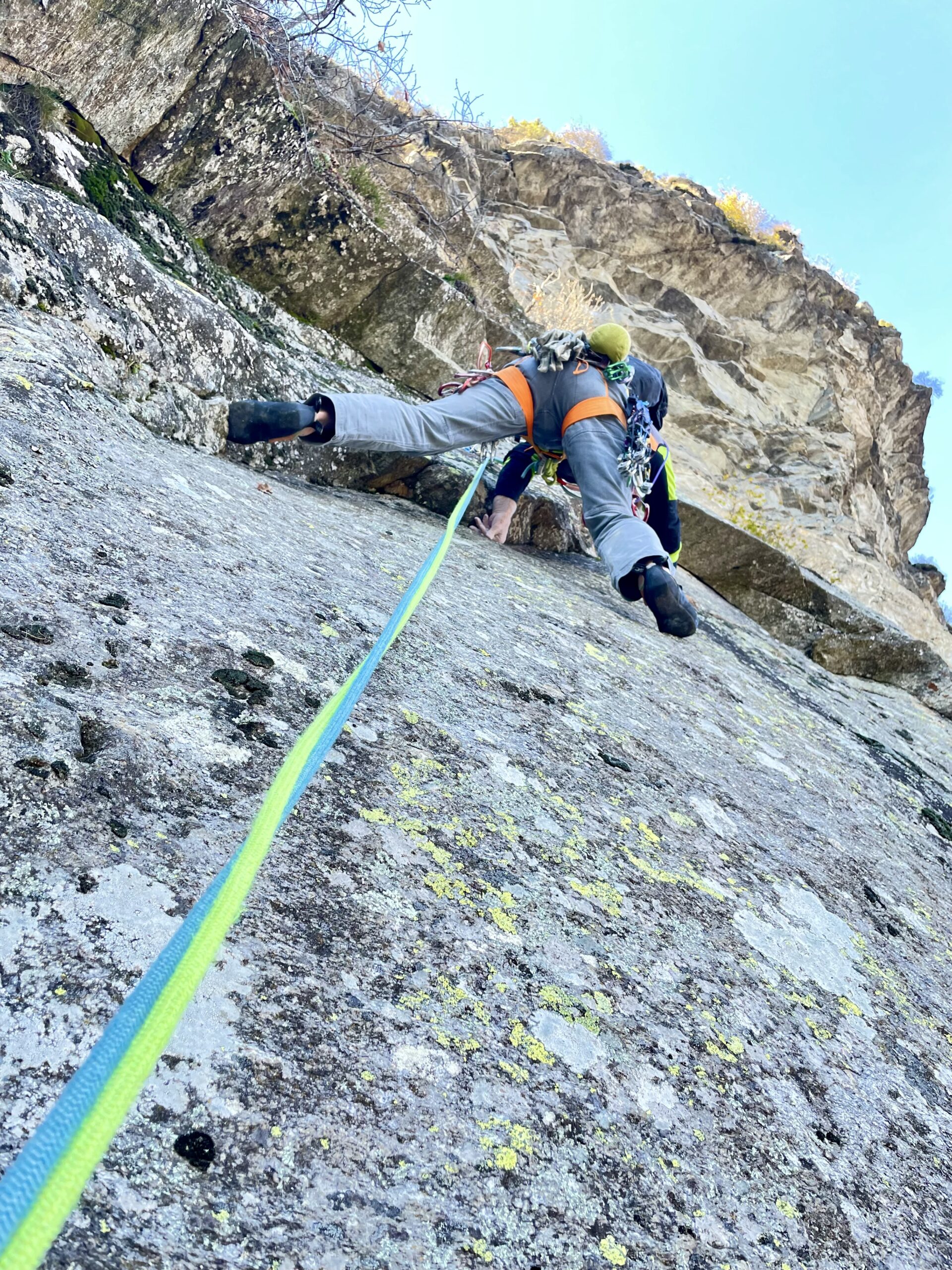 - L3) Spostarsi a sinistra e salire su belle placche fino ad un punto di sosta (6a, passo 6a+)