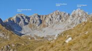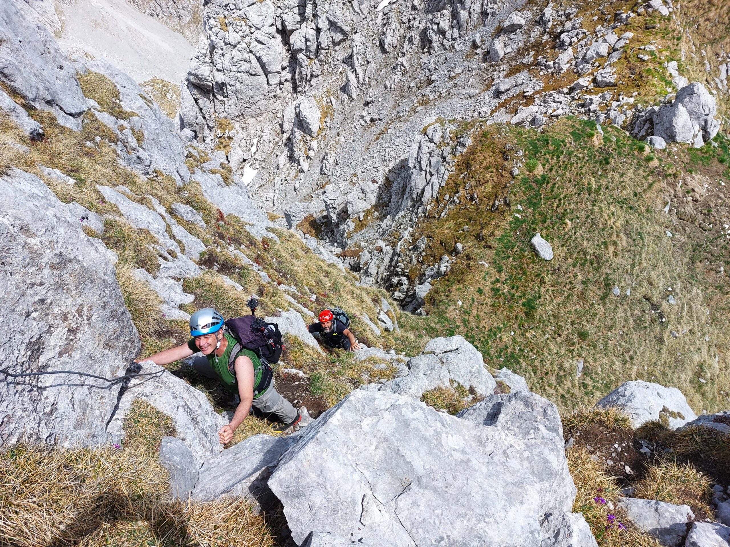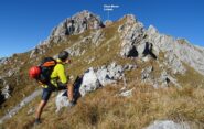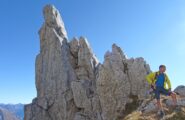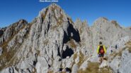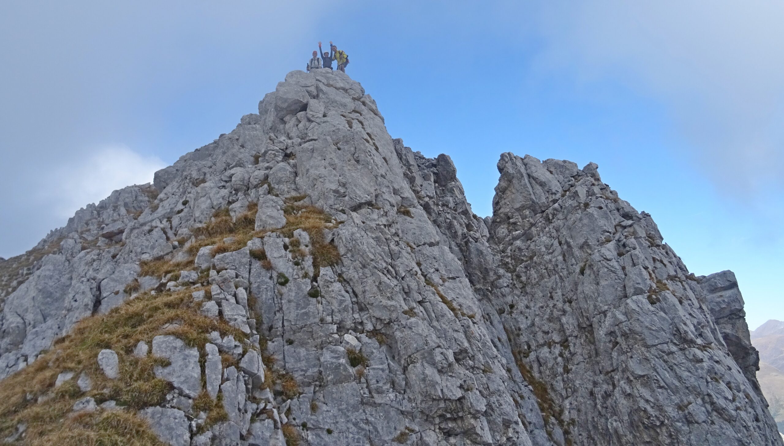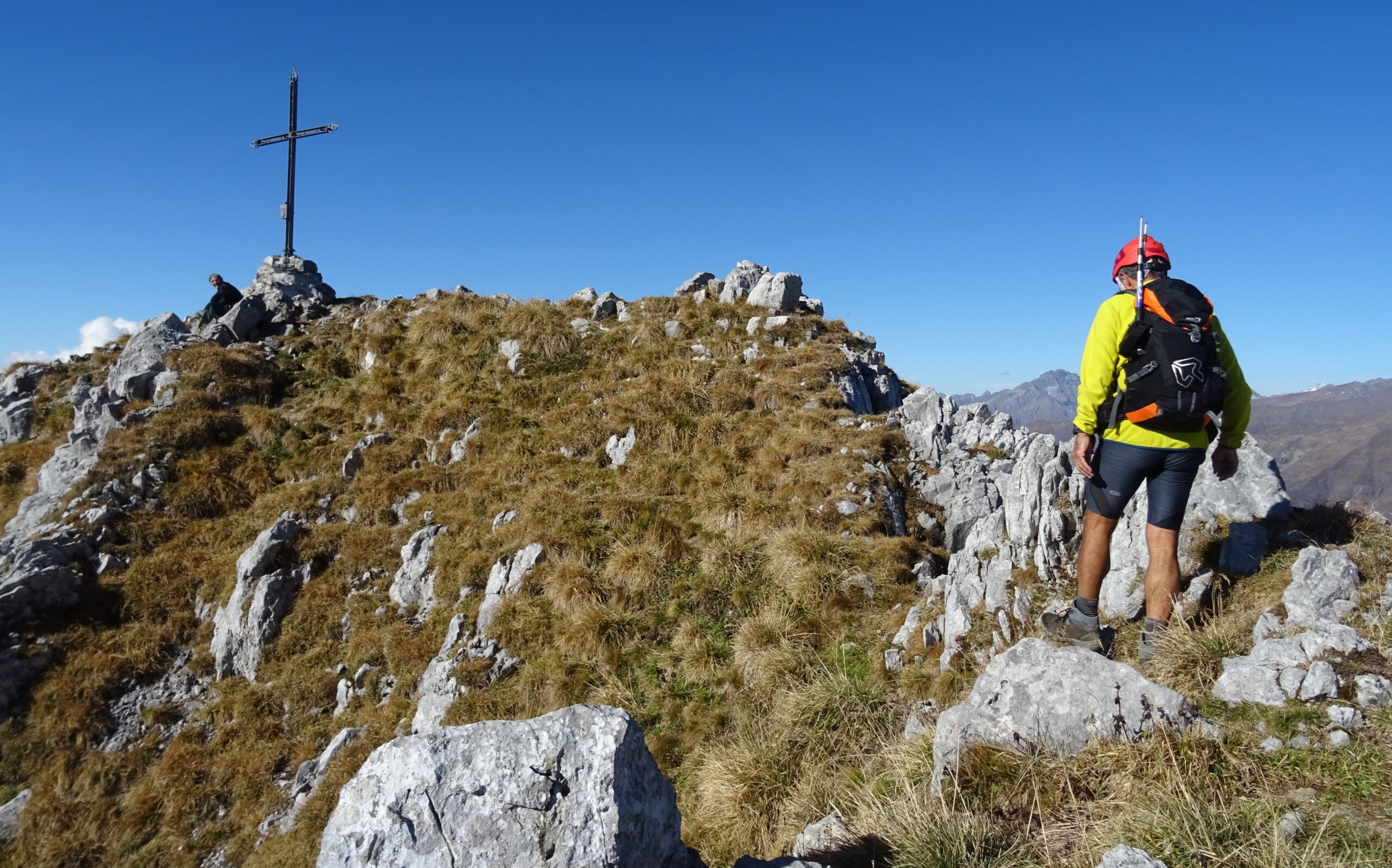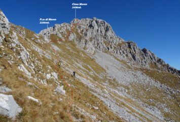 Si procede ora sulla bella cresta rocciosa seguendo dei labili segni di vernice rossa incominciando a metter mano sulle prime rocce fino ad arrivare al ripido tratto di circa 10mt. attrezzato con l’esile cordino metallico che da il nome (Via della Cordina), passato il tratto si procede sulla magnifica cresta su buona roccia calcarea restando prevalentemente sul lato sx e con vari sali e scendi a volte esposti che aggirano i tratti più difficili ma mai oltre il II°, si arriva poi ad un intaglio dove si sale delle placchette ben appigliate e tratti d’ erba sbucando all’anticima con ometto di pietre dove si traversa in breve verso la visibile croce di vetta di Cima Moren 2418mt.