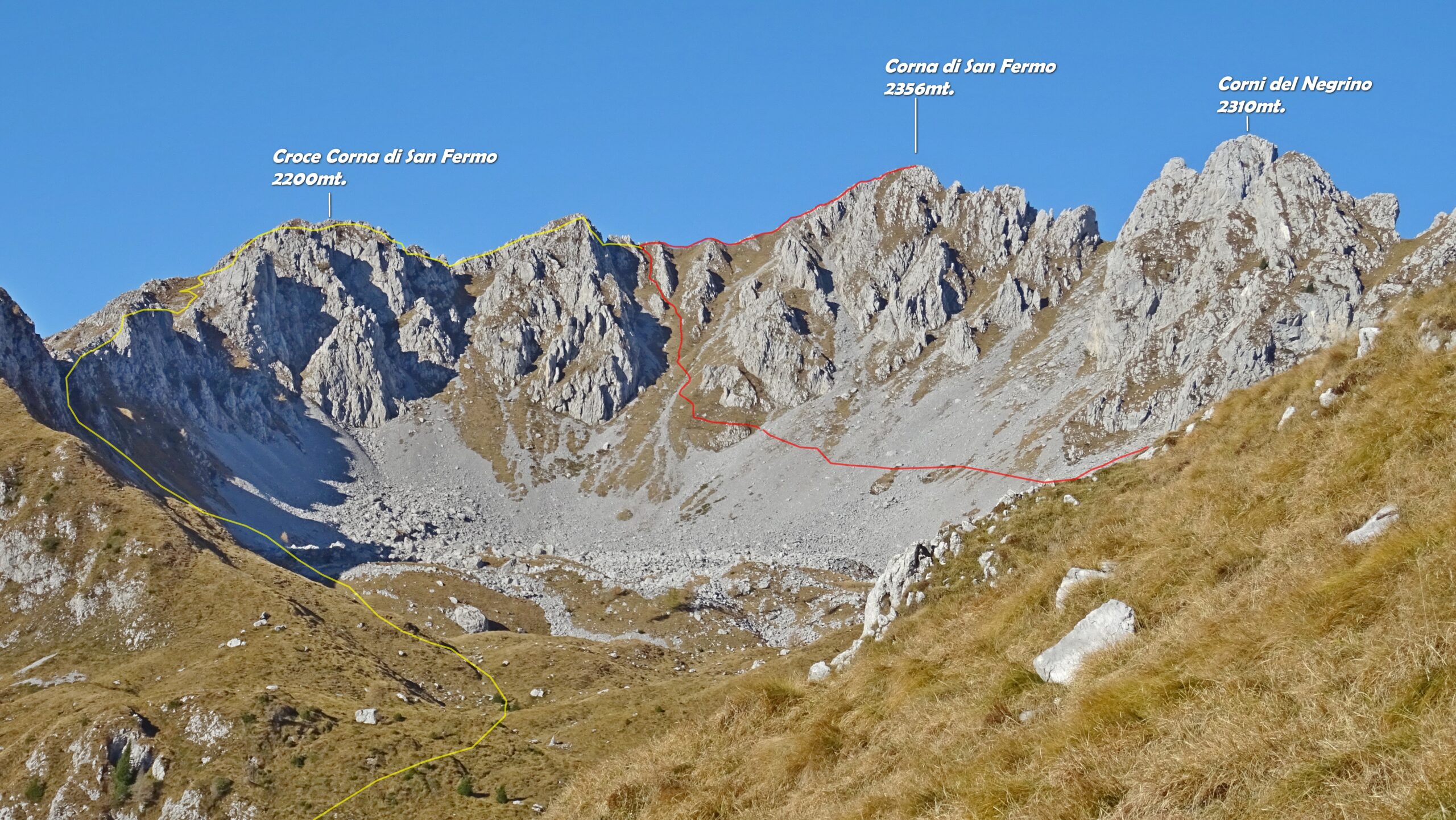 Si procede scendendo ora lungo la più facile via normale di Cima Moren seguendo i bolli che portano verso il P.so di Moren 2235mt., scendendo ancora un po’ si intercetta un labile sentierino che traversa sopra la Conca di Moren passando sotto il versante sud dei Corni del Negrino, lo si segue fino a portarsi sotto ad un imbocco di un canalone che si risale senza percorso obbligato fino a sbucare in cresta. Da qui si risale verso dx la cresta rocciosa che porta in breve alla selletta tra le due cime ravvicinate di eguale altezza della Corna di San Fermo 2356mt. quella a sx con ometto di pietre.