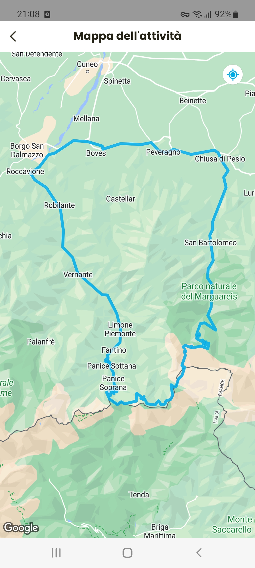 Arrivato alla Capanna (chiusa) ho fatto un break (4 h e 15′ da Chiusa Pesio), poi ho proseguito raggiungendo la Via del Sale, ma a differenza di quanto proposto da questo itinerario mi sono diretto al Col di Tenda. Da qui lungo rientro a valle su asfalto, raggiungendo Chiusa Pesio via Boves-Peveragno.