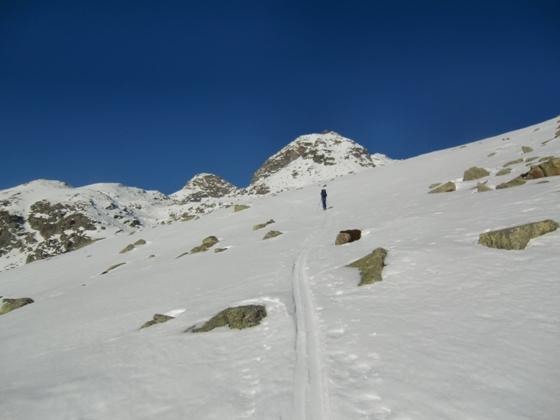L’obbiettivo era il Corno Bianco, invece chi era davanti a me ha seguito un gruppo di quattro forti scialpinisti che hanno tracciato la salita qui.