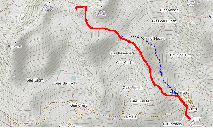 Da Rivotti per strada salire all’Alpe Invers, nel Vallone di Vercellina. Puntare ora verso NO in direzione della dorsale che scende dal Monte Morion. Risalirla fin sotto il Morion, quindi aggirarlo alla base e raggiungere le conce fra il M. Morion e il Morion Piccolo. Da qui raggiungere il col Morion e salire in vetta seguendo la cresta NE. Non vi sono difficoltà particolari fino a dove la cresta spiana. Qui si deve superare una spaccatura verticale alta 2m (II) o aggirarla lato sud per placche (II). Ritornati sul filo pianeggiante lo si segue fino all’anticima (ometto). Il punto culminante (triangolo del CAI di Rivarolo) è circa 20 m più a ovest e richiede qualche passaggio su roccia, non difficile ma esposto e non banale con ramponi e scarponi da scialpinismo.