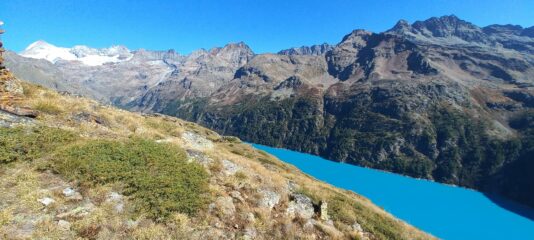 Siamo partiti dalla diga di place Moulin direzione sentiero n°7 . Il sentiero sale deciso, costeggiando la monorotaia e i paravalanghe. Si incontrano durante il percorso delle vecchie bergerie fino ad arrivare a delle case ristrutturate molto bene dove è possibile fare rifornimento di acqua fresca. Il primo lago che s’incontra è quello lungo, successivamente quello morto con colori dal verde al blu. Siamo poi scesi verso il lago più piccolo (2839mt) attraversando tutta la pietraia, cosa sconsigliata. Non contenti siamo scesi al lago della testa e come ultimo il lago del monte della Rossa, scendendo da un canale ripido che a nostro avviso solo per questo tratto è da considerarsi una EE. Proseguendo il sentiero ci si collega ad anello verso le case nuove. Splendido paesaggio e la diga vista dall’ alto ha un colore verde giada a dir poco stupendo.