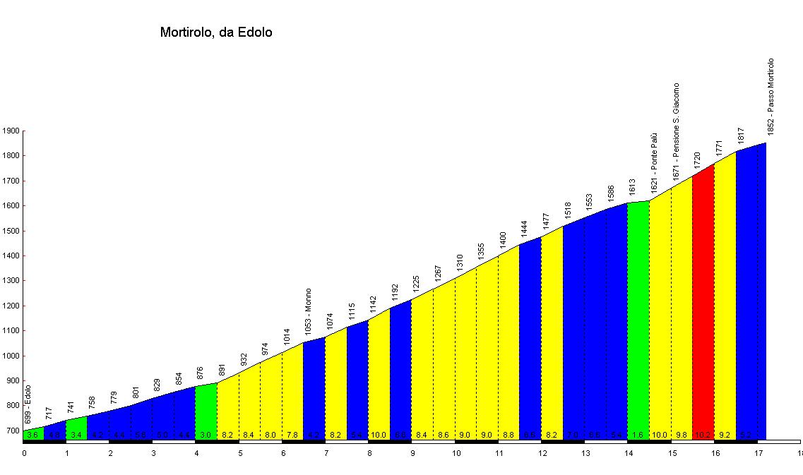La salita dal bivio per Monno al Passo del Mortirolo è di 12,7 km per un dislivello di 1125 mt. La pendenza media è del 7,6% e quella max è del 16%.