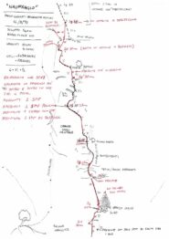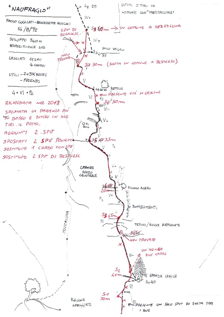 La via percorre il grande scudo centrale restando più o meno sul suo limite destro; alla sua sx passano gli spit vecchi del "Besalesc" chiaramente visibili.