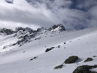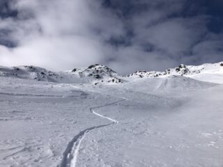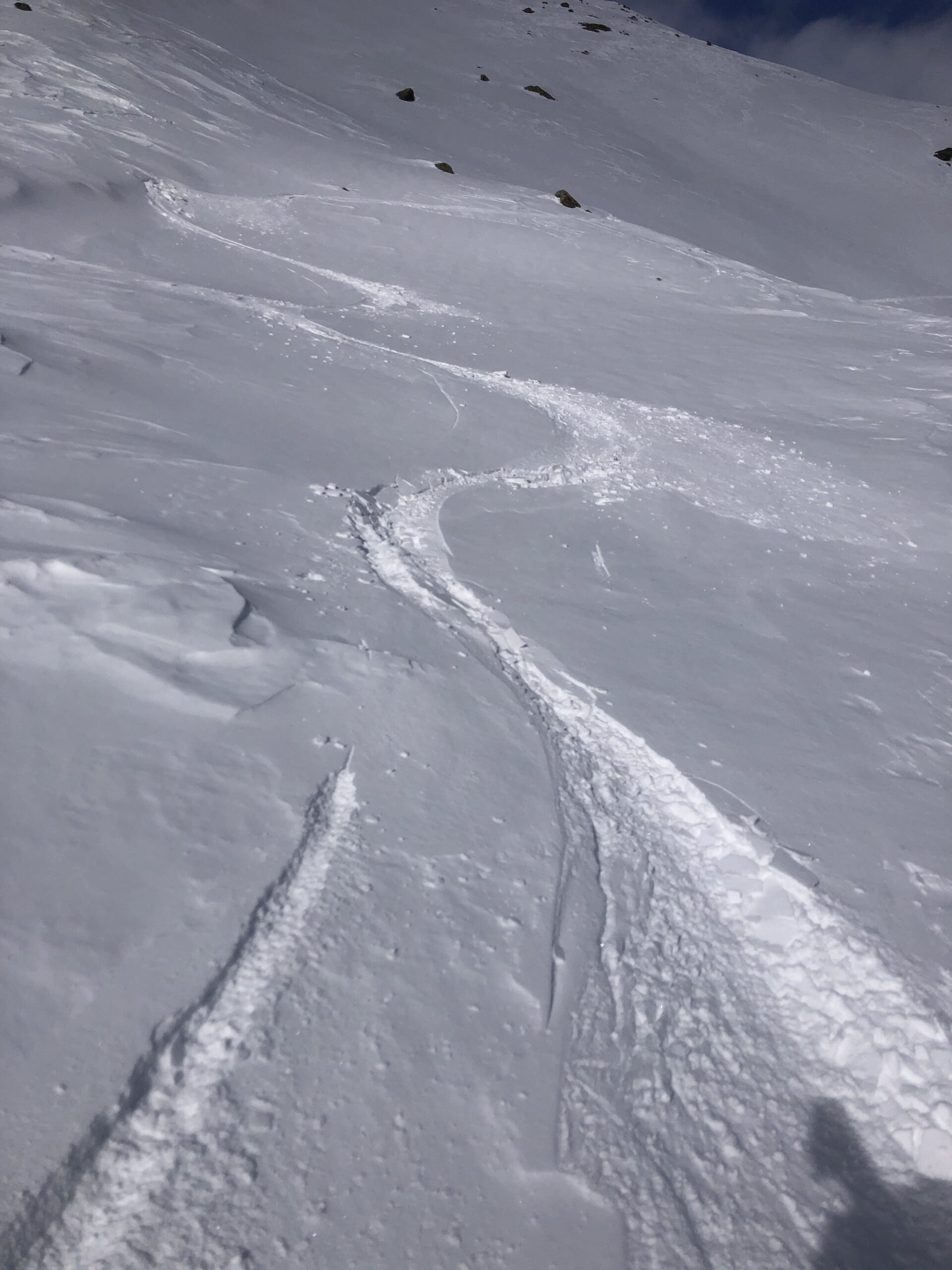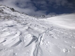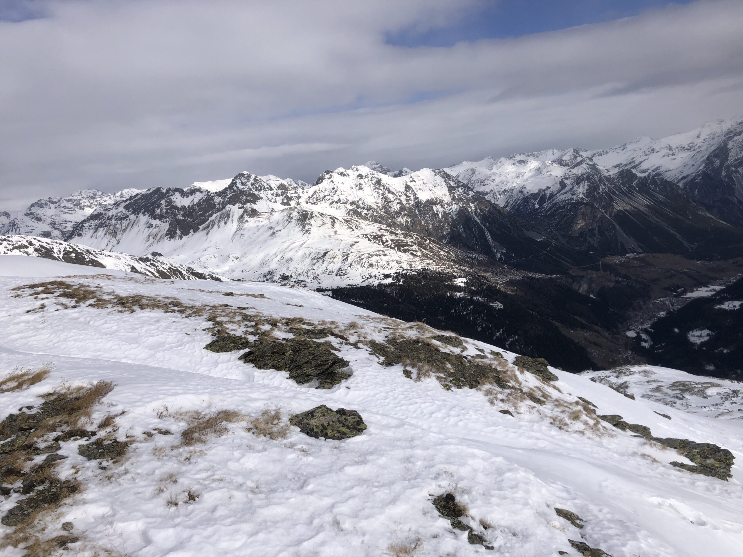 Il vento ha fatto macelli. Sastrugi enormi, lastroni duri e neve riportata si alternano continuamente. La salita nel bosco è a tratti ghiacciata. Lo scavallamento del pendio/canale che porta alla parte superiore è su neve riportata e ghiacciata, occorre salire a piedi e scendere con attenzione. Salito prima al Sattaron e poi al Motta Grande. Discesa di pura sopravvivenza, 5 curve decenti. Un po’ di vento solo in cima. Nessuno in giro.