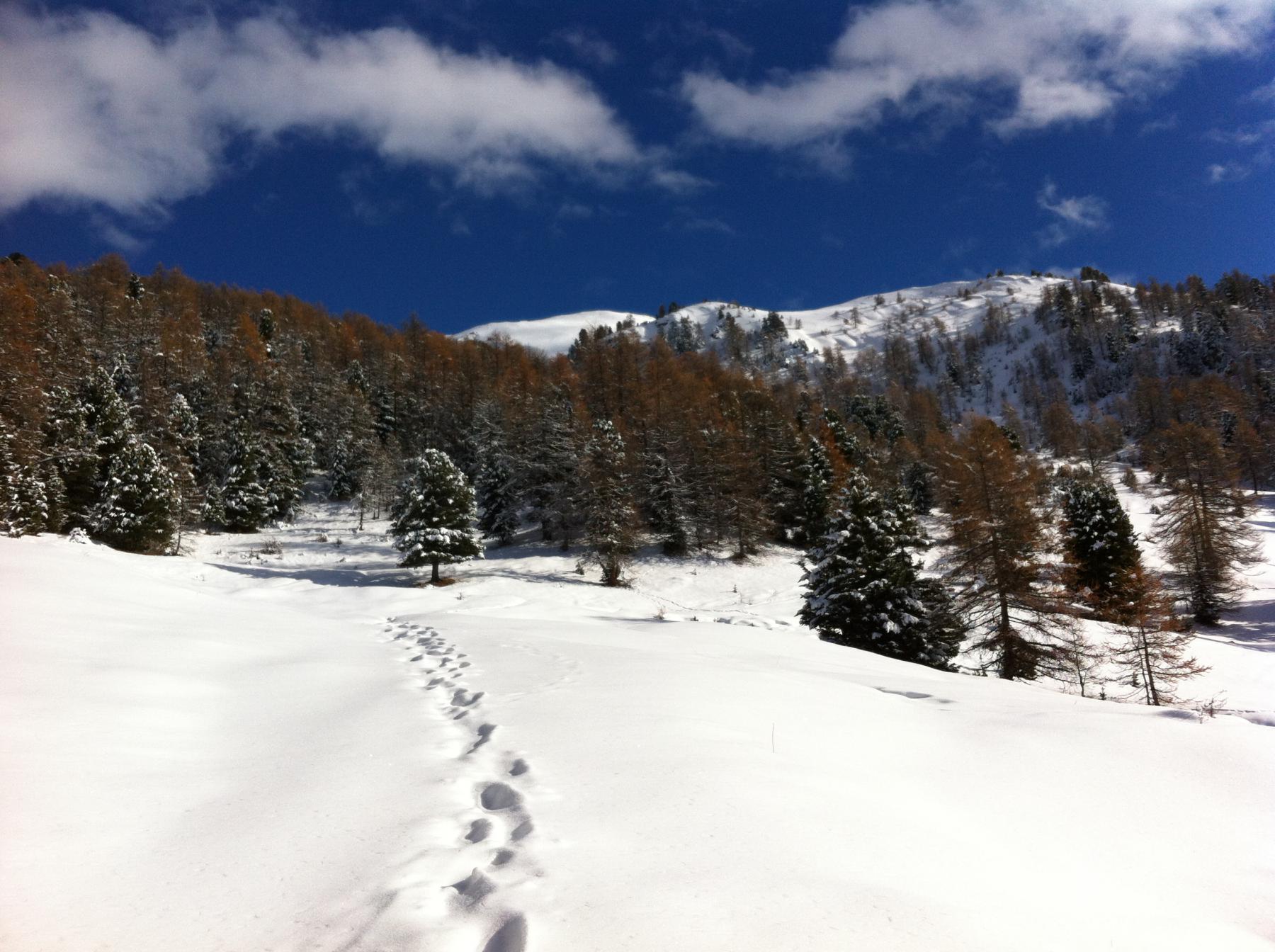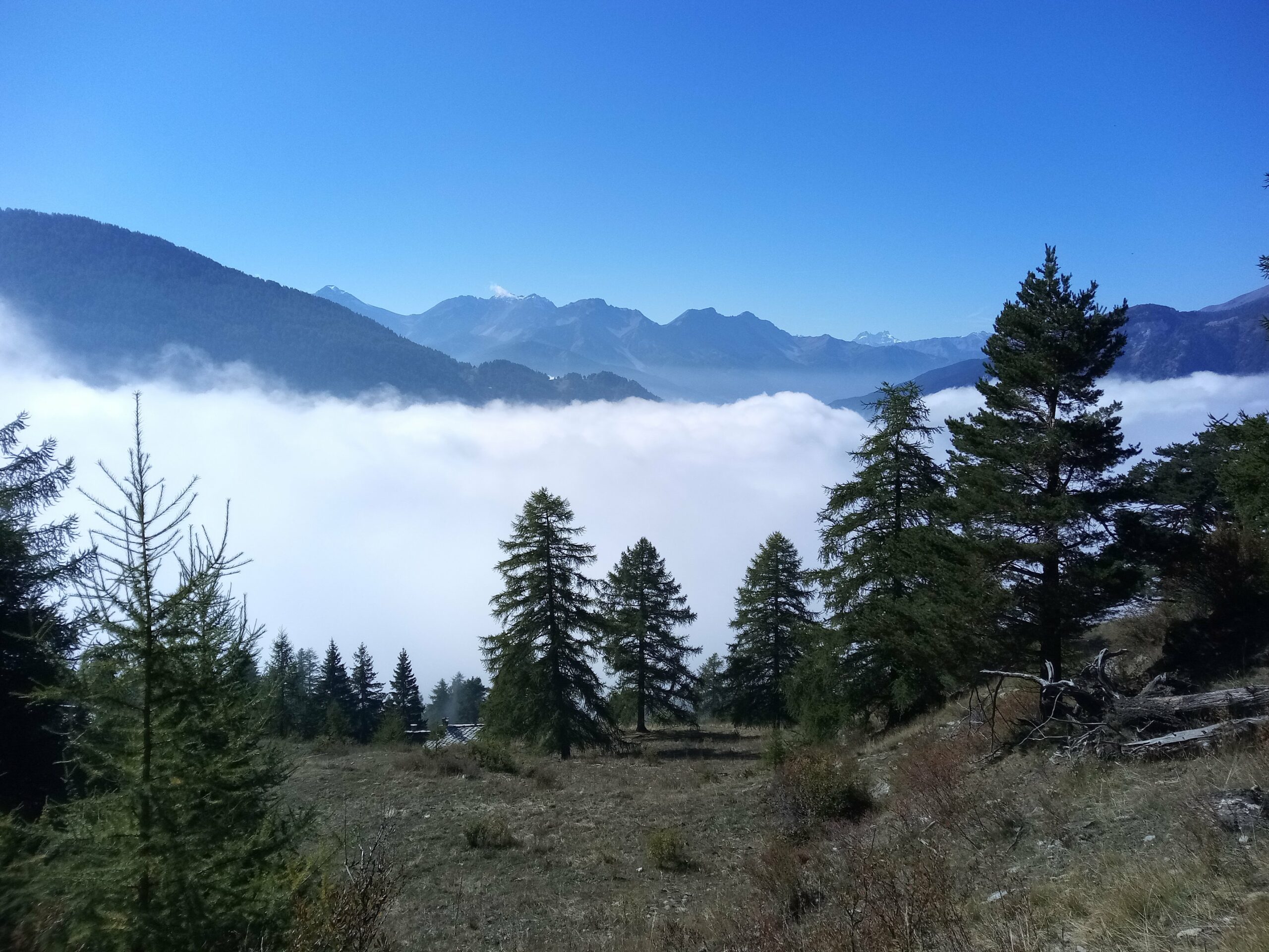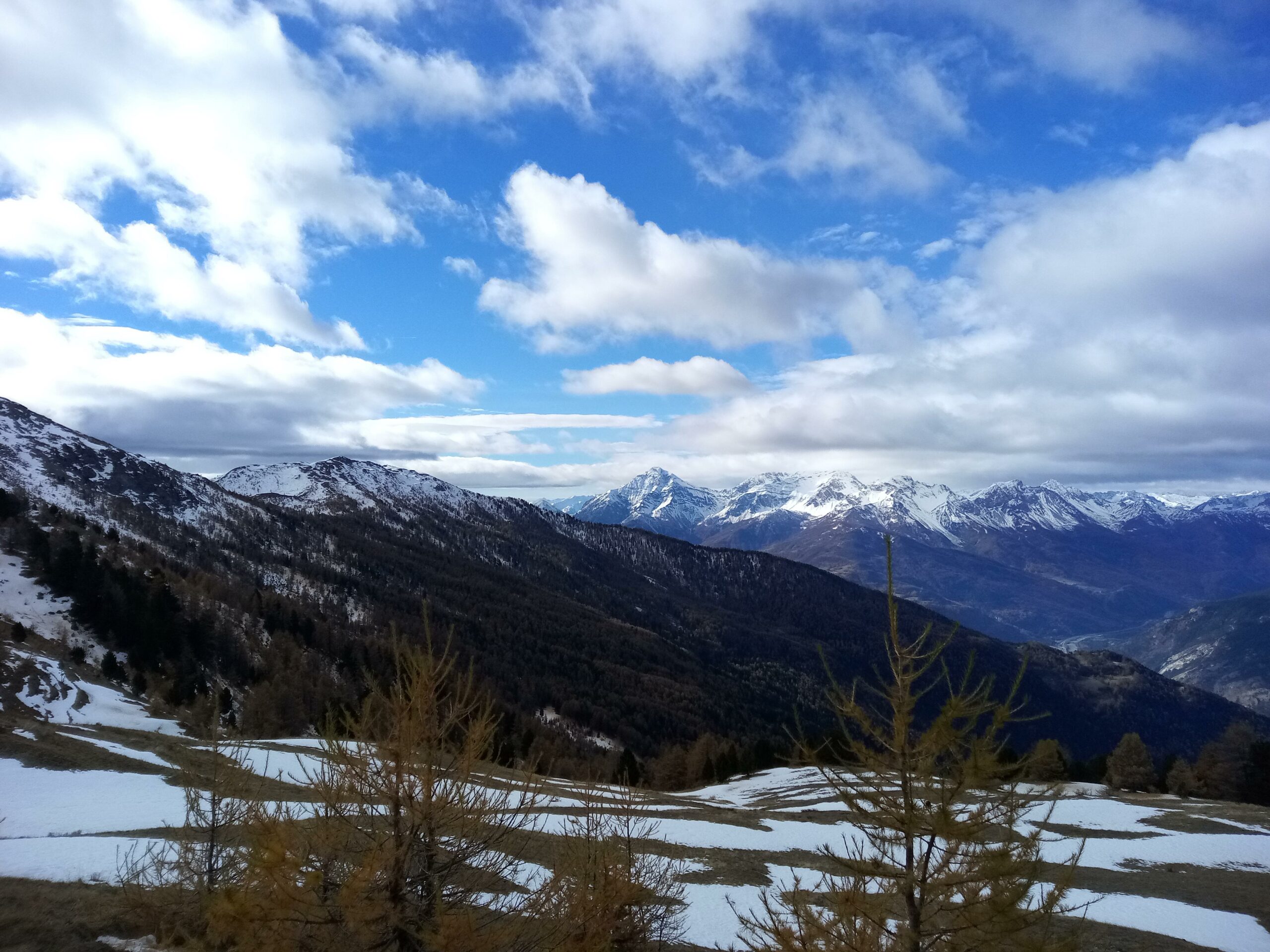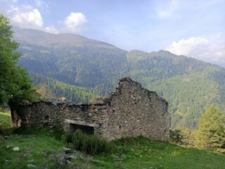 Seguendo il sentiero sempre ben segnalato si superano in successione le gr.Pineis (1346 m) e le gr.d’Himbert (1394 m) arrivando così alla grande borgata Montagne Seu dove è stata realizzata dal parco una casa rifugio (1771 m). Il gta piega a questo punto verso sinistra e continua a salire nel bosco intervallato da bellissime radure.