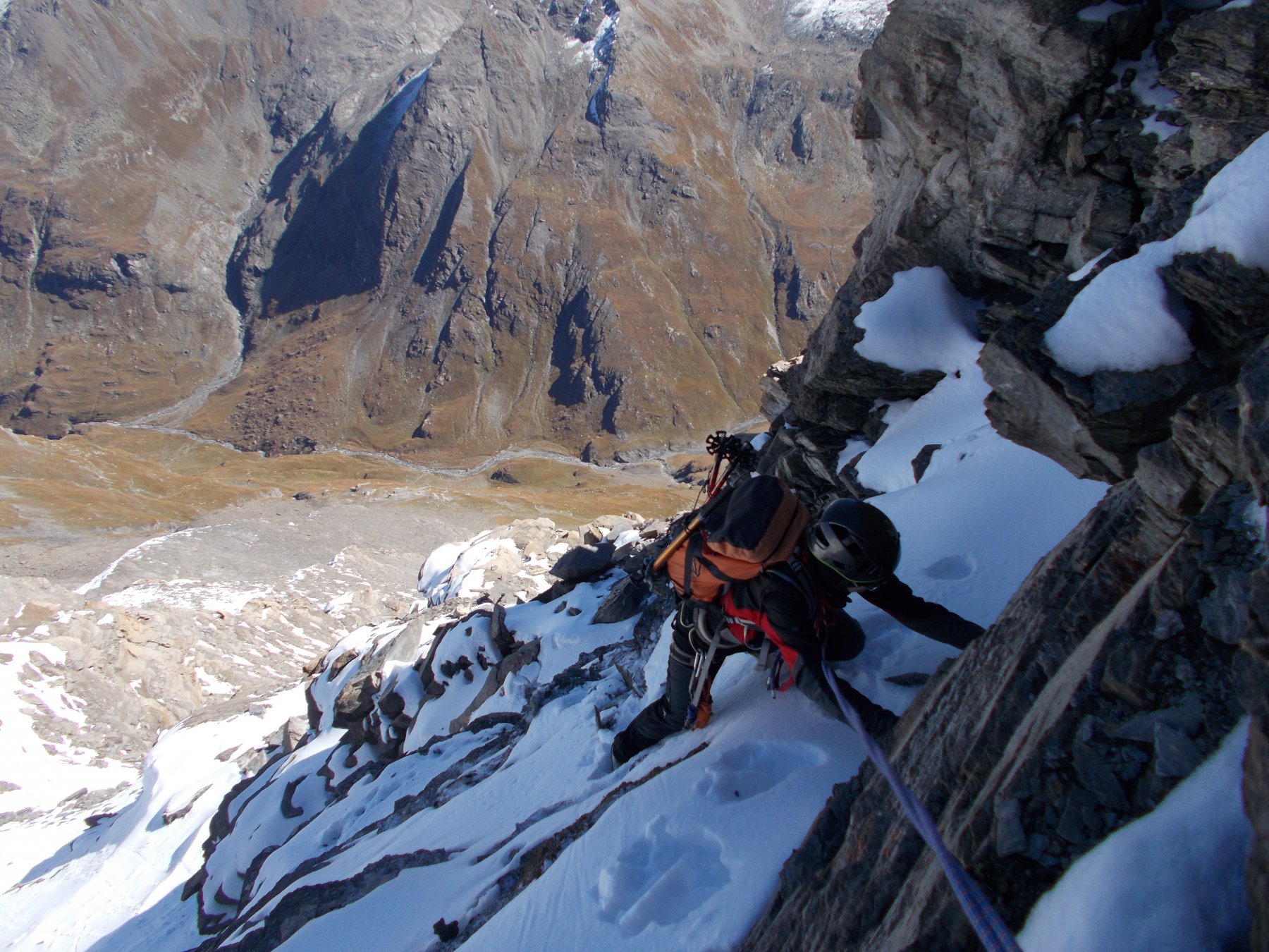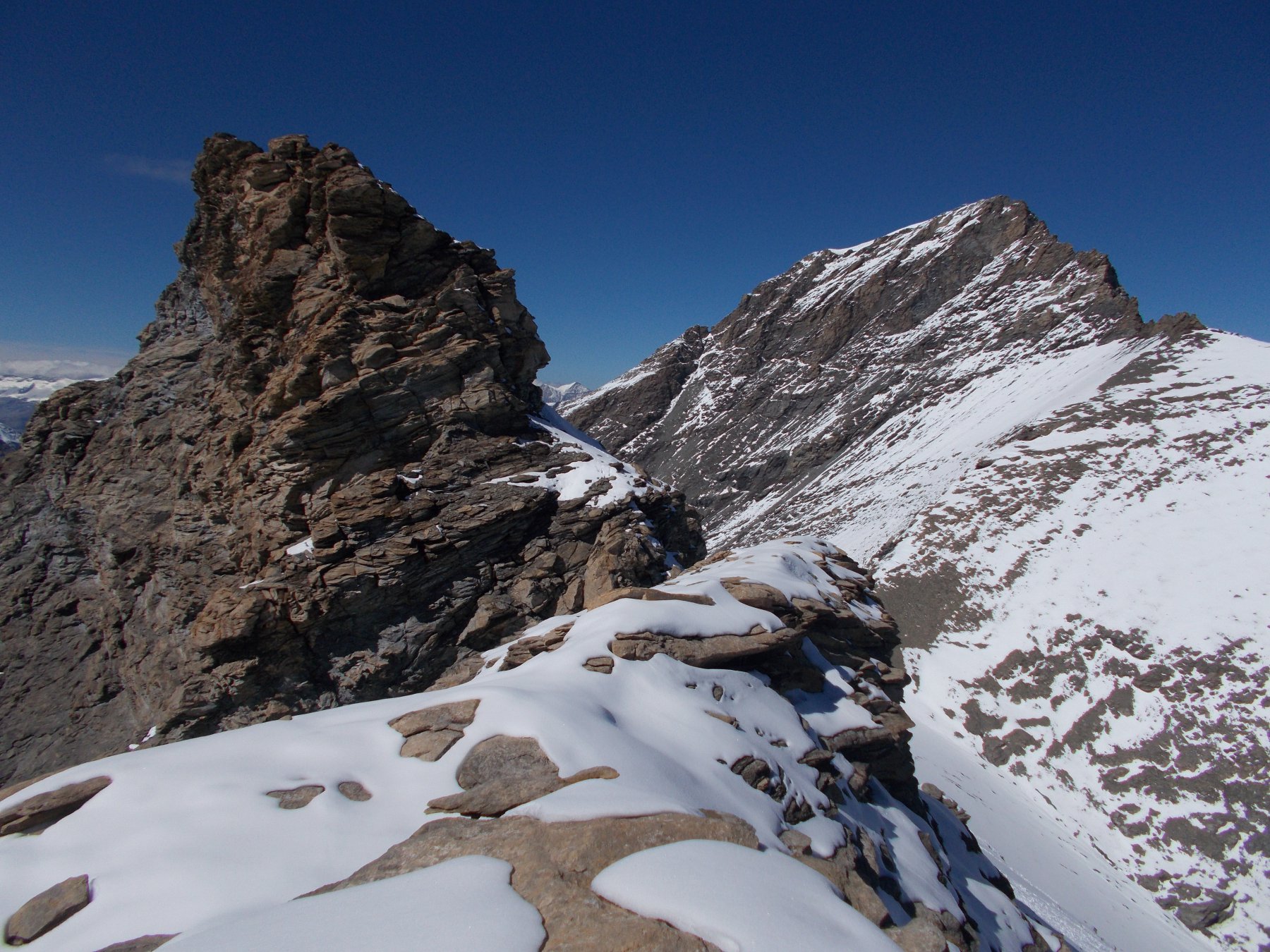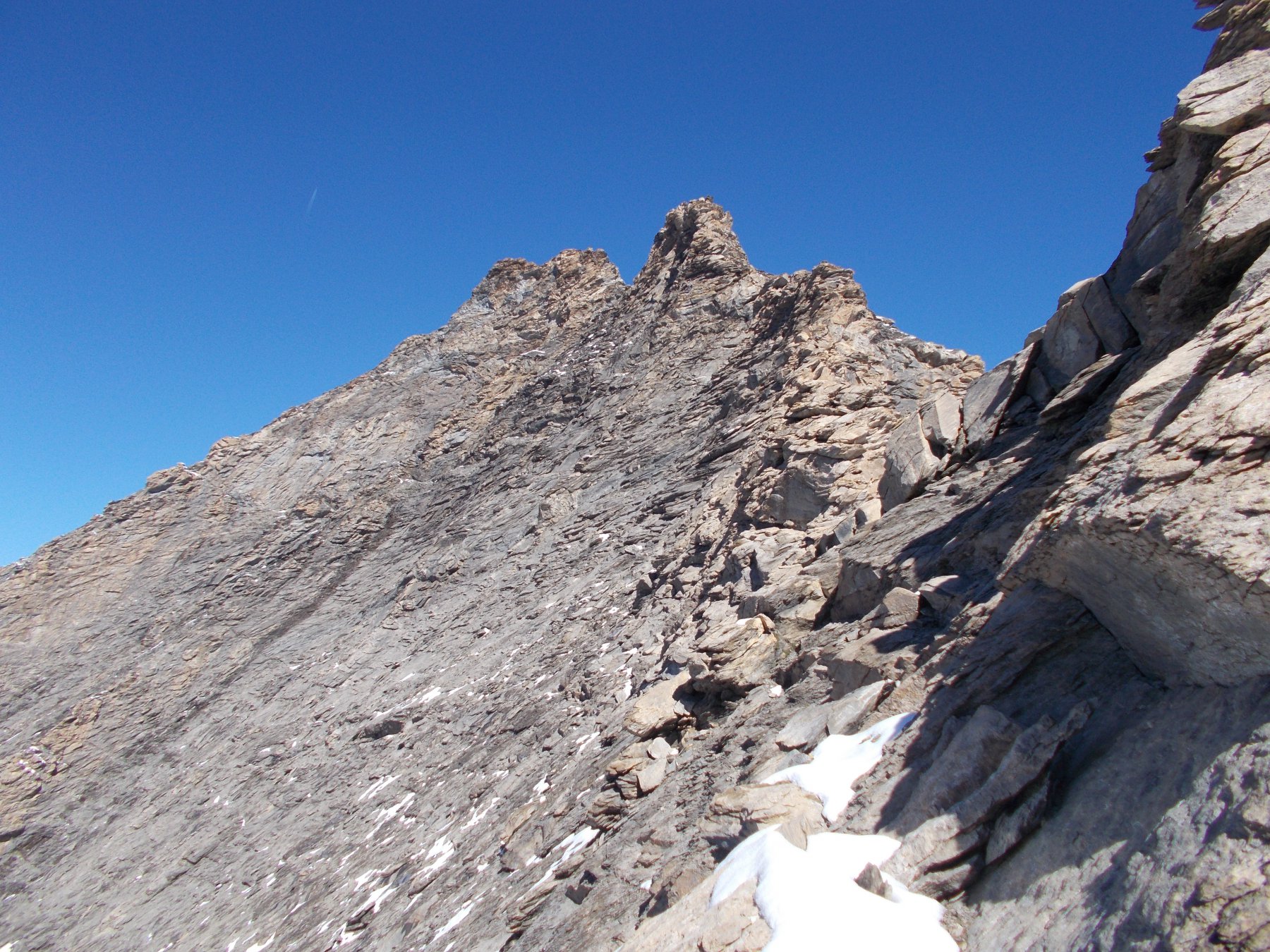 La cresta alla sx guardando si presenta di getto subito ostica . In realta’ a parte l’esposizione considerevole e costante da ambo ai lati, non offre passaggi oltre il III+ stando sul filo. La roccia di cattiva qualita’ in generale si presenta migliore quanto piu’ ci si attiene a rimanere sul filo. ( 2h.-2.30 dal colle).