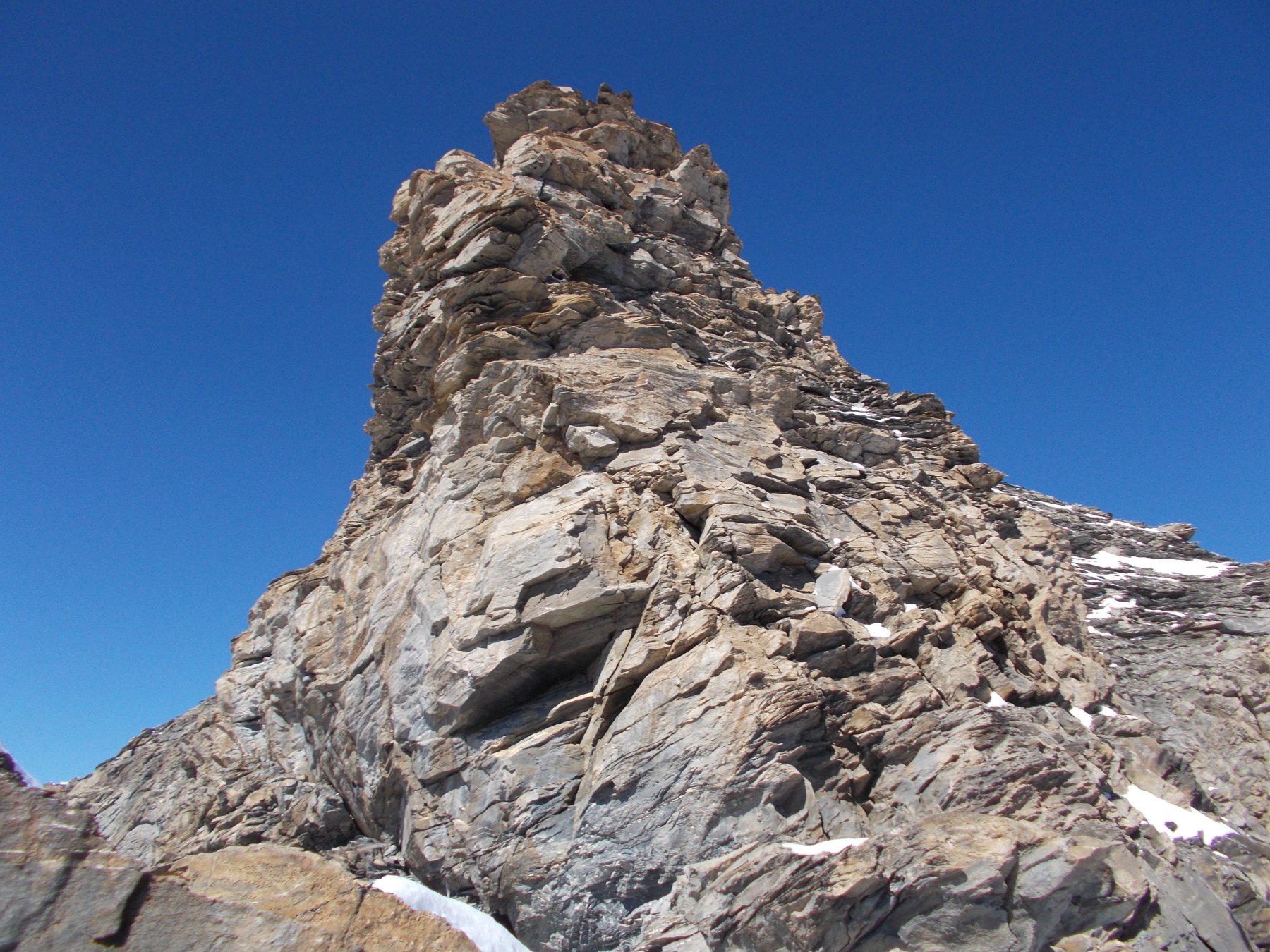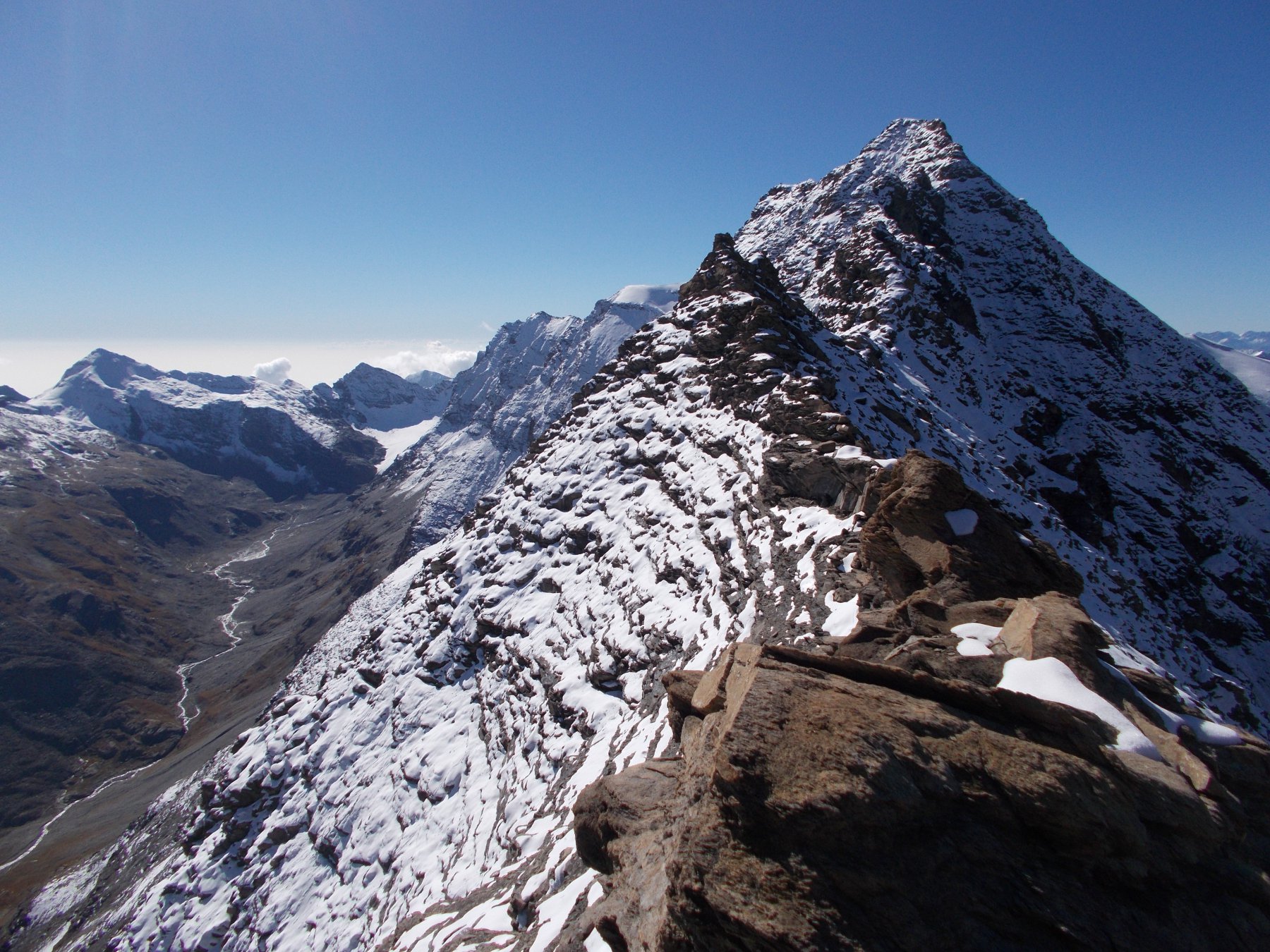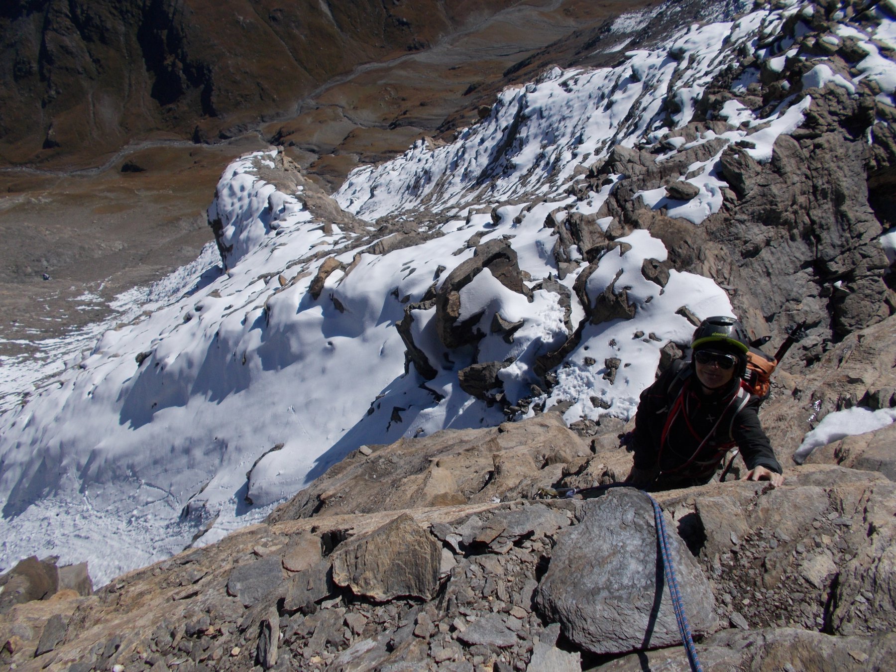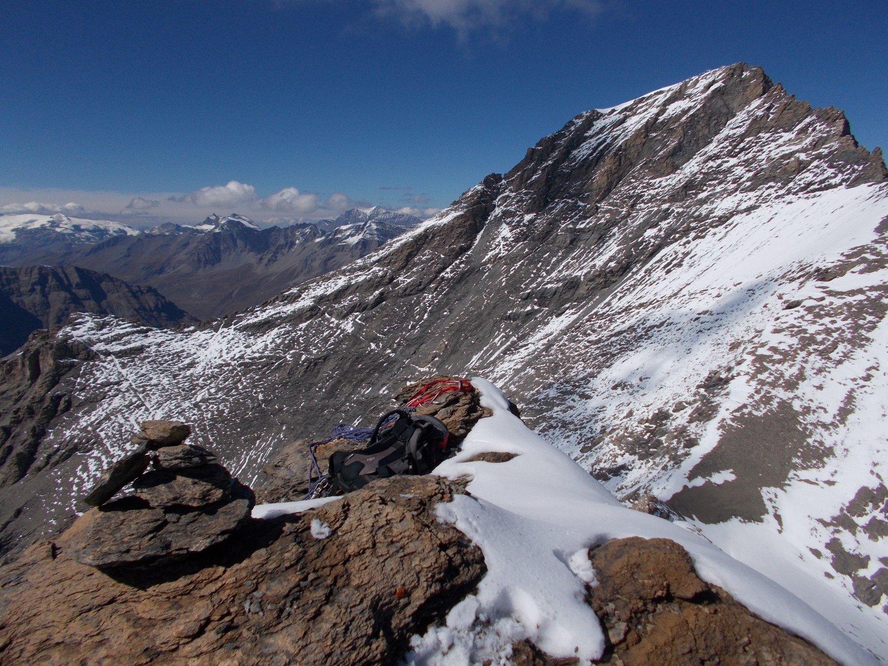 La cresta alla sx guardando si presenta di getto subito ostica . In realta’ a parte l’esposizione considerevole e costante da ambo ai lati, non offre passaggi oltre il III+ stando sul filo. La roccia di cattiva qualita’ in generale si presenta migliore quanto piu’ ci si attiene a rimanere sul filo. ( 2h.-2.30 dal colle).