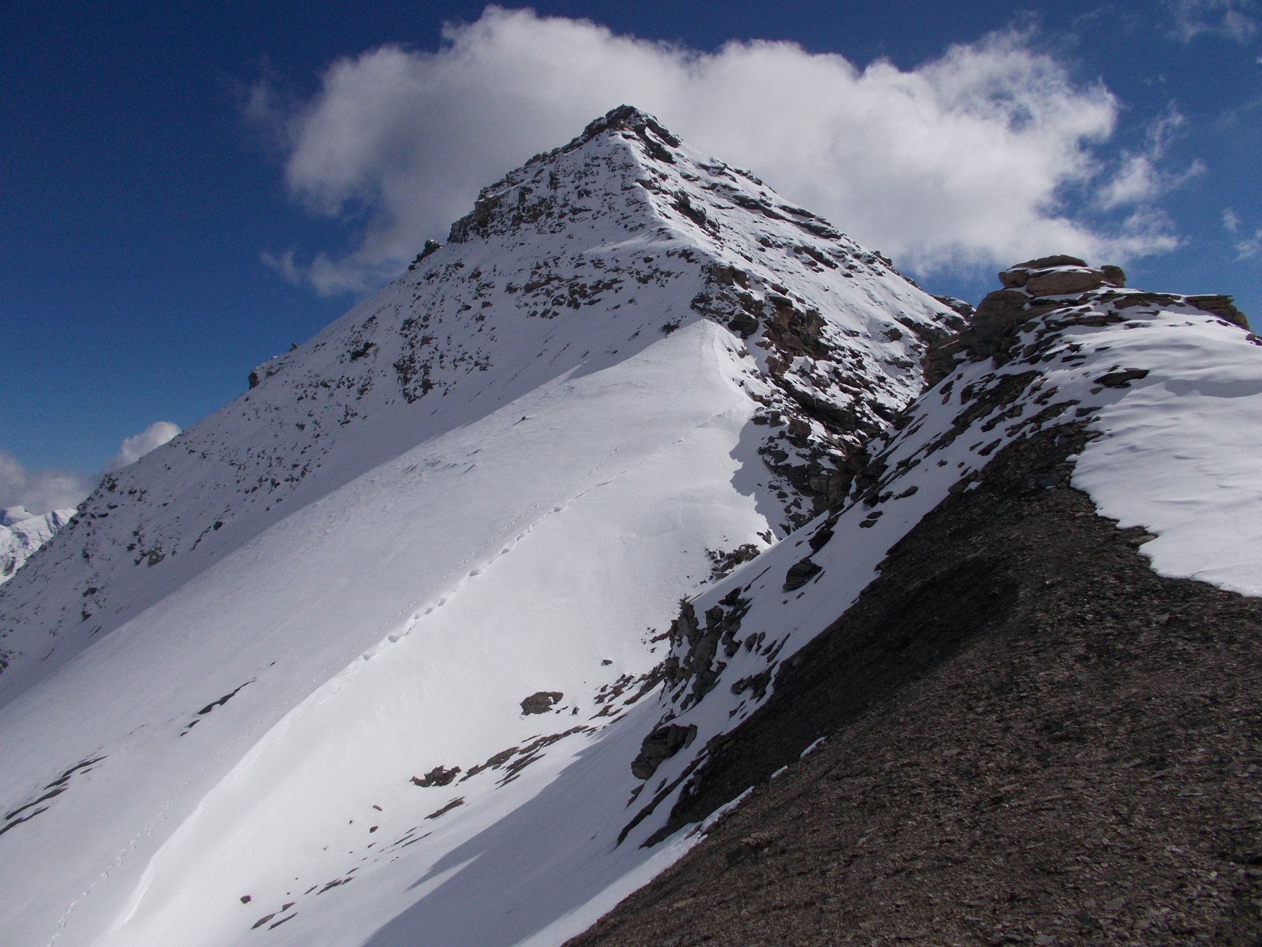 Discesa per la cresta nord al colle dell’Ouille Mouta. Non presenta difficolta’ di sorta ,ma puo’ essere innevata e tale da richiedere comunque attenzione. In due punti la cresta obbliga a scendere faccia a monte con un minimo di sicurezza al seguito specie in presenza di neve.