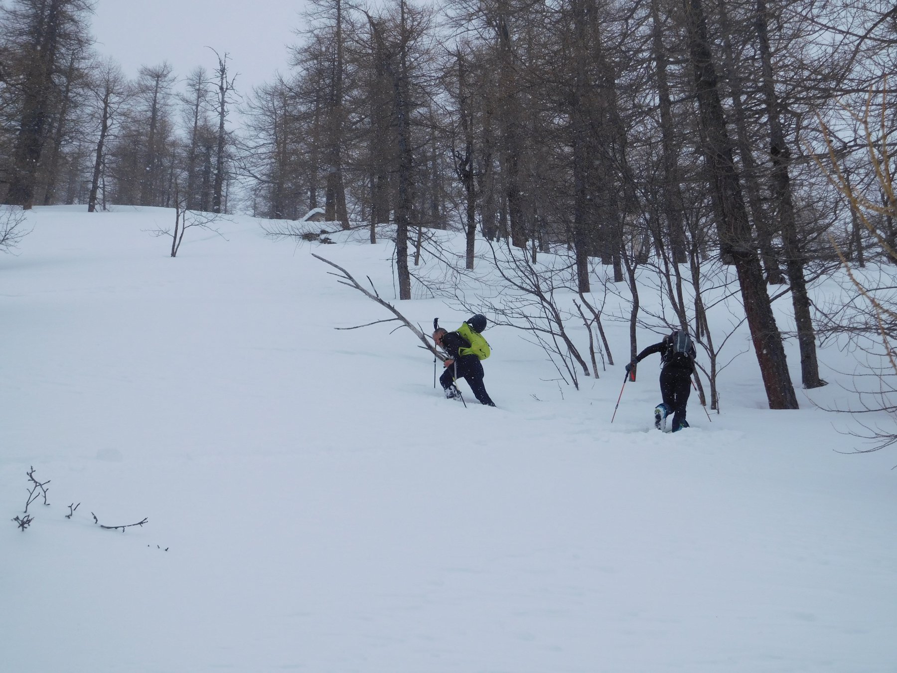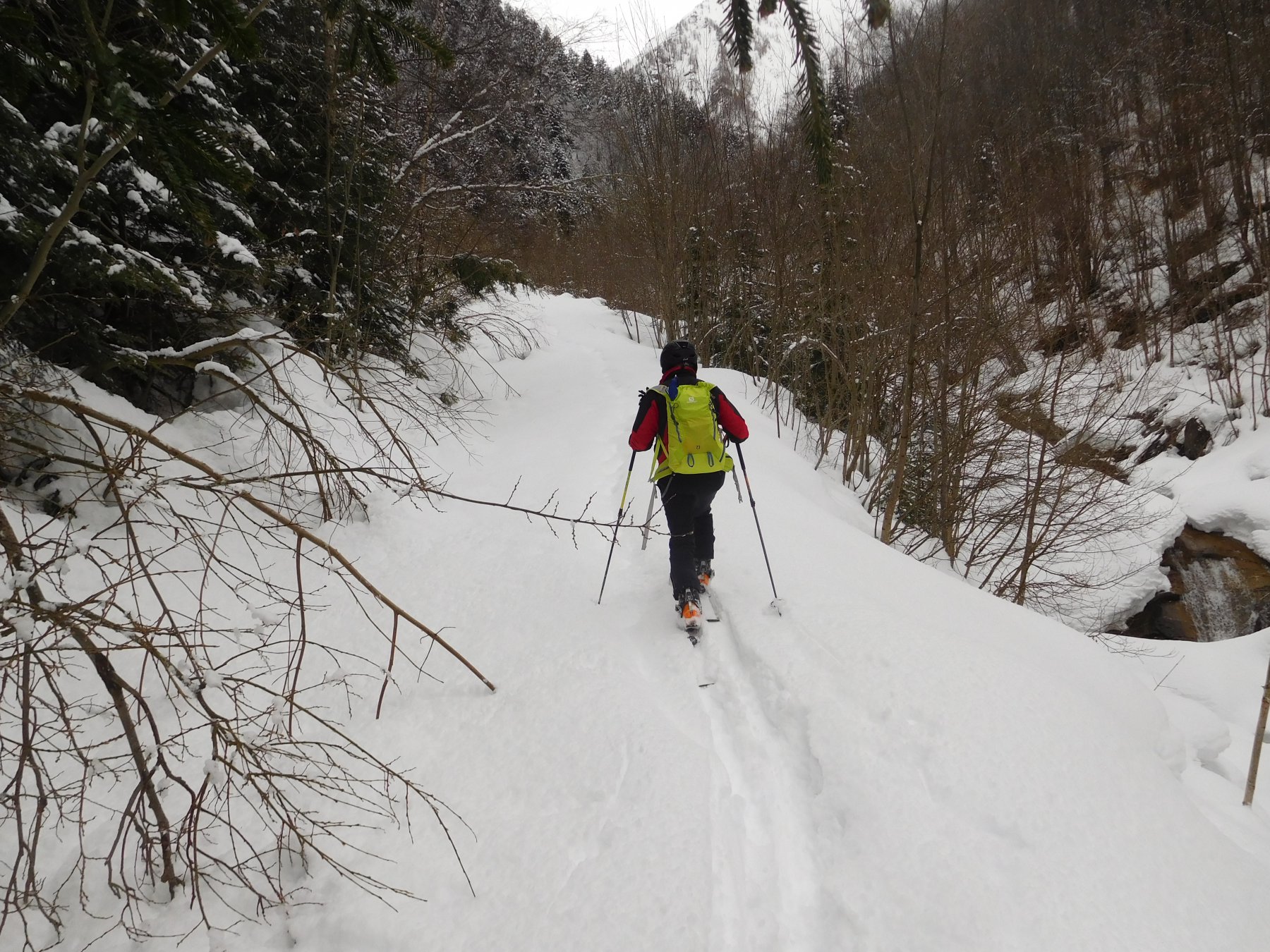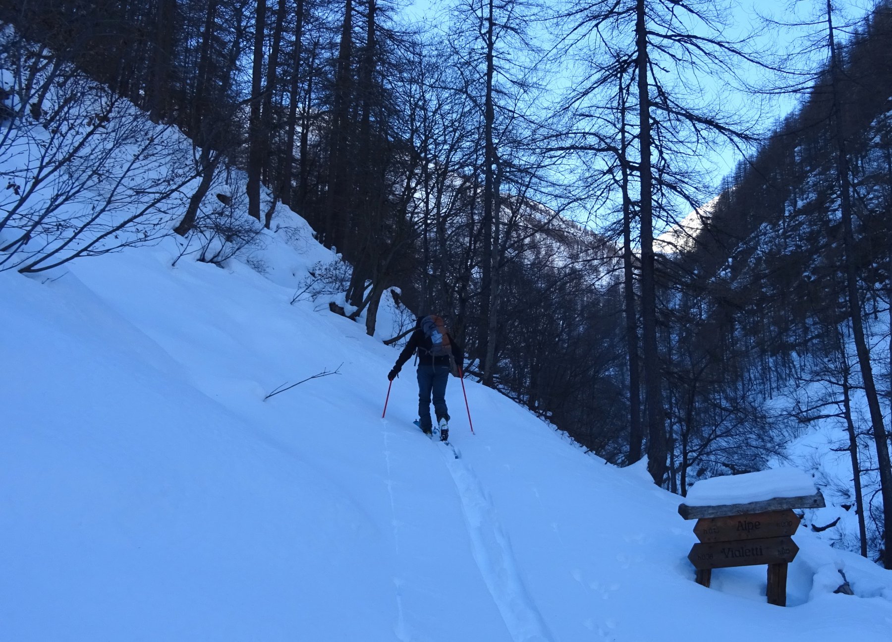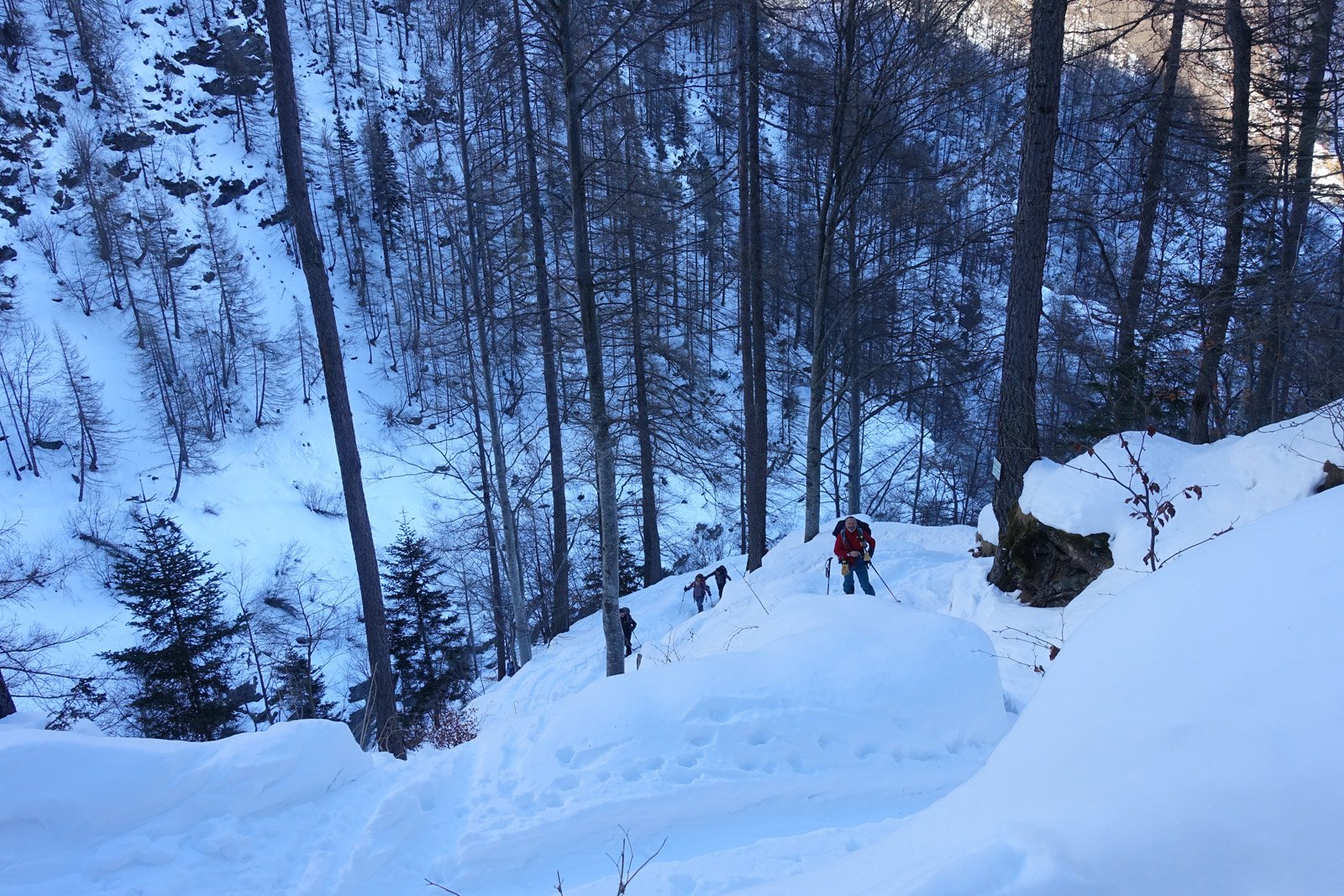 Quando la strada diventa sentiero e si inerpica nel bosco, a ripidi tornanti, la progressione si fa più difficoltosa (specie in discesa in caso di innevamento limitato).
