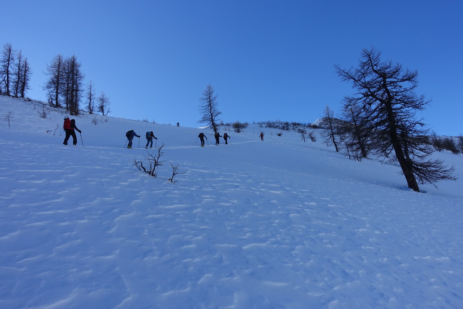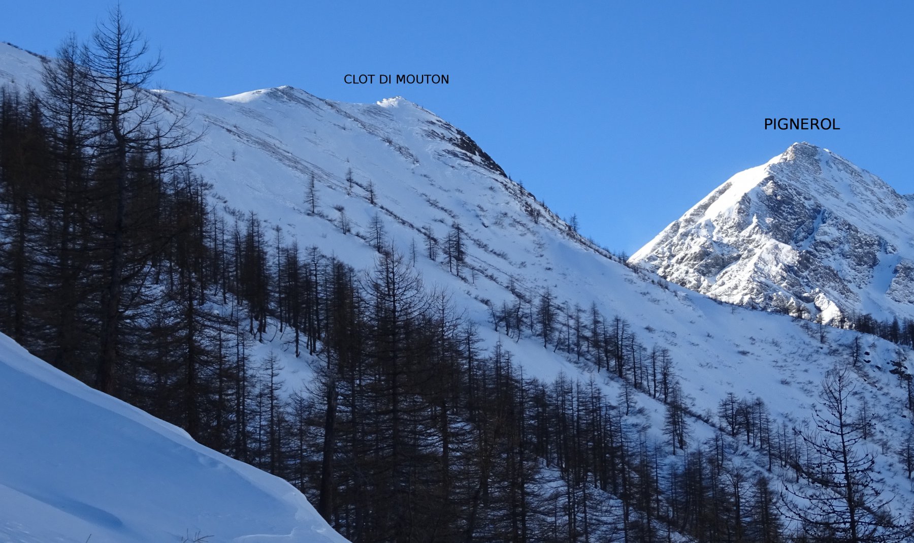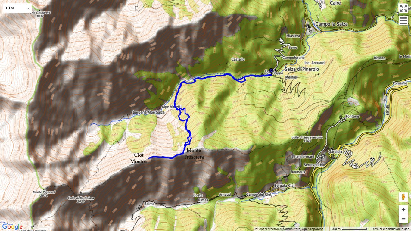 Oltrepassata la strettoia segue un tratto in falsopiano che conduce al bivio per le Alpi di Salza e Vialetti, seguire a sinistra e continuare nel bosco, senza percorso obbligato, fino ad un pianoro con bosco molto rado. Dal pianoro procedere sempre “tendendo a sinistra” e prendendo rapidamente quota in direzione della punta Trousciera, la più bassa visibile dal pianoro, mentre la più alta alla sua destra è il Clot di Moutun, dietro la quale è ben visibile la piramide del Pignerol.