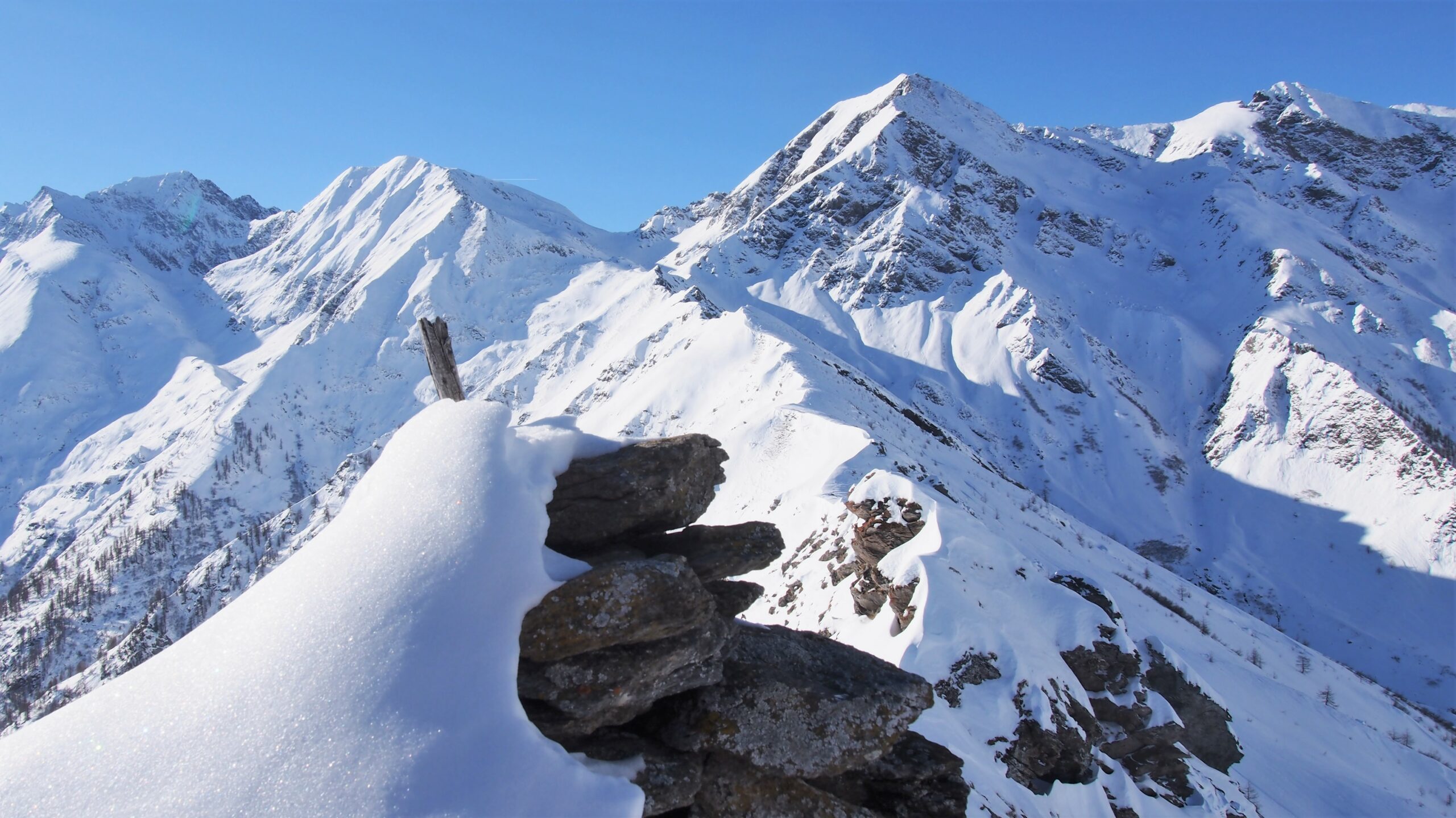 Dorsale con neve sempre intonsa, solo un breve tratto con pietre a cui porre attenzione, infine a piedi sulla breve crestina finale.