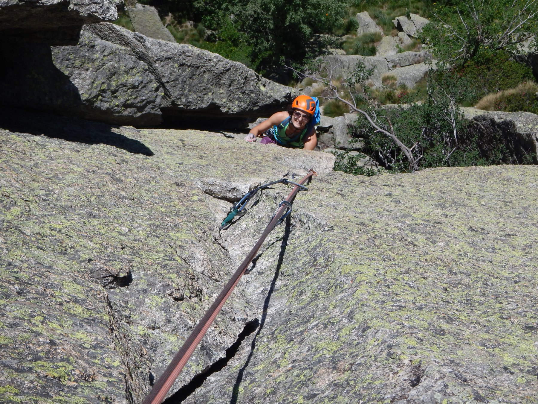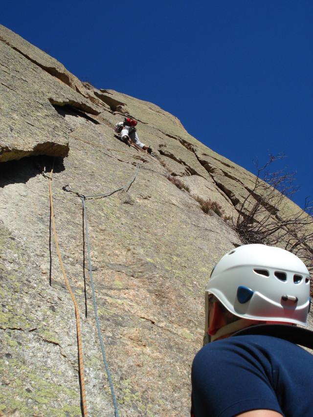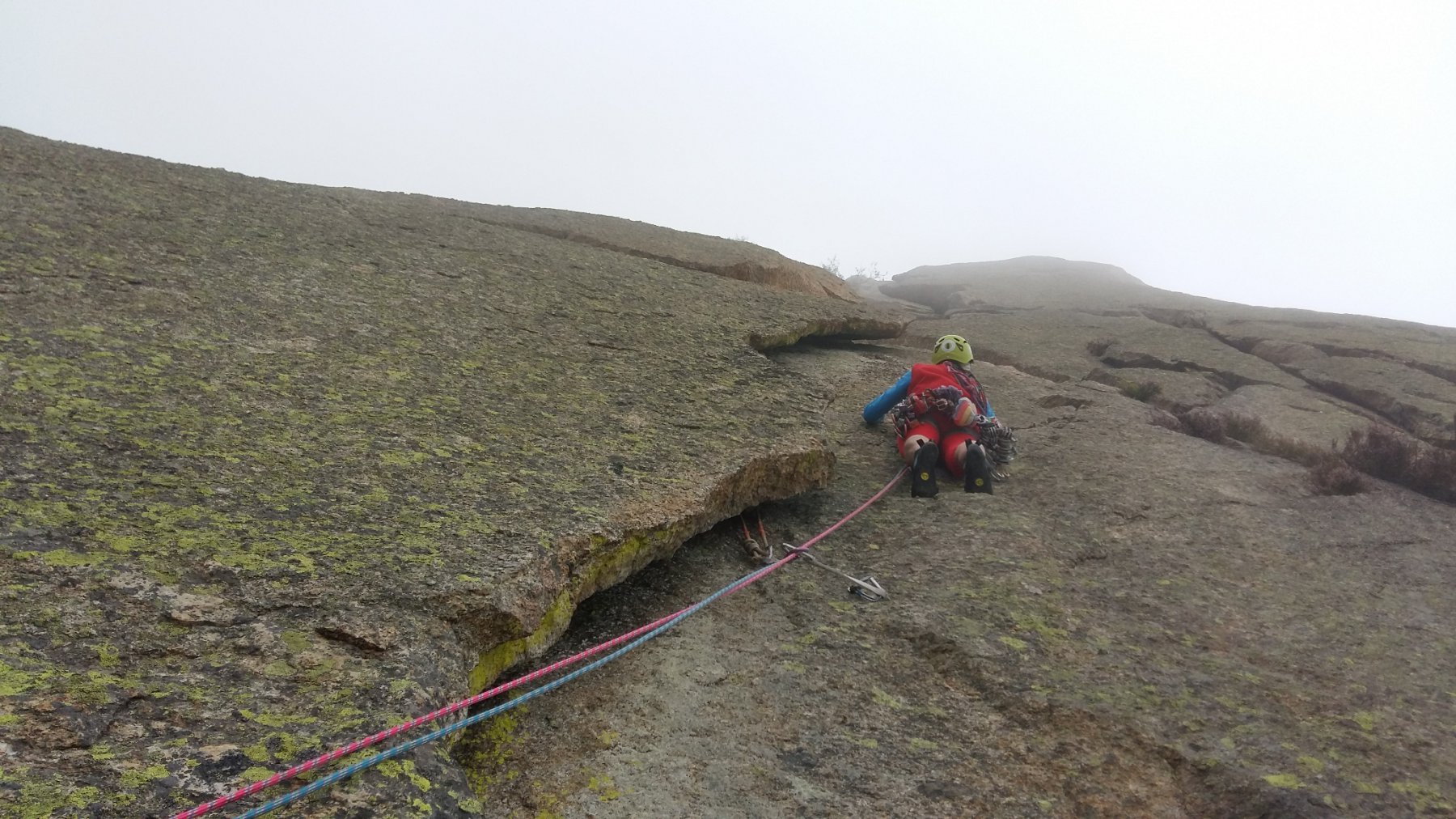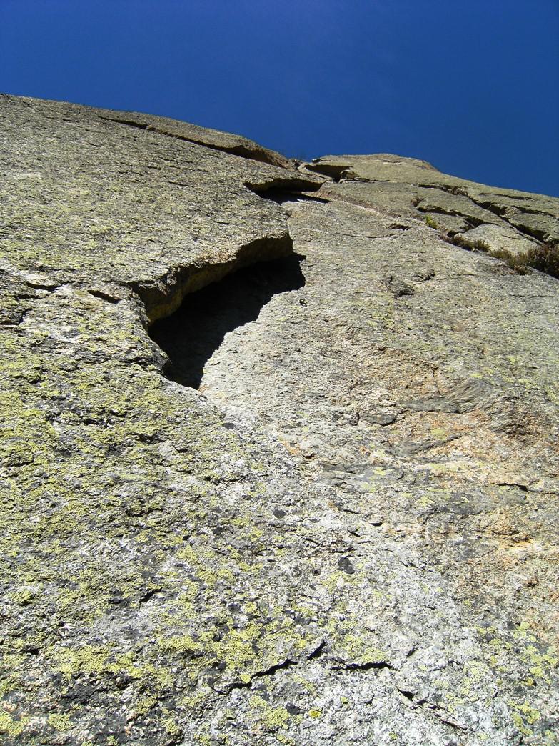 - L2 – 5c, 25m Verticalmente lungo la lastra in opposizione (spit), quindi verso destra sfruttando una fessurina (chiodo). Ancora per fessura (un po’ più larga, bong) fino al camino.