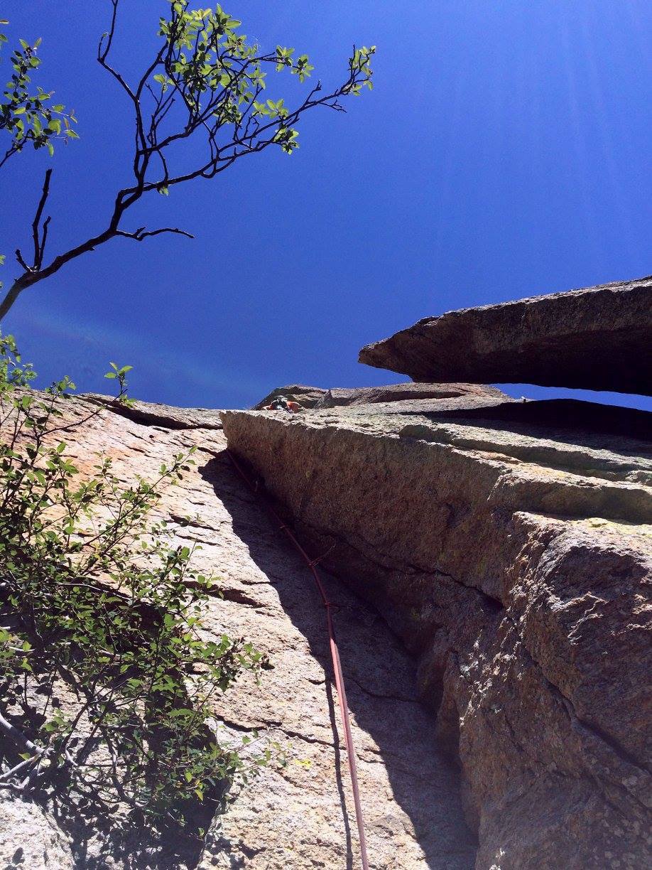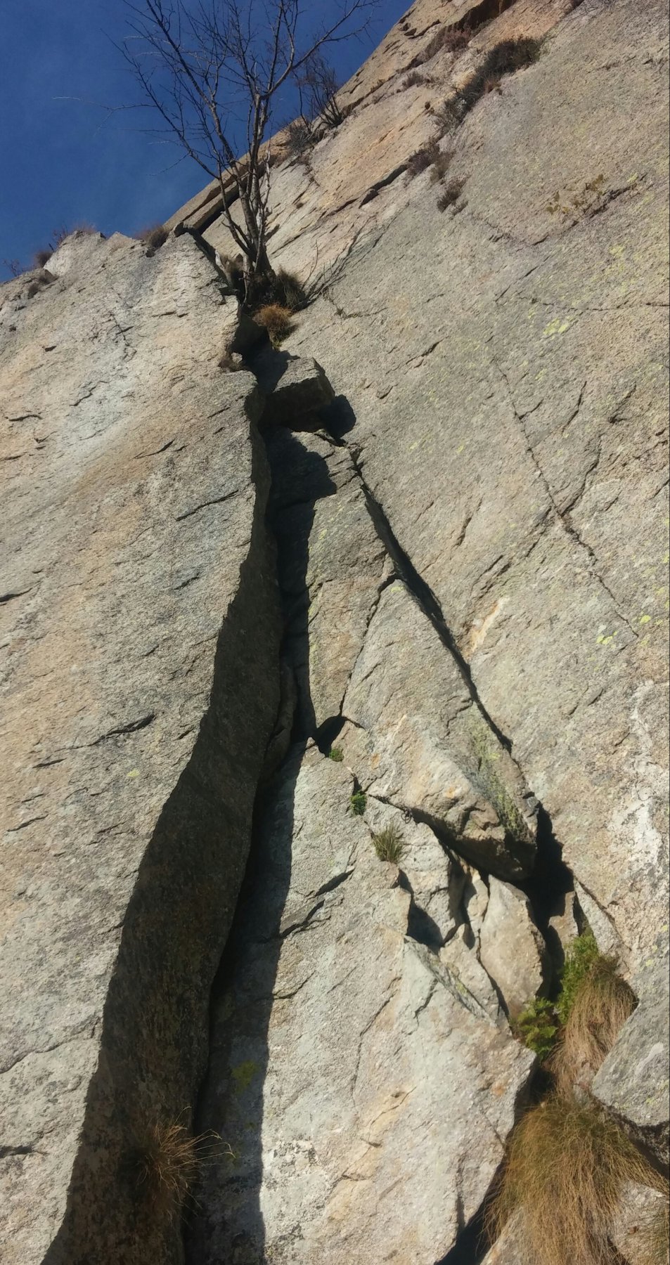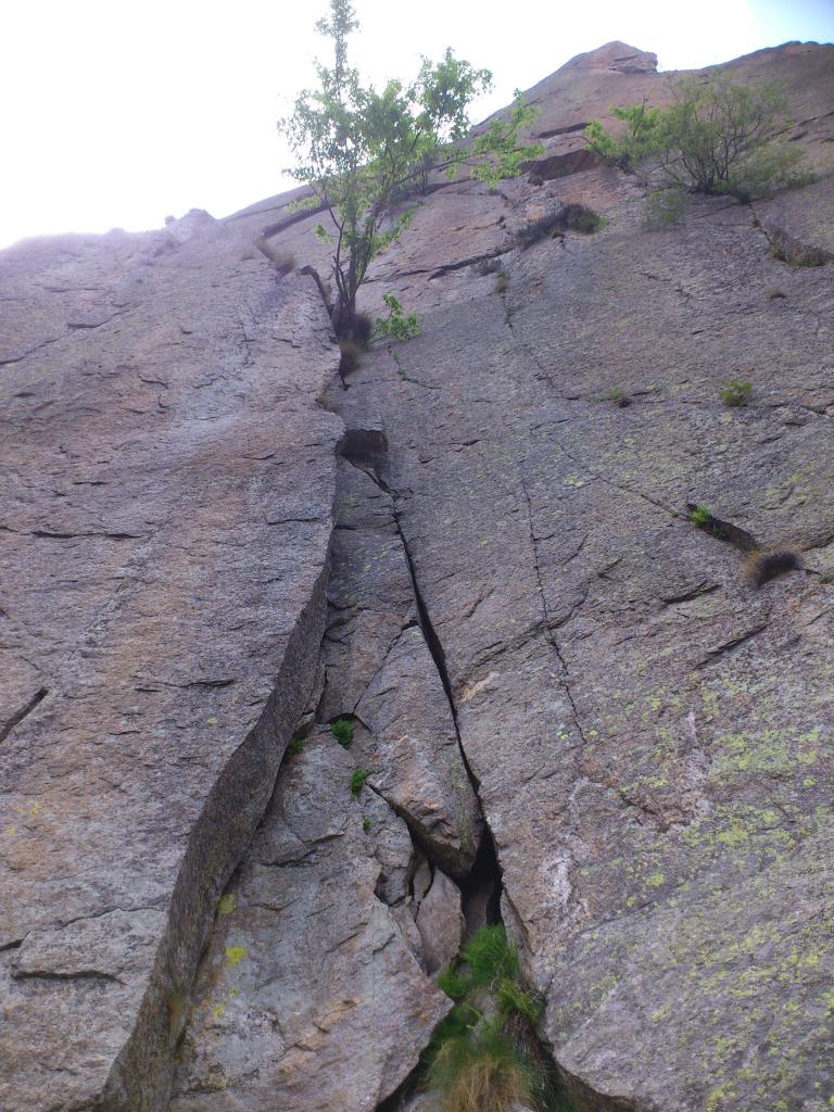 - L1 – 5a, 25m Salire la fessura-camino fino al suo termine, superare l’albero e sostare a sinistra su comoda cengia.