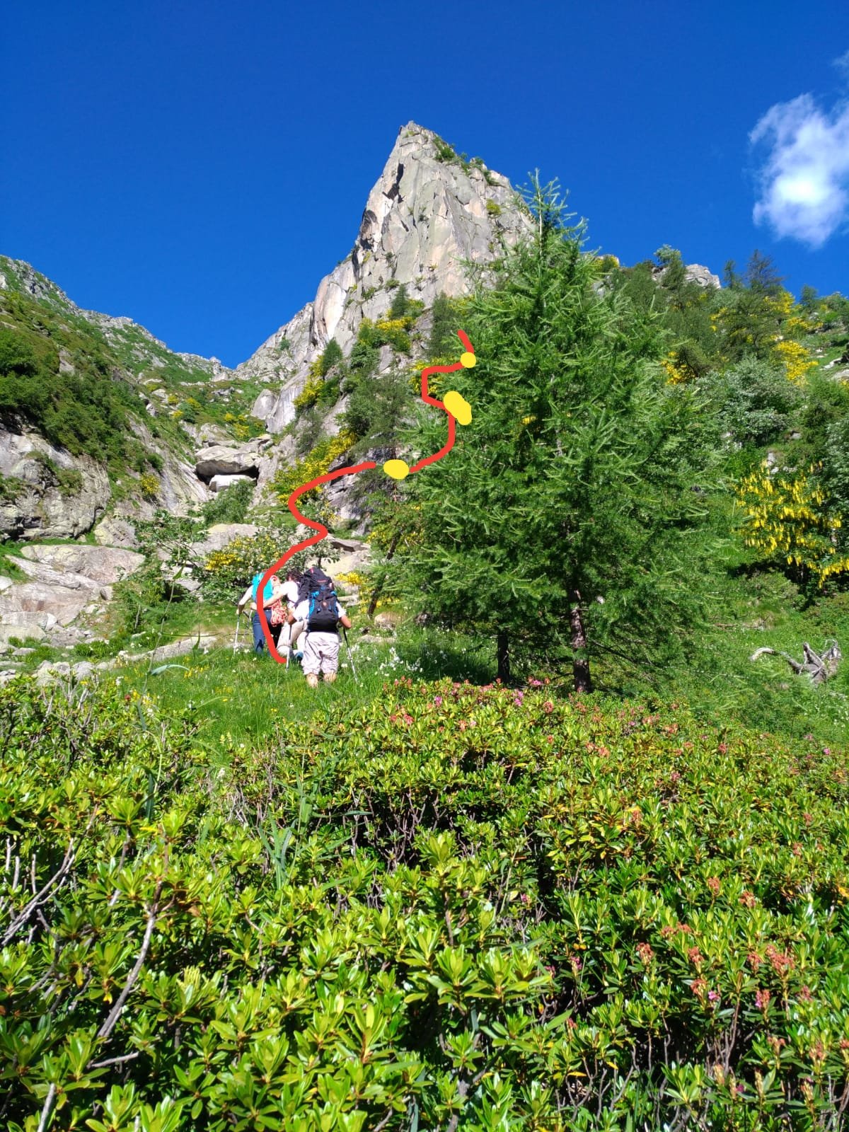 A piedi portarsi a destra sul tetto della costruzione (ometti) e reperire una traccia che sale ripida sulla sinistra orografica del torrente.