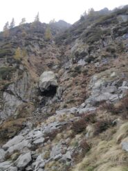 2 - continuare per il canalone fino a un grosso masso che lo ostruisce e che occorre superare attraverso un buco (passaggio di IV o scaletta di cordini o doppia dalla cima del masso). Poi si costeggia la parete rocciosa verso destra e si sale per tracce nel bosco fino sotto la parete dello Scoglio.