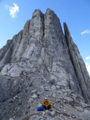 - Il quinto tiro é il passaggio chiave della via, inizialmente gradata 5.7 (anni ’60), poi rivalutata 5.8, e ultimamente considerata 5.9 sulle guide. c’é anche chi dice che potrebbe essere un 5.10a. io personalmente la valuterei come un 5.9 duro, ma se in futuro la valuteranno come 5.10a non avrei niente da ridire. questo perché i primi passaggi del diedro hanno degli appigli che negli anni sono diventati belli lisci, ed é difficile avere una bella trazione con i piedi. BD #3 e #4 tornano utili;