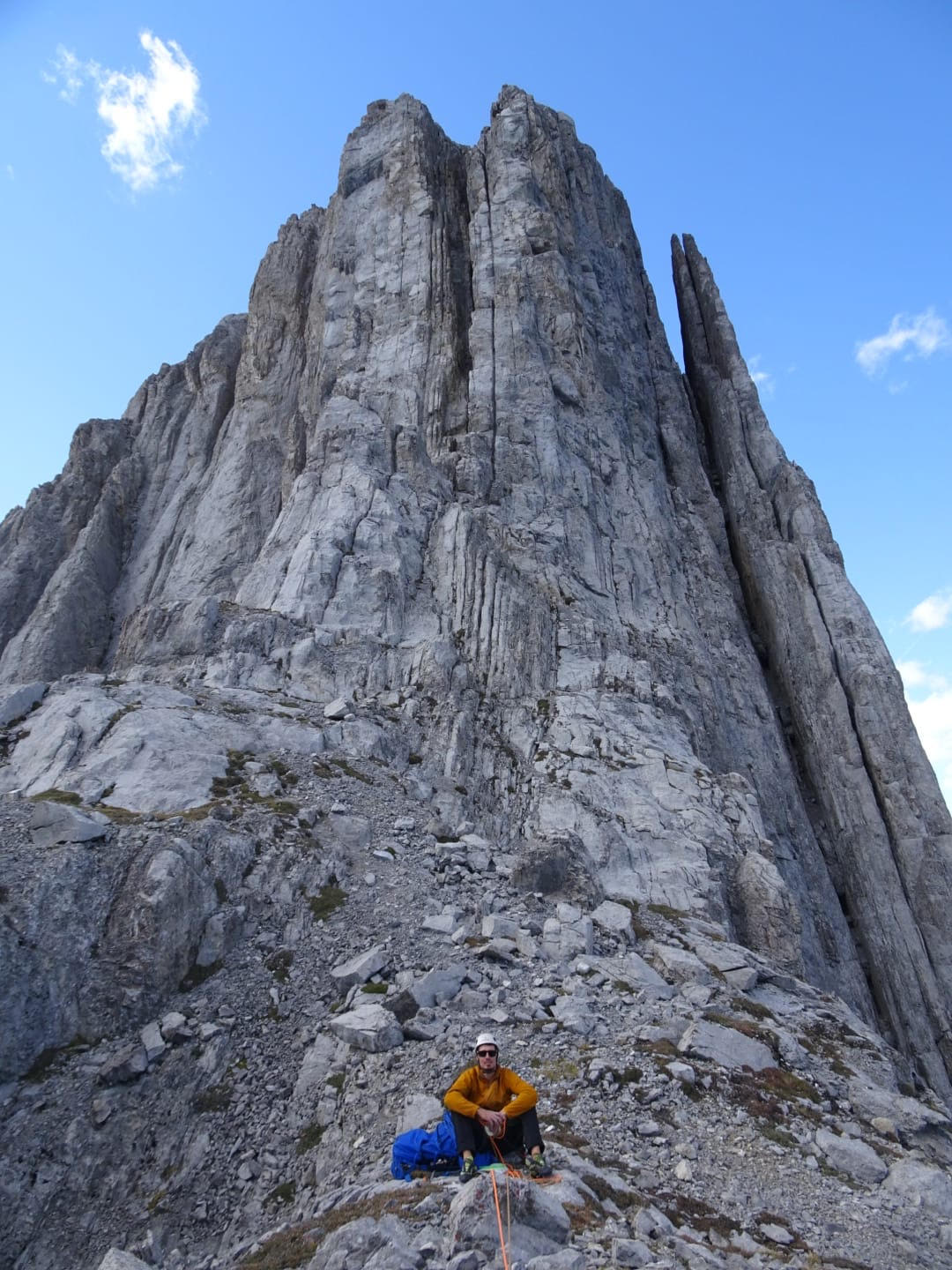 - Una volta raggiunta, anche la Kain Route ha qualche sosta a spit, per esempio il nono tiro (Lunchtime Ledge), e il decimo tiro. per i tiri 11-12-13 ho attrezzato soste trad seguendo una dorsale fino alla grande cengia che delimita il muro sommitale da dove parte la Perren Crack;