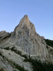 - La Perren Crack ha una sosta spit alla sua base, e un’altra piú o meno 20 metri più in alto a sinistra della fessura. più o meno una quarantina di metri sopra quest’ultima sosta e una volta lasciata la fessura alle spalle ci sono due vecchi chiodi per fare una sosta con possibilità di integrarla con friends e dadi. da quí é terreno facile fino alla cima, dove si trova un registro di vetta e una piccola croce di metallo. inizialmente valutata 5.7 (anni 60) La Perren Crack é attualmente valutata 5.8, e come parare personale é un 5.8 duro ma su roccia eccellente. Sará anche che a questo punto avanzato della via, si potrebbe essere abbastanza stanchi.