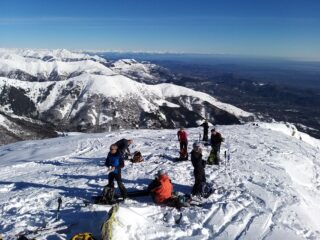 Discesa. Parte alta e media, difficile trovare zone che non siano già completamente tritate. Però, con un po’ di fantasia, qualcosa si trova ancora ed è molto bella, ad eccezione di qualche pendio più ripido dove c’è un po’ di crosta da vento. Nella parte bassa sta iniziando a mollare.