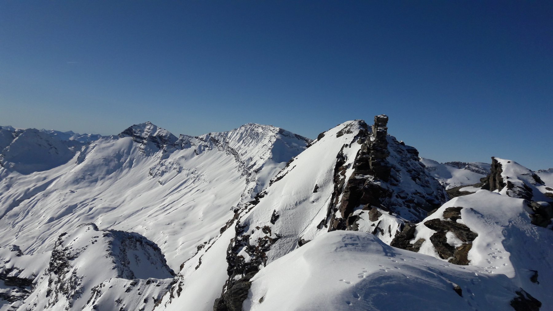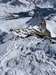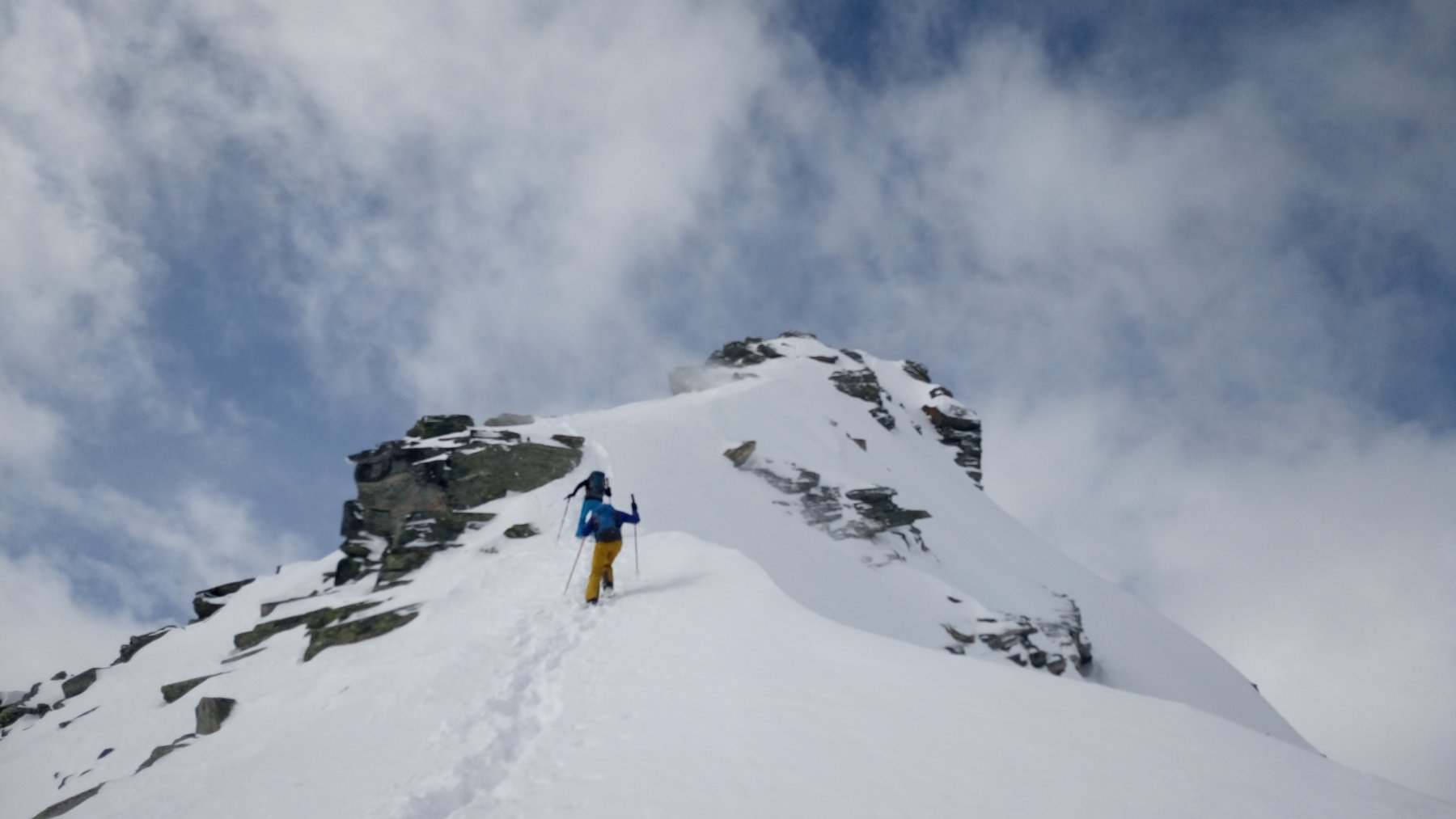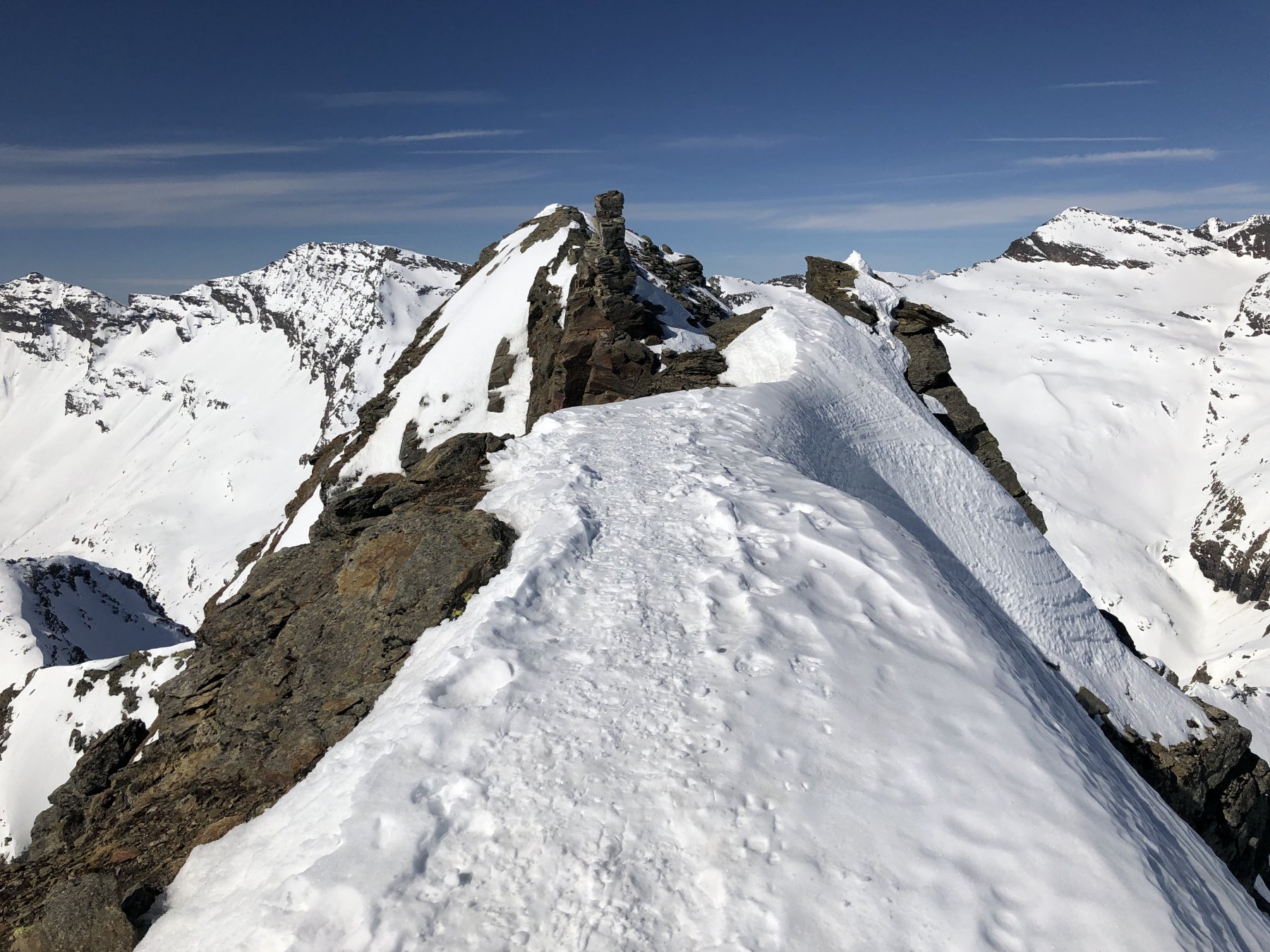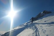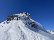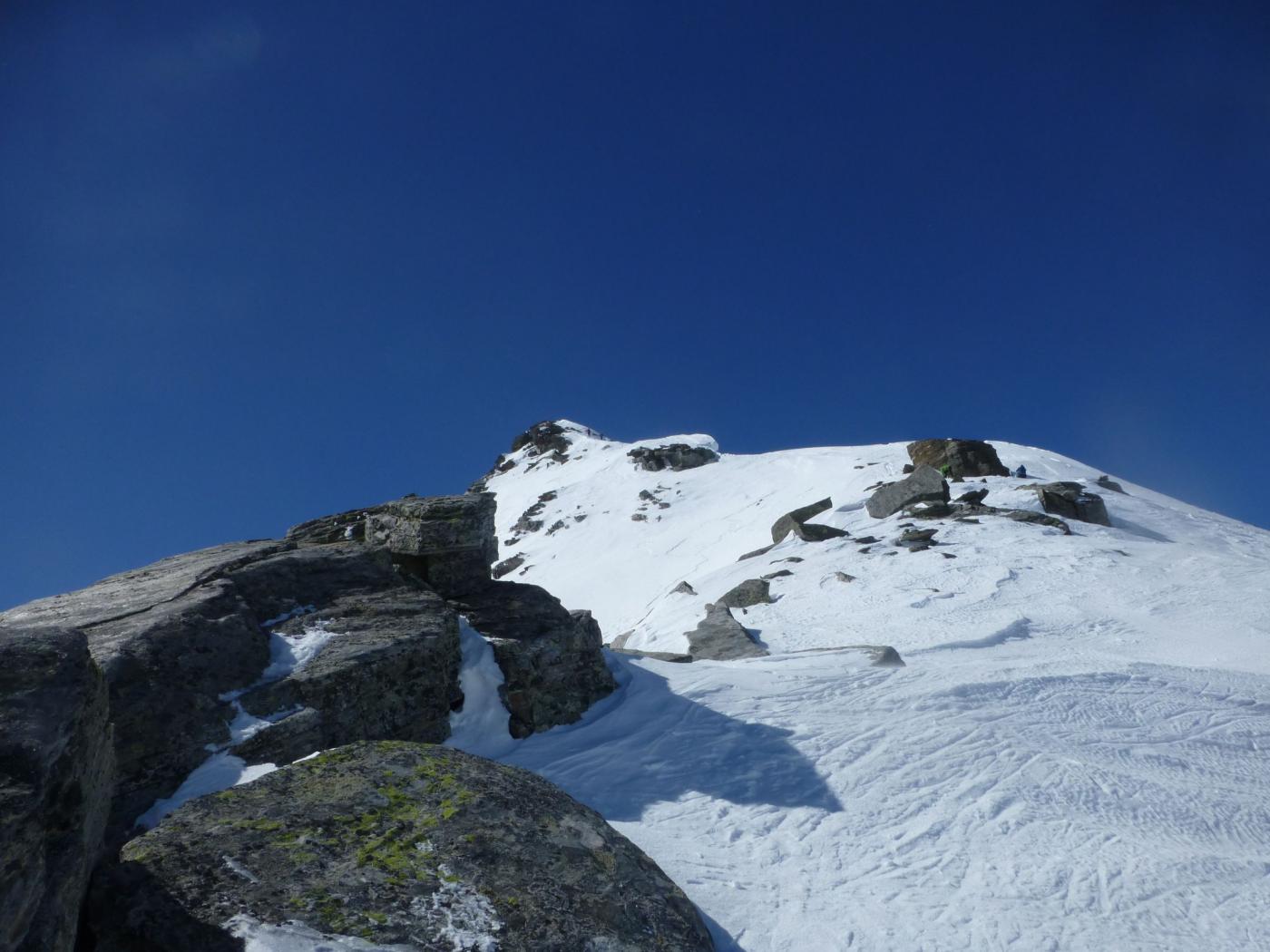 Abbandonati gli sci si risale la cresta su roccette raggiungendo in una decina di minuti la sommità dell’anticima. Da qui è possibile traversare alla cima vera e propria di due metri più alta, percorrendo un’esile cresta di misto che seppur non difficile è piuttosto esposta.