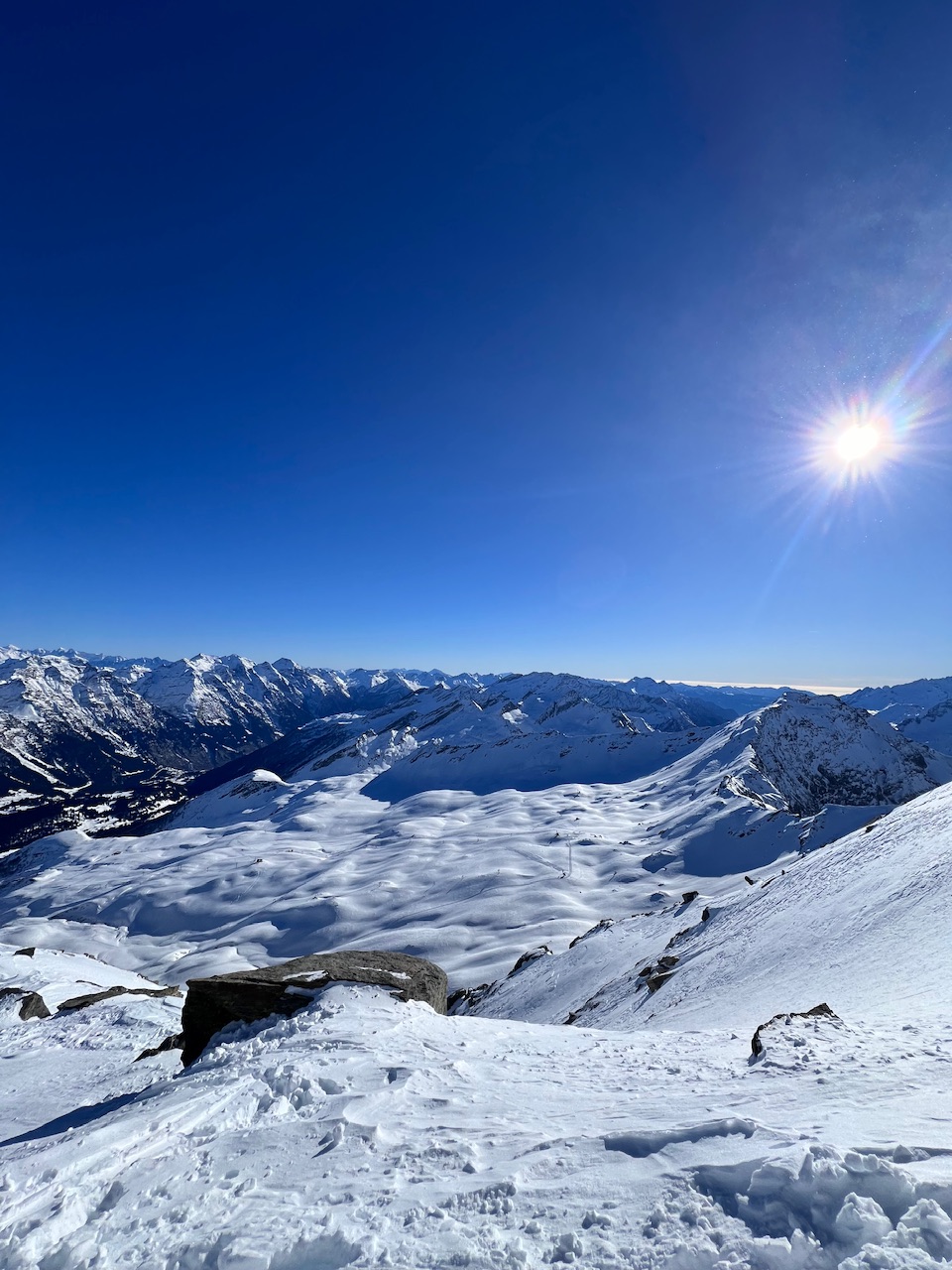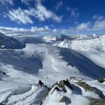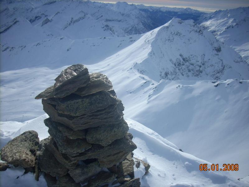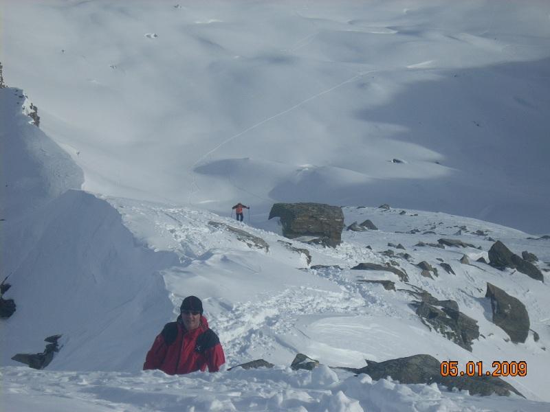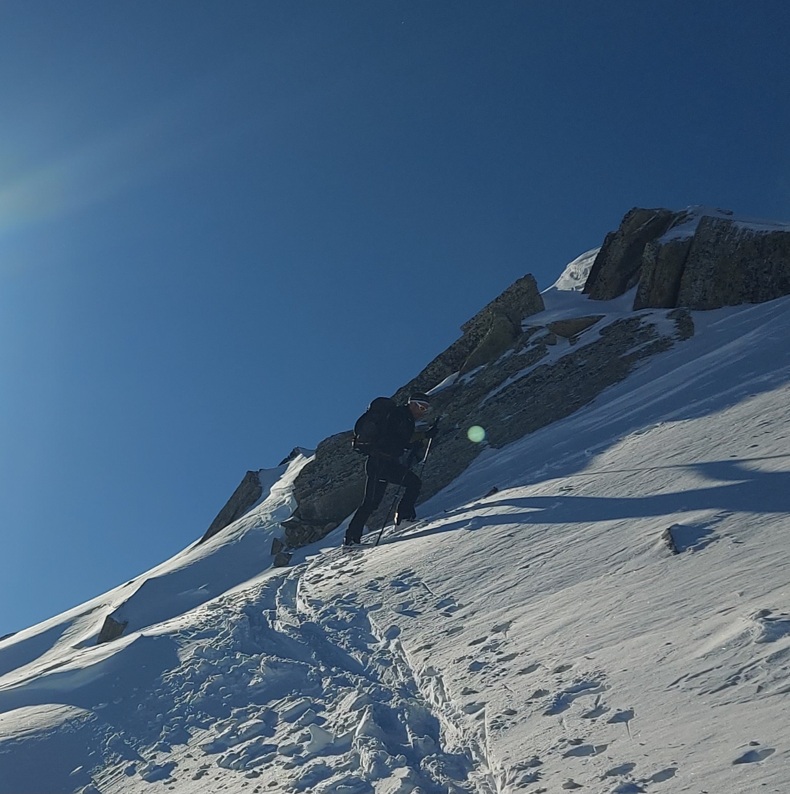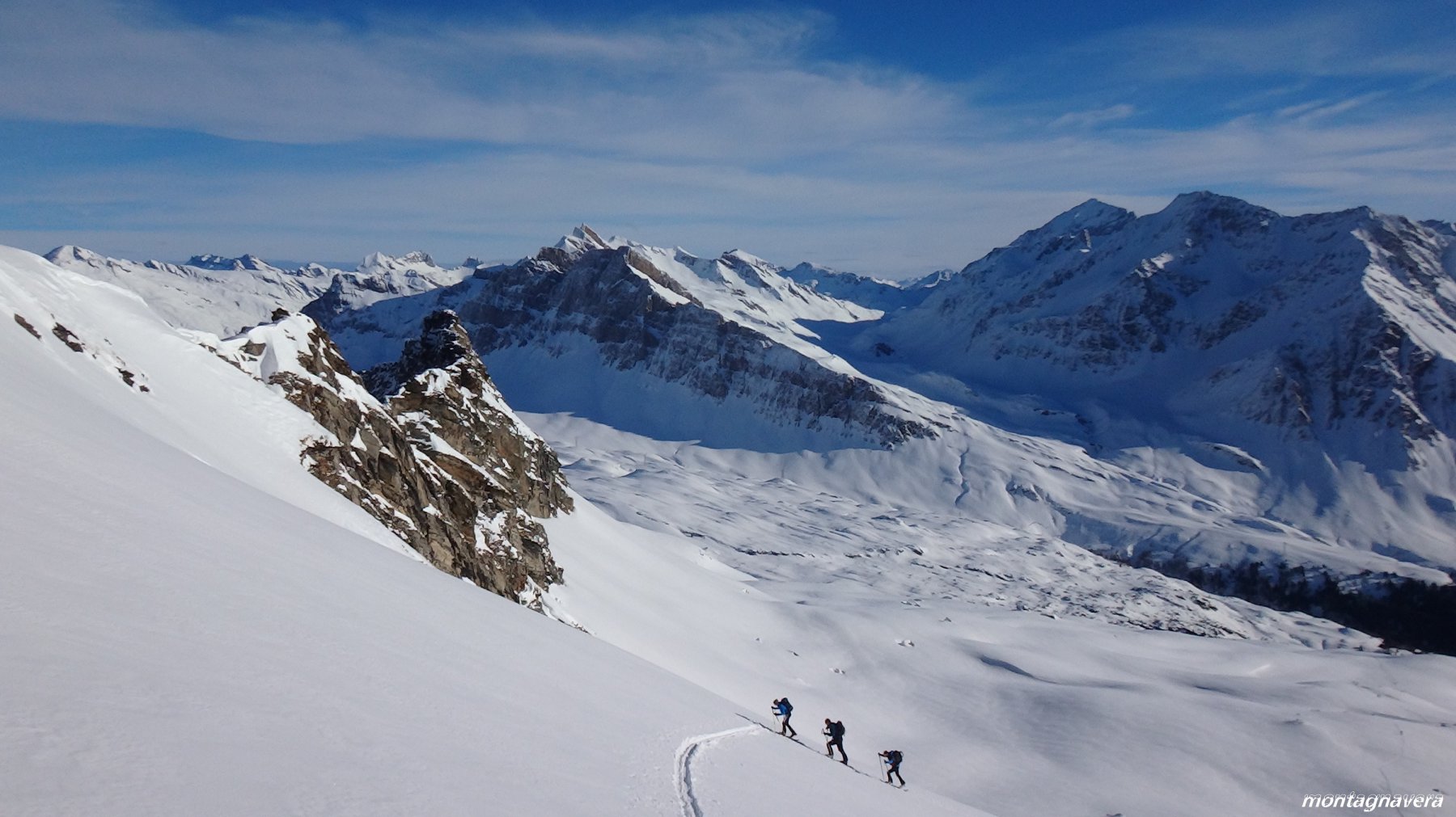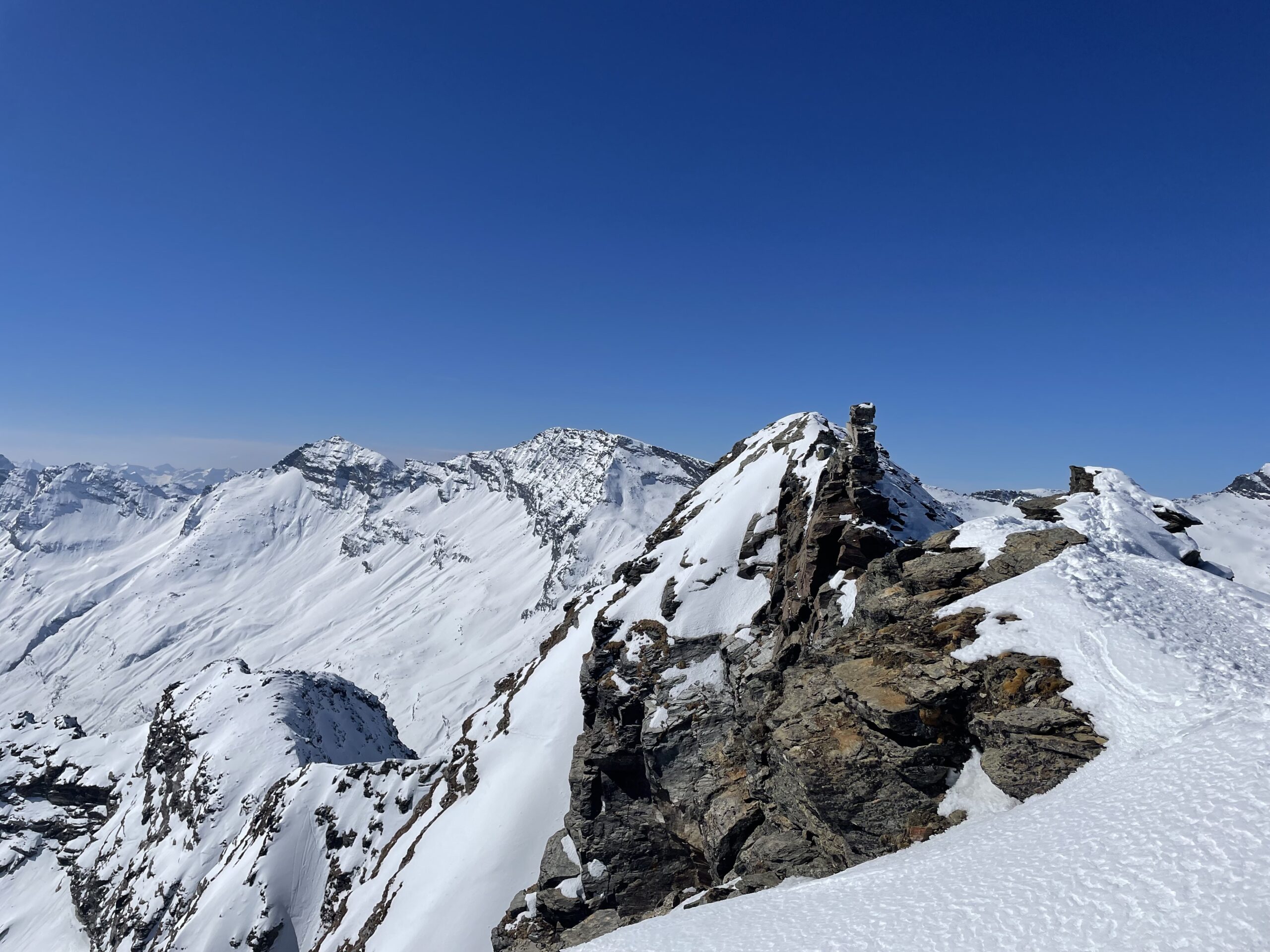 Abbandonati gli sci si risale la cresta su roccette raggiungendo in una decina di minuti la sommità dell’anticima. Da qui è possibile traversare alla cima vera e propria di due metri più alta, percorrendo un’esile cresta di misto che seppur non difficile è piuttosto esposta.