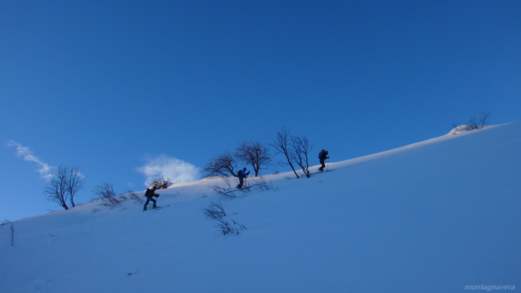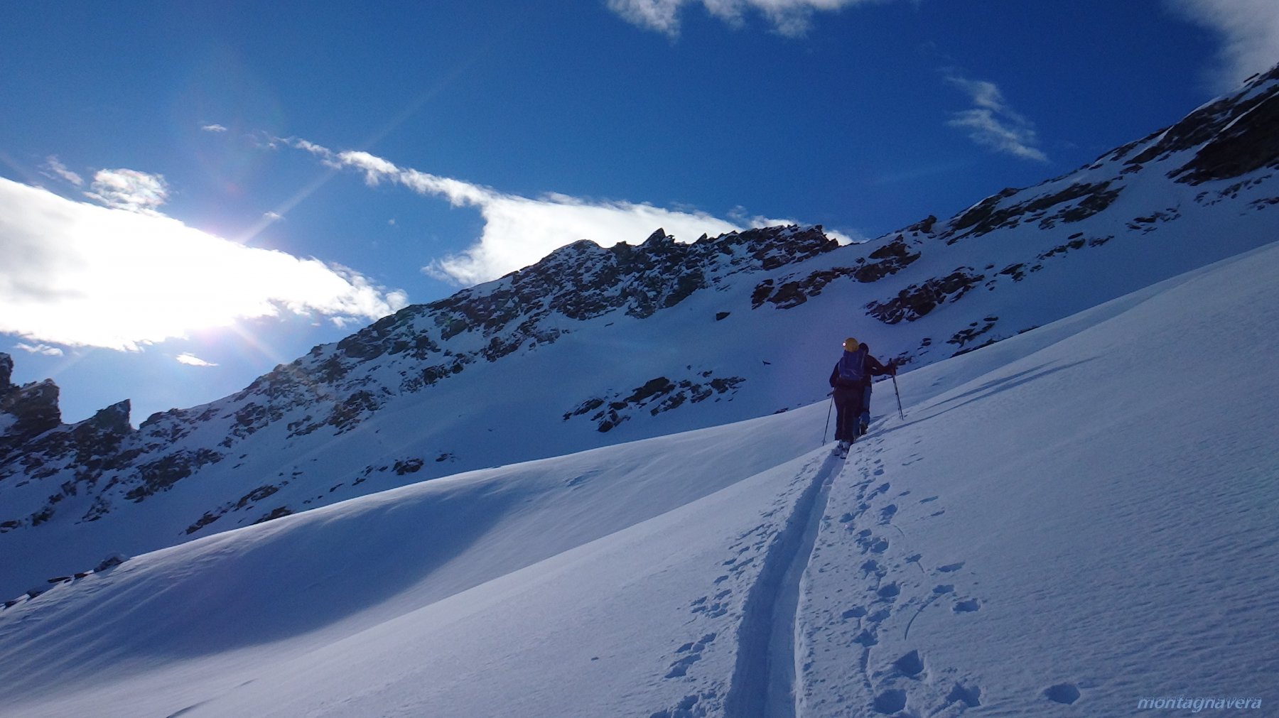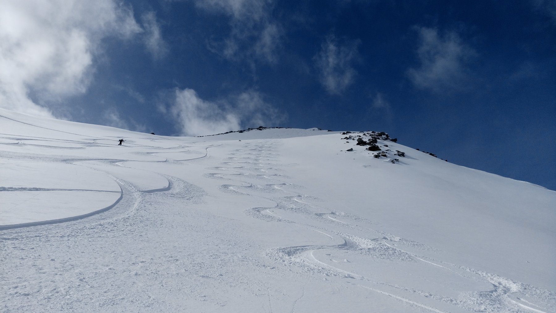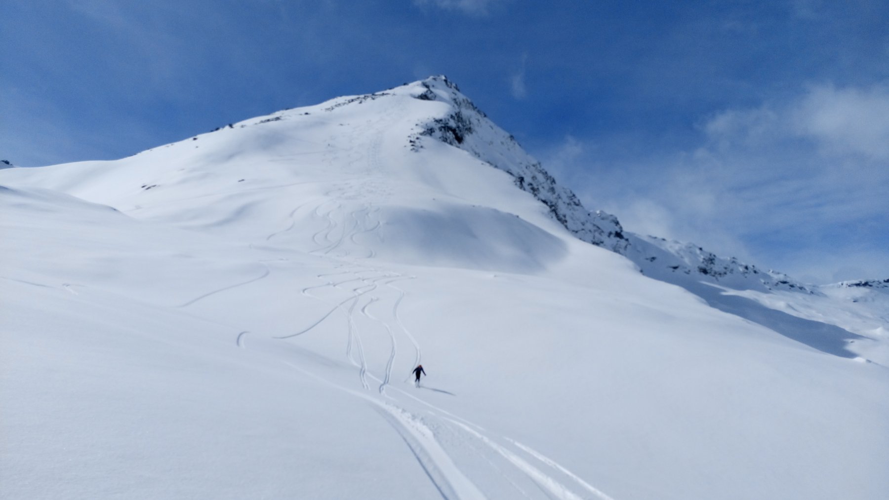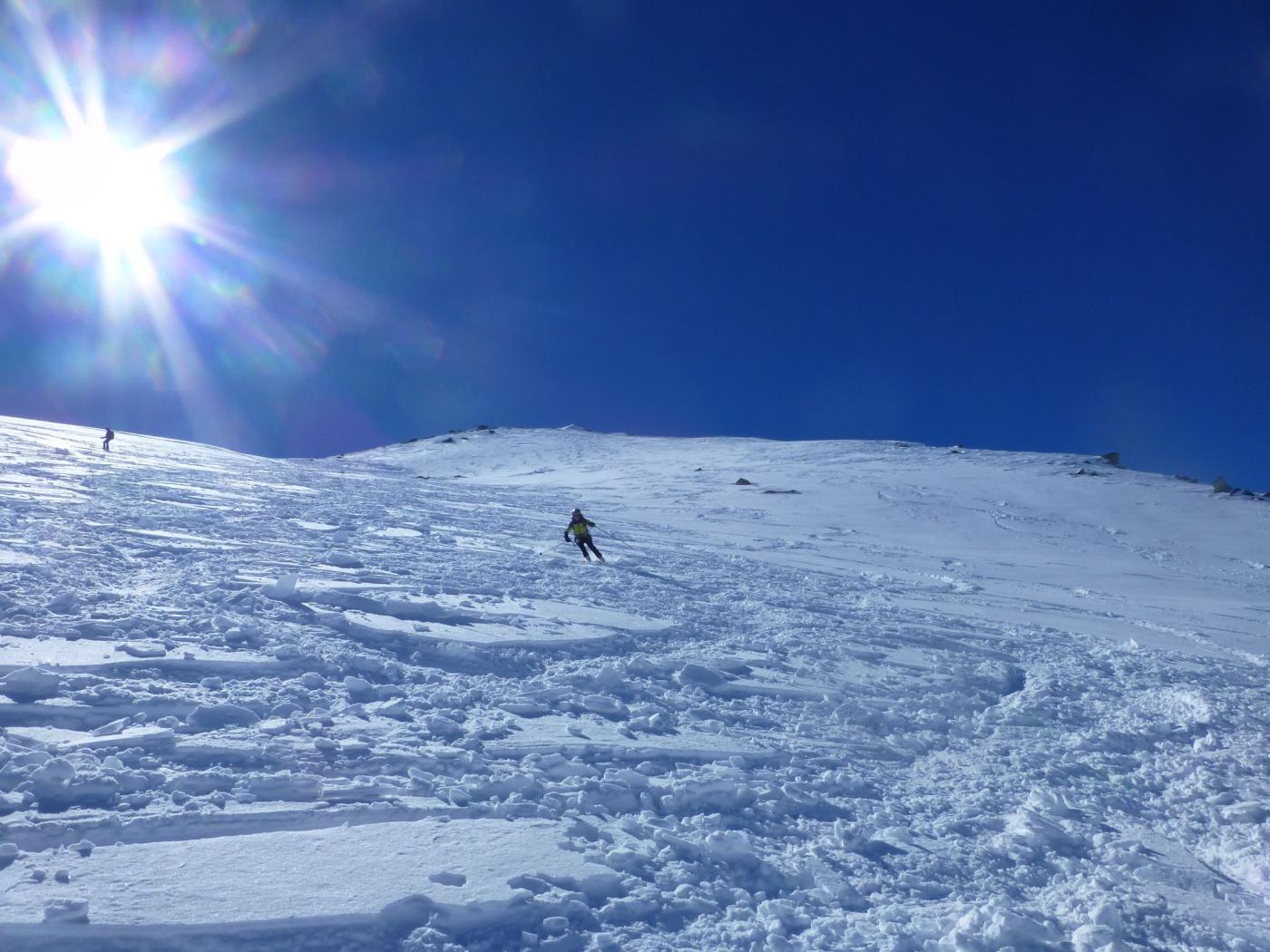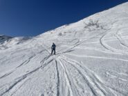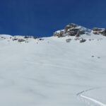 Risalire l’ampio spallone con numerosi zig-zag (in questo tratto la neve è spesso esposta all’azione eolica, quindi mai troppo abbondante e con presenza di placca ventate)e giungere con gli sci sotto l’anticima.