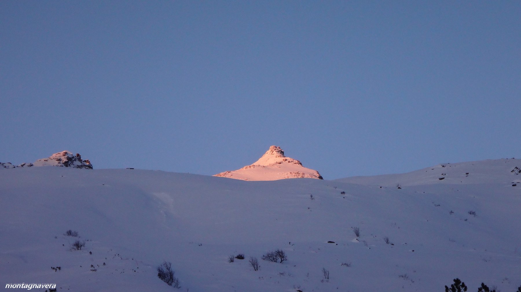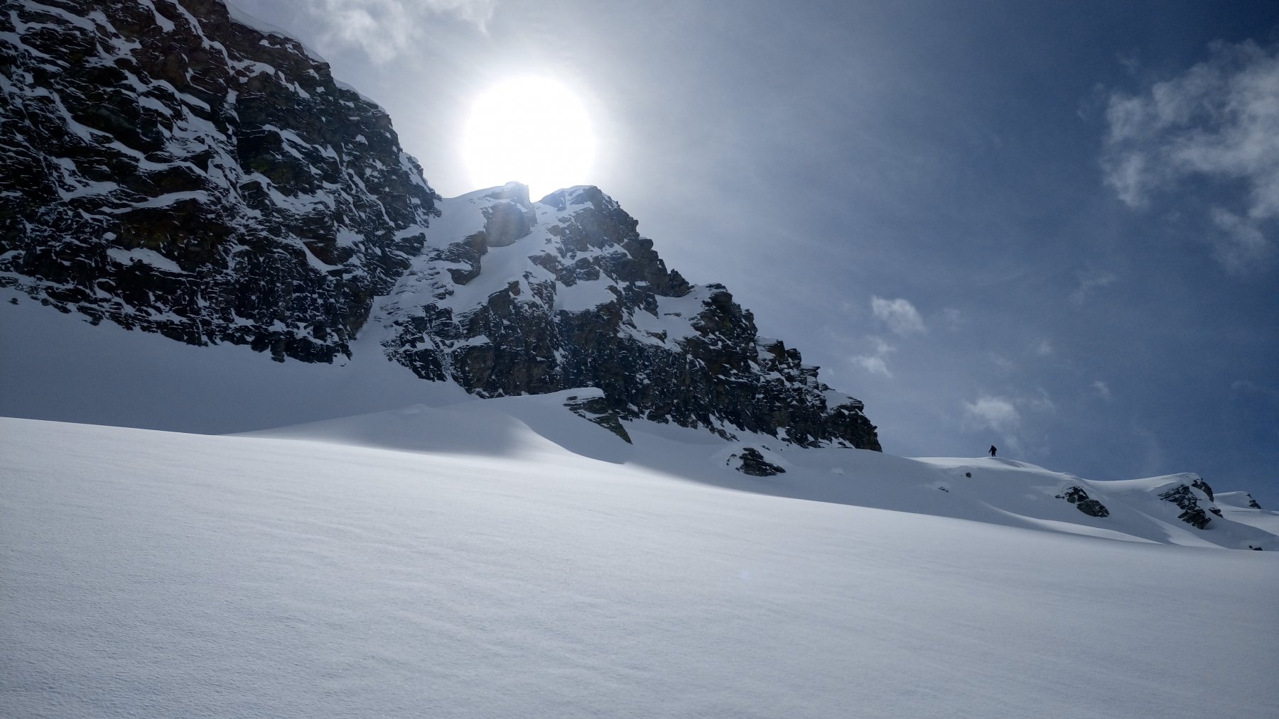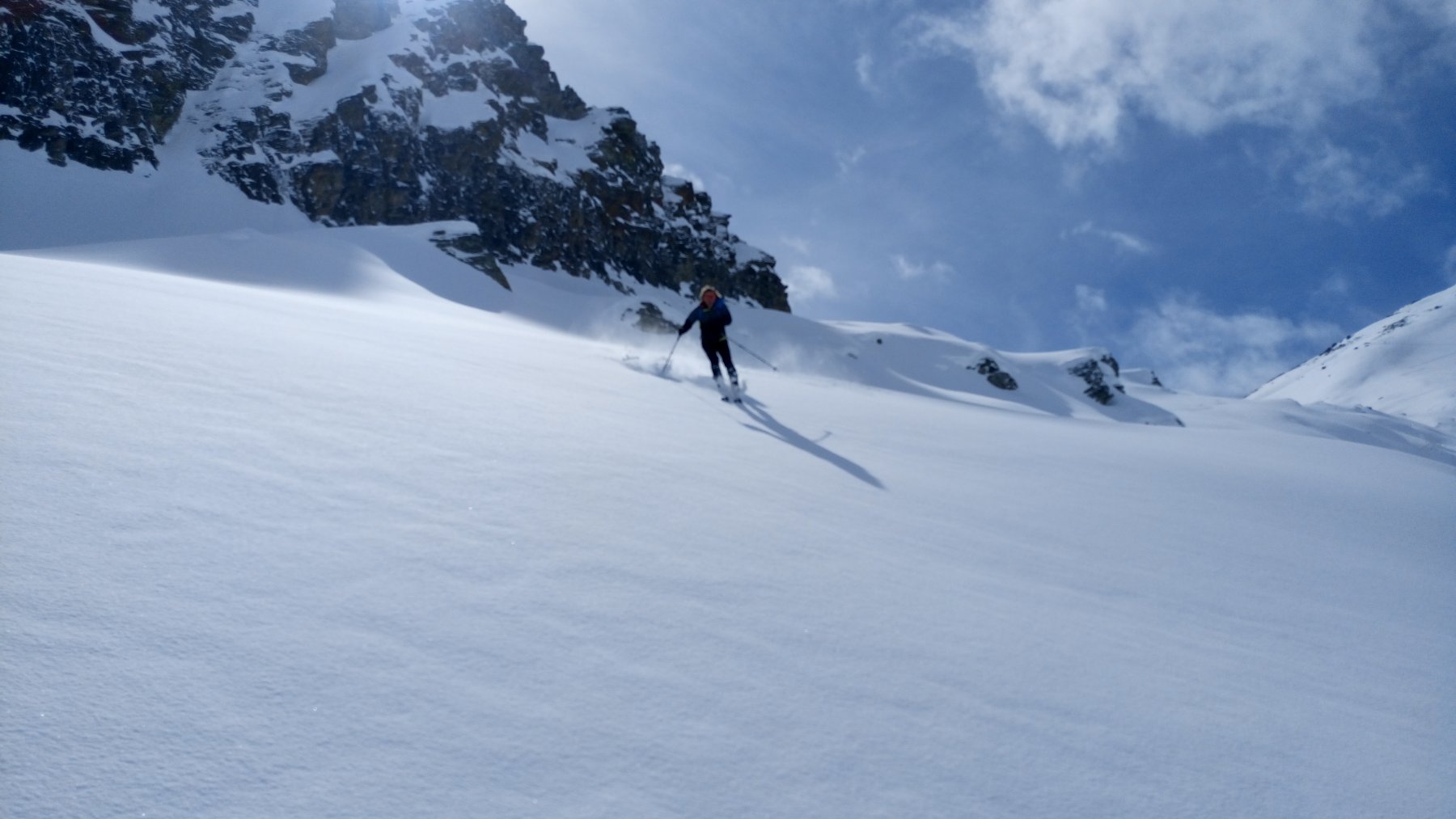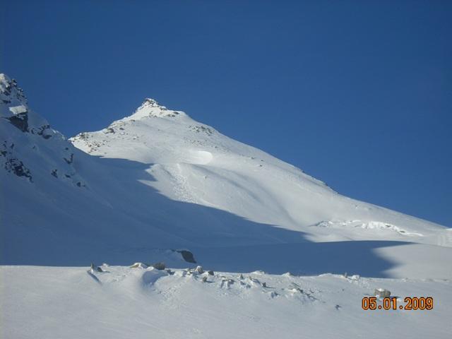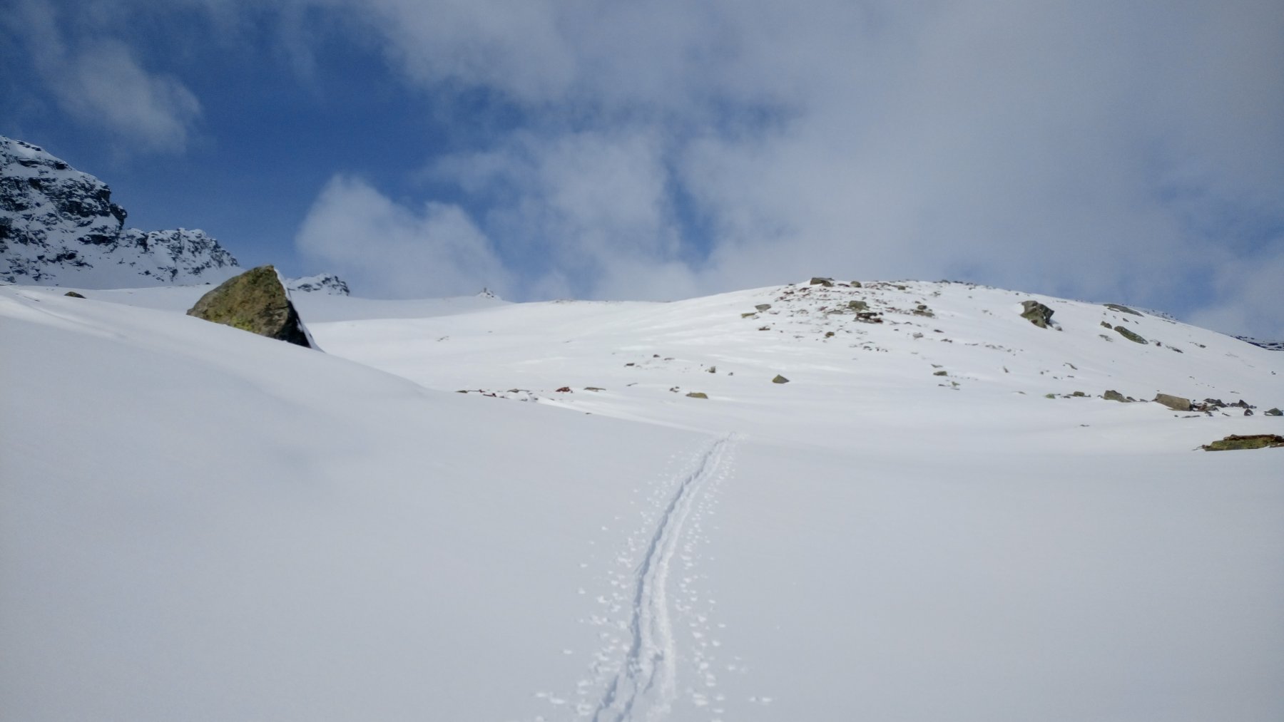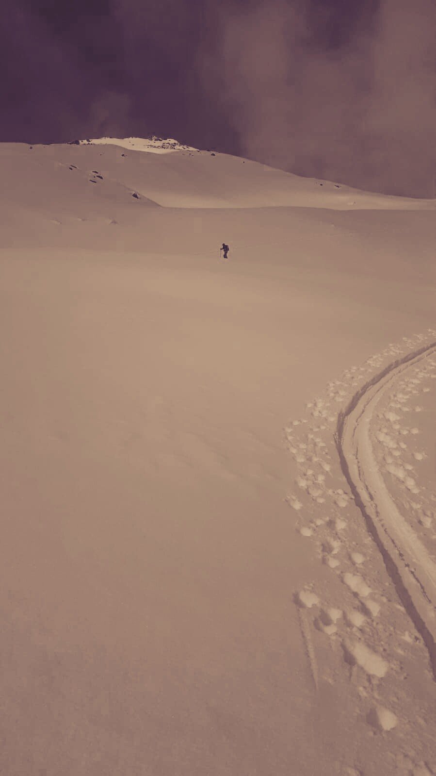 Risalire l’ampio spallone con numerosi zig-zag (in questo tratto la neve è spesso esposta all’azione eolica, quindi mai troppo abbondante e con presenza di placca ventate)e giungere con gli sci sotto l’anticima.
