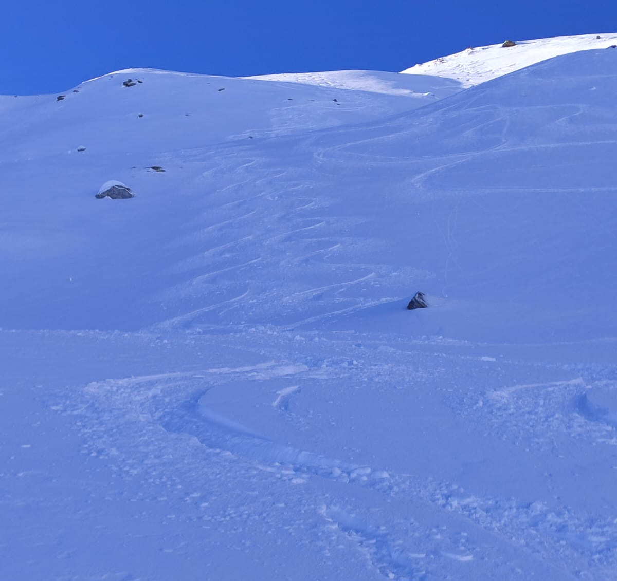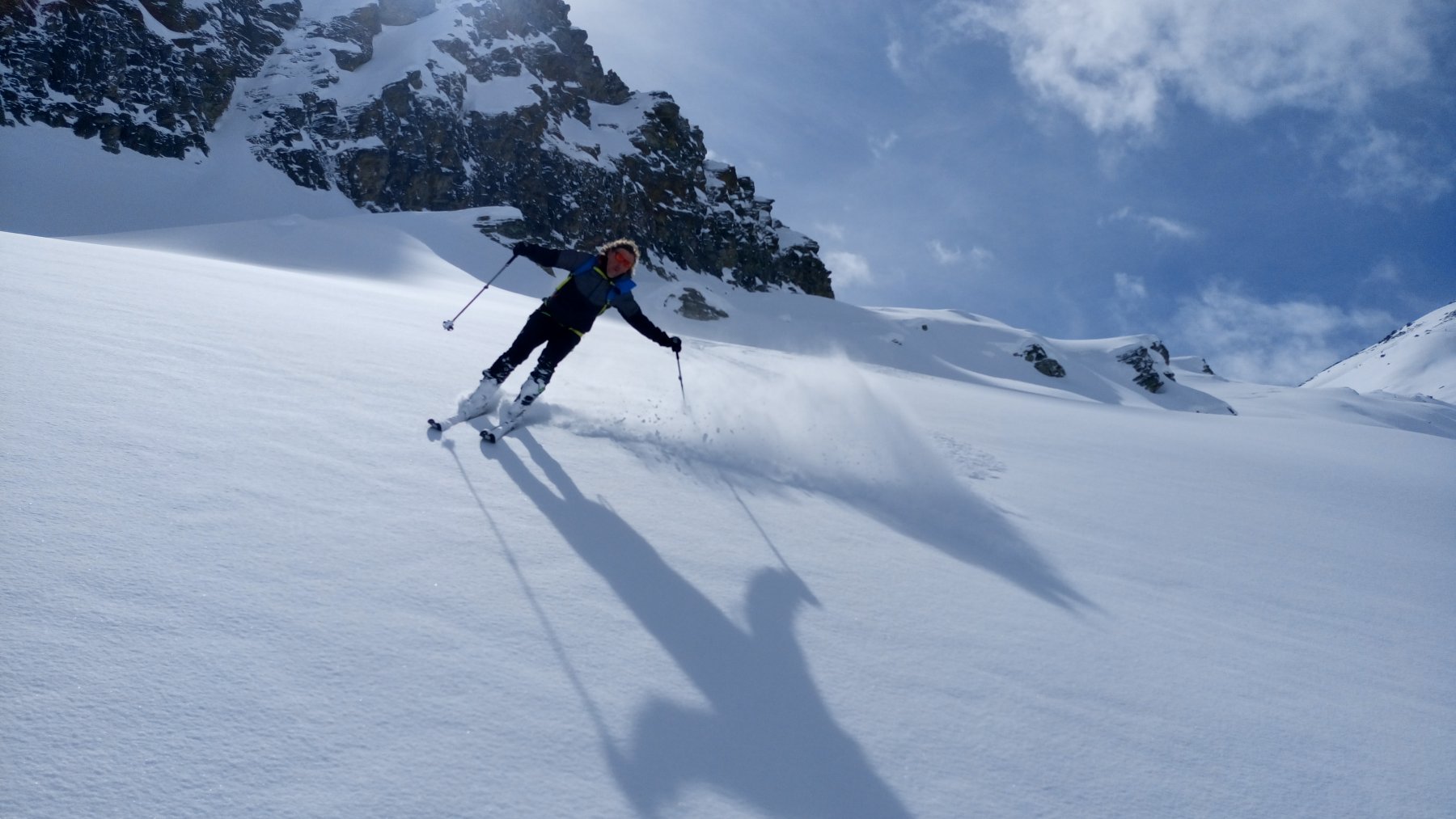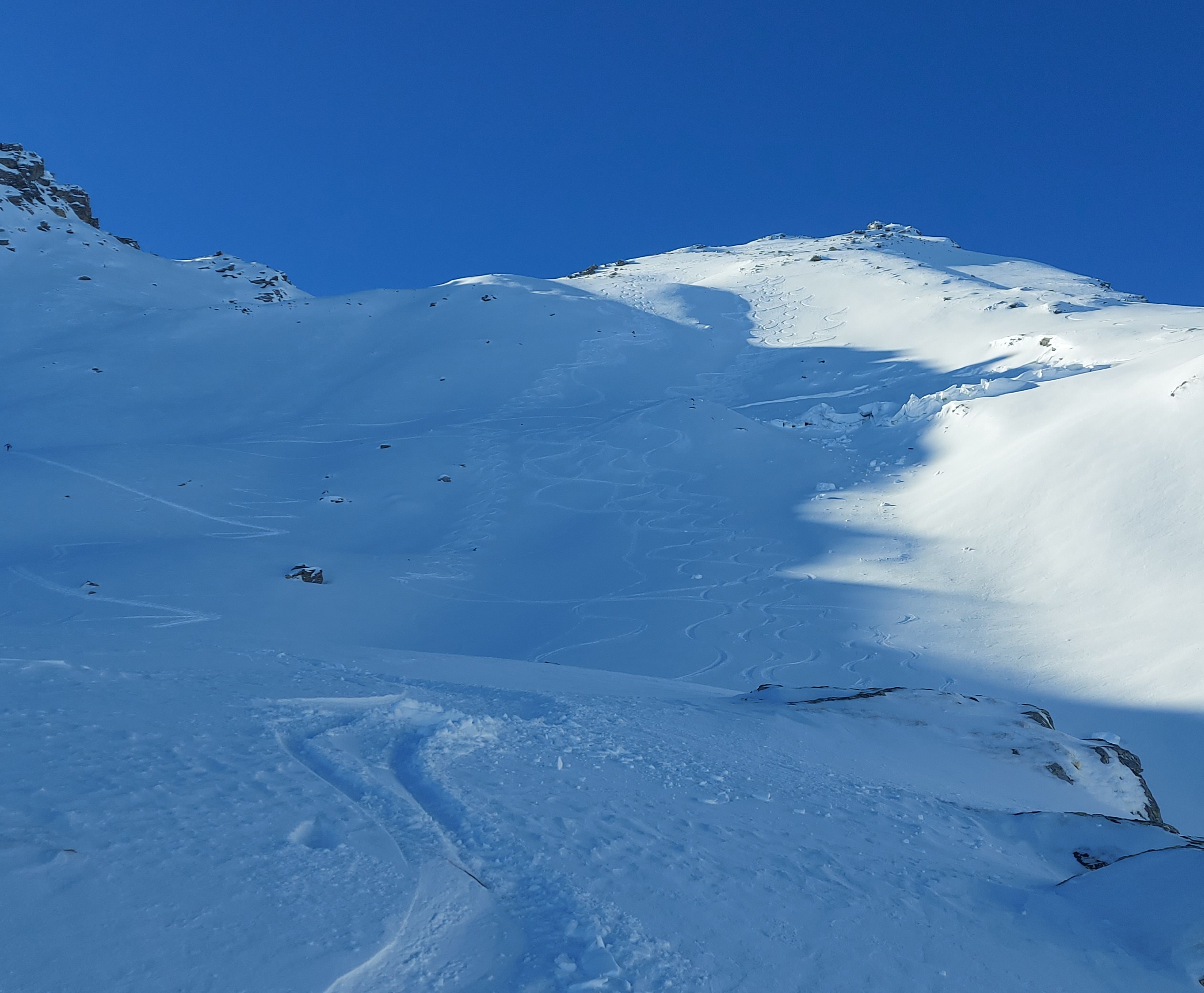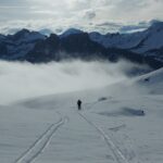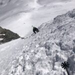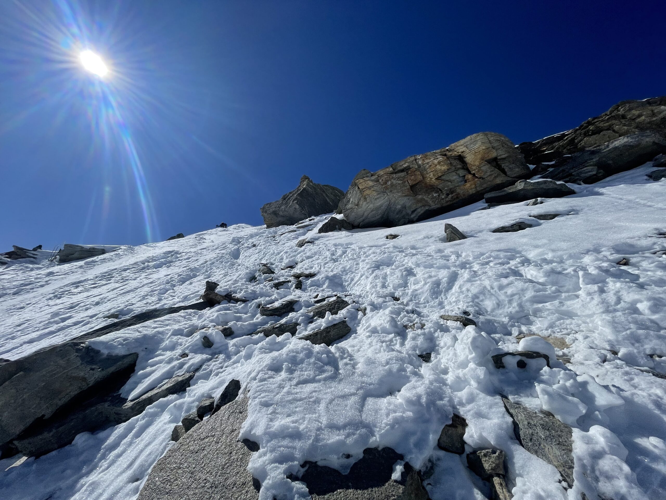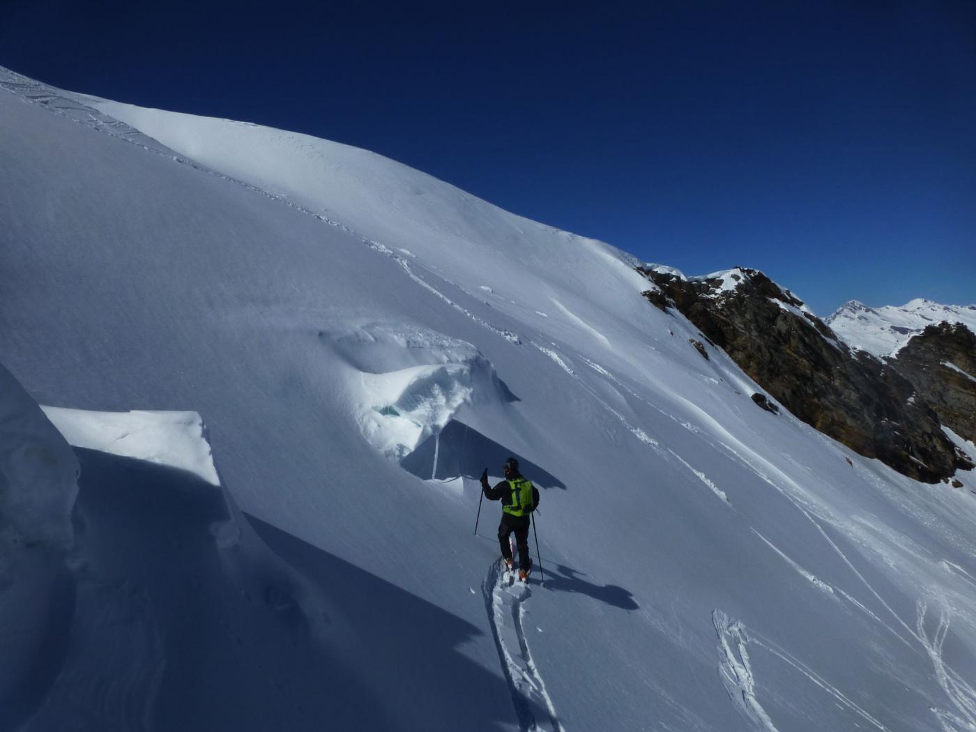 Risalire l’ampio spallone con numerosi zig-zag (in questo tratto la neve è spesso esposta all’azione eolica, quindi mai troppo abbondante e con presenza di placca ventate)e giungere con gli sci sotto l’anticima.