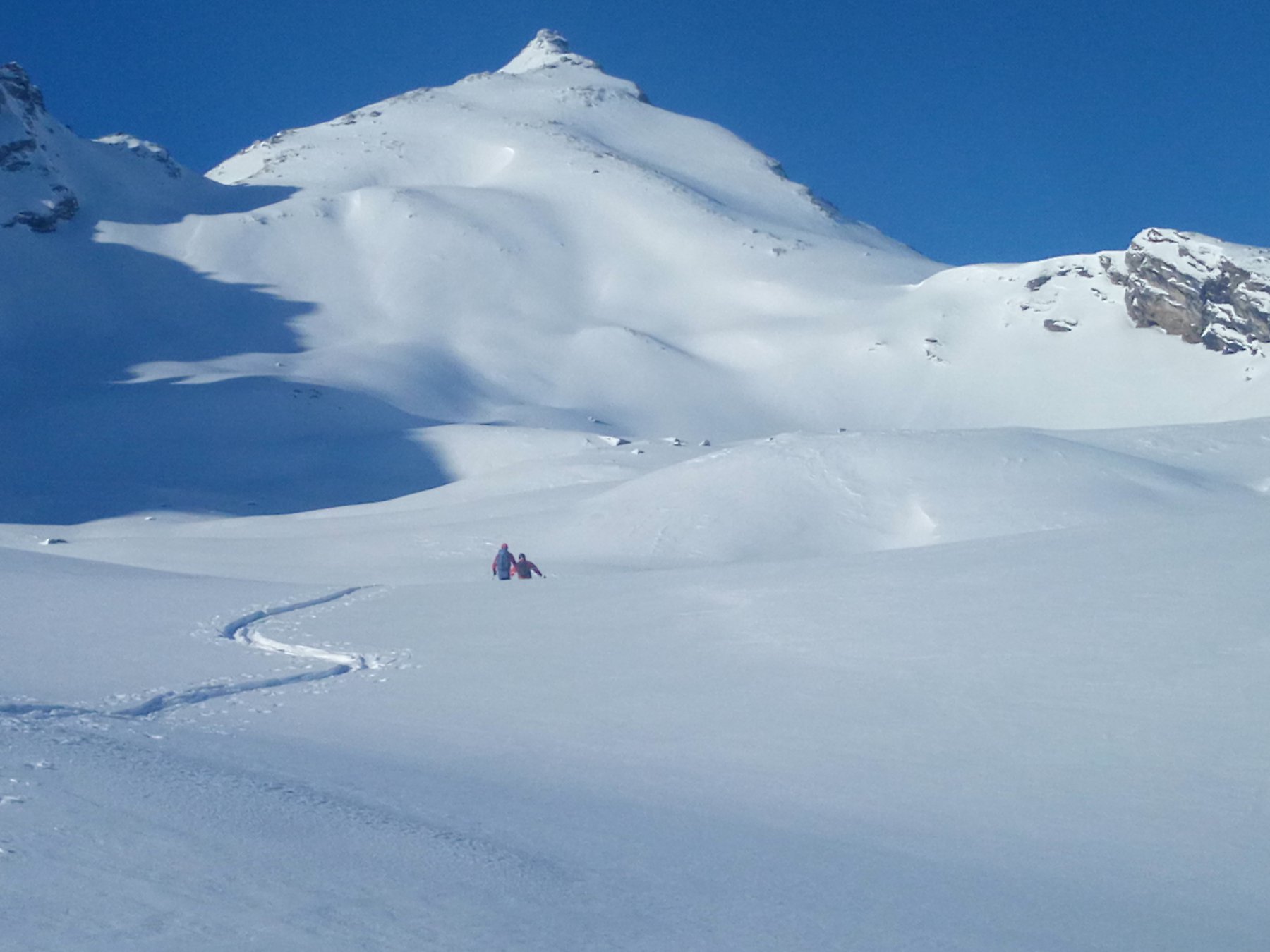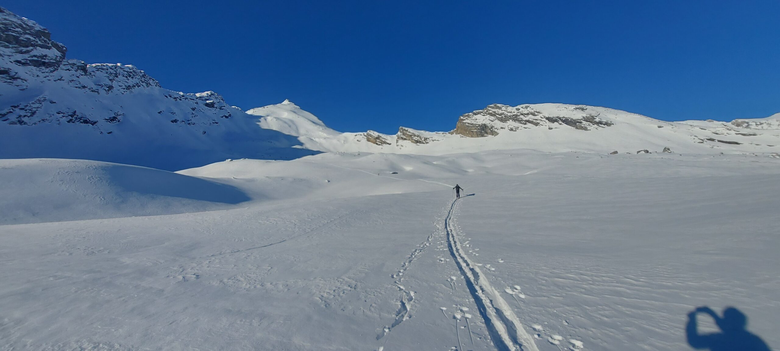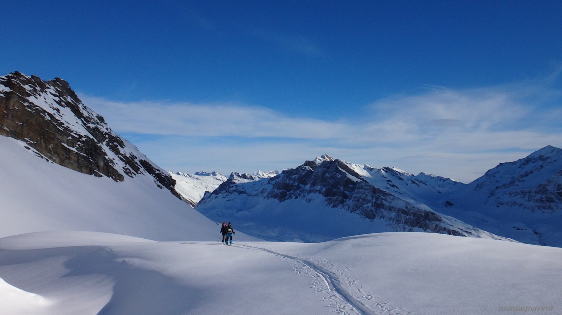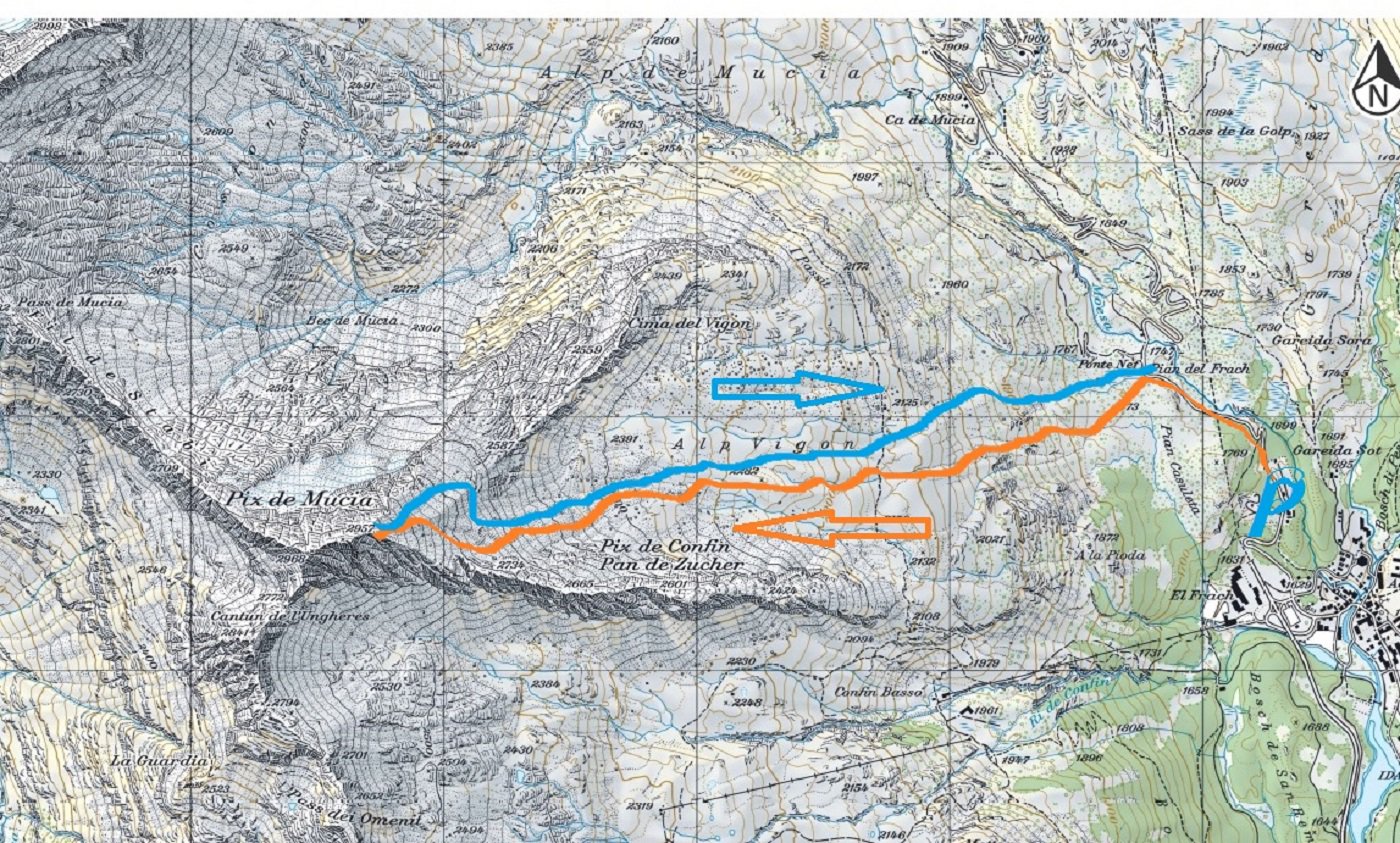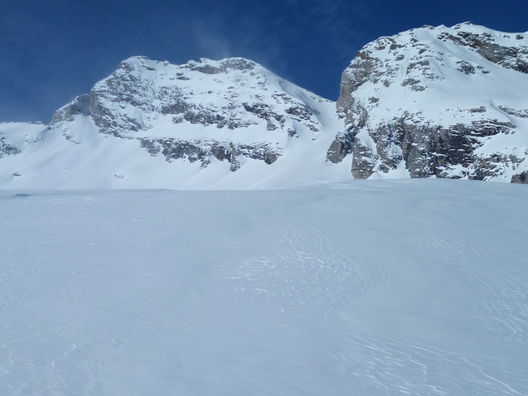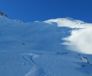 Da qui percorrere l’ampia valle senza percorso obbligato in direzione della vetta. Giunti alla testata della valle risalire un pendio che diviene progressivamente più ripido (attenzione in caso di neve abbondante)e che permette con un breve traverso verso la propria destra di portarsi all’ampia sella alla base del Piz de Mucia.