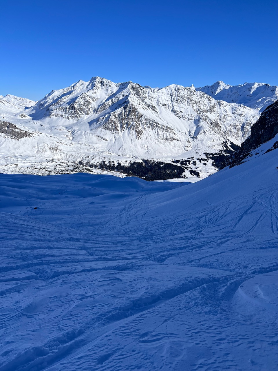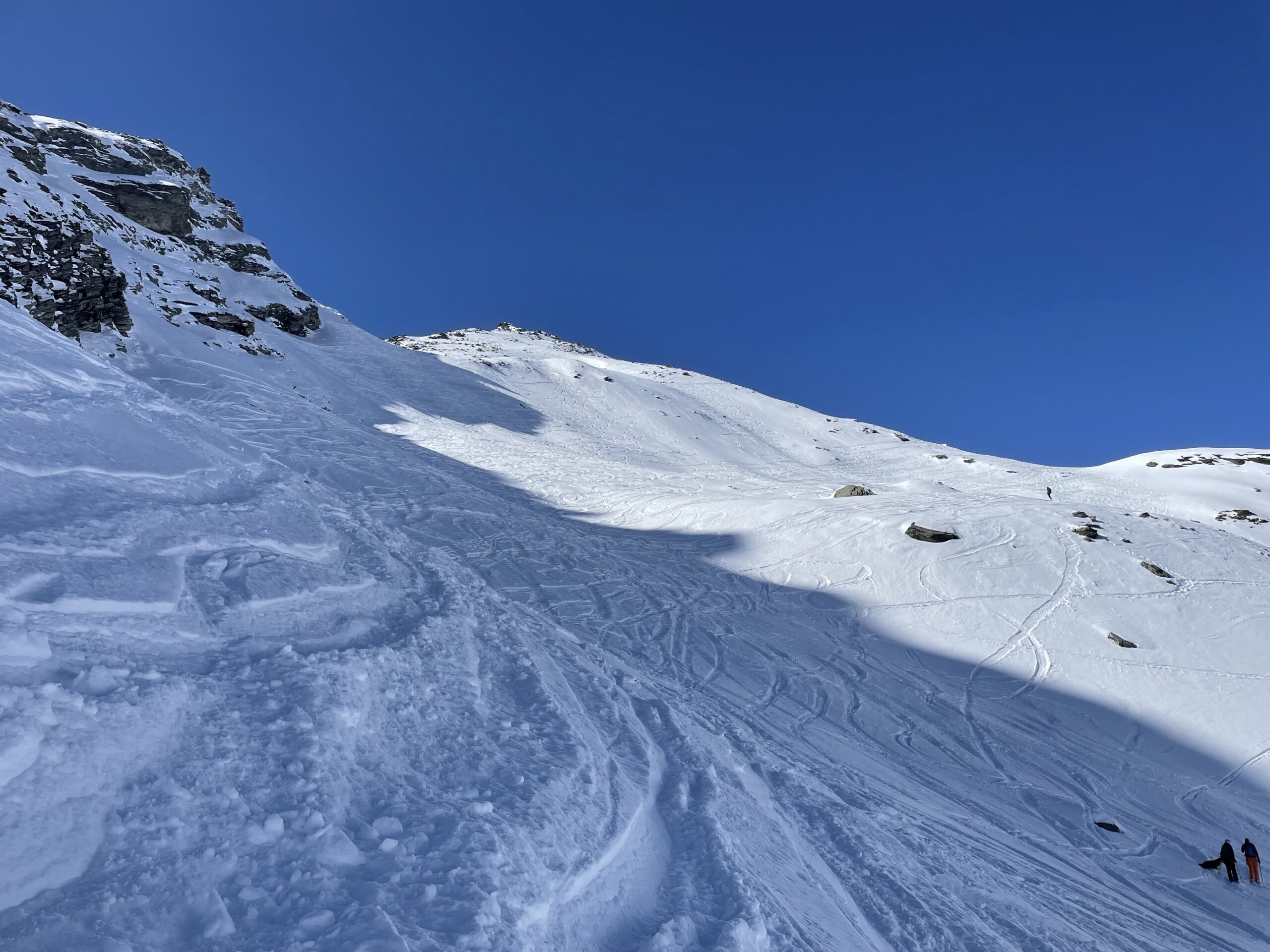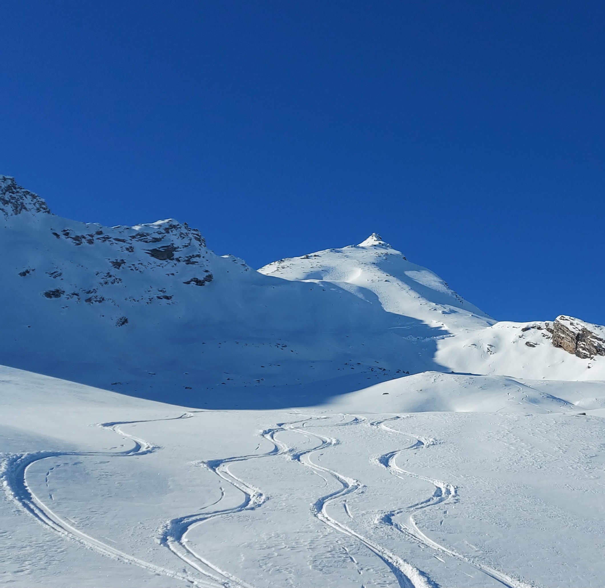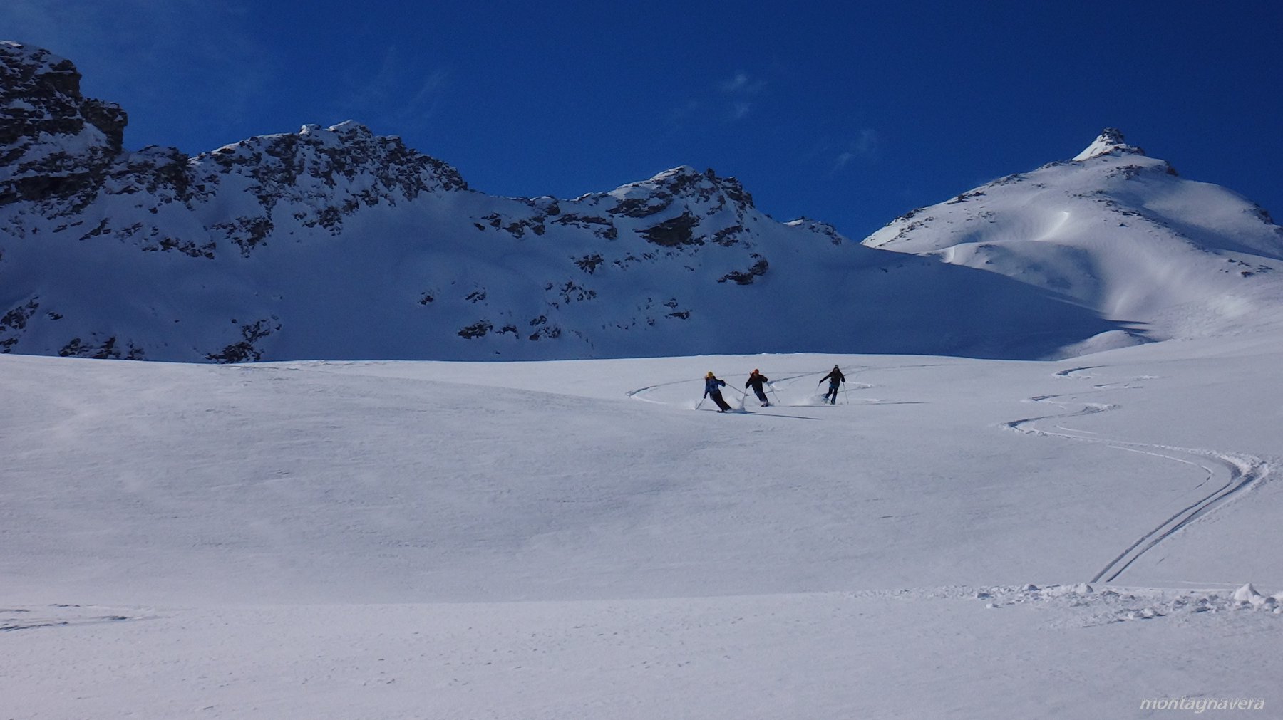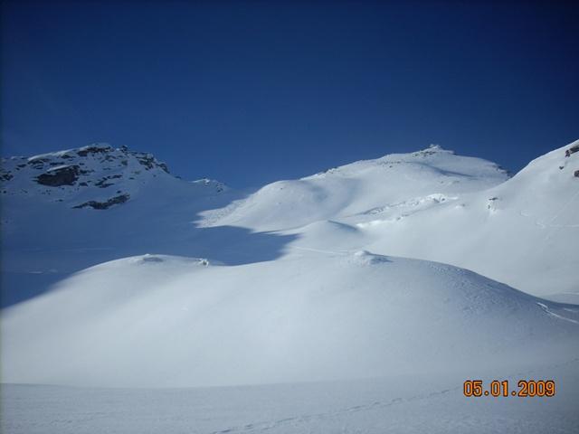 Da qui percorrere l’ampia valle senza percorso obbligato in direzione della vetta. Giunti alla testata della valle risalire un pendio che diviene progressivamente più ripido (attenzione in caso di neve abbondante)e che permette con un breve traverso verso la propria destra di portarsi all’ampia sella alla base del Piz de Mucia.