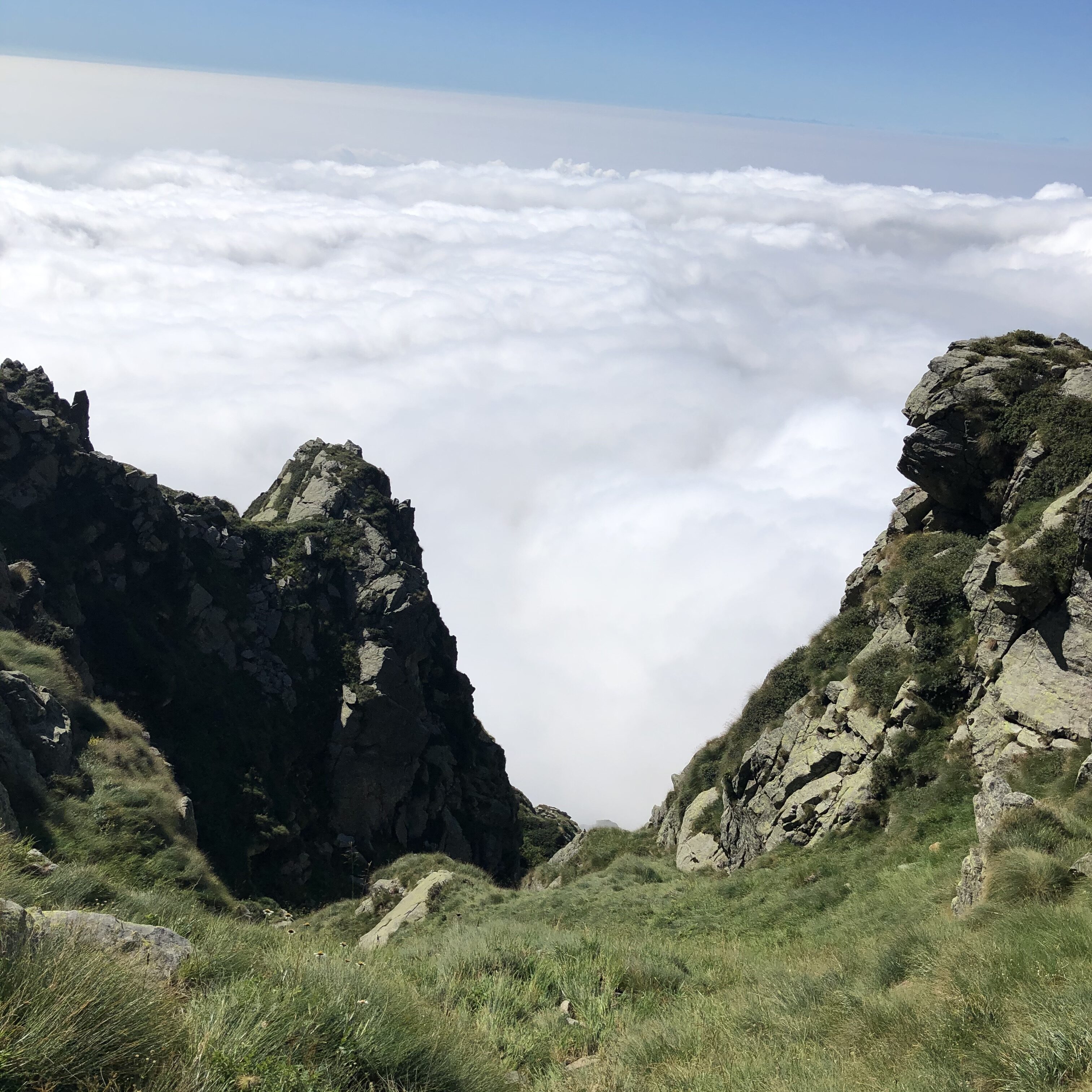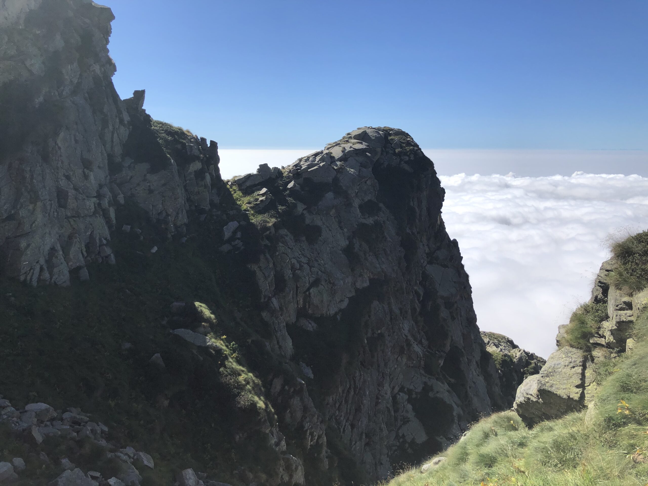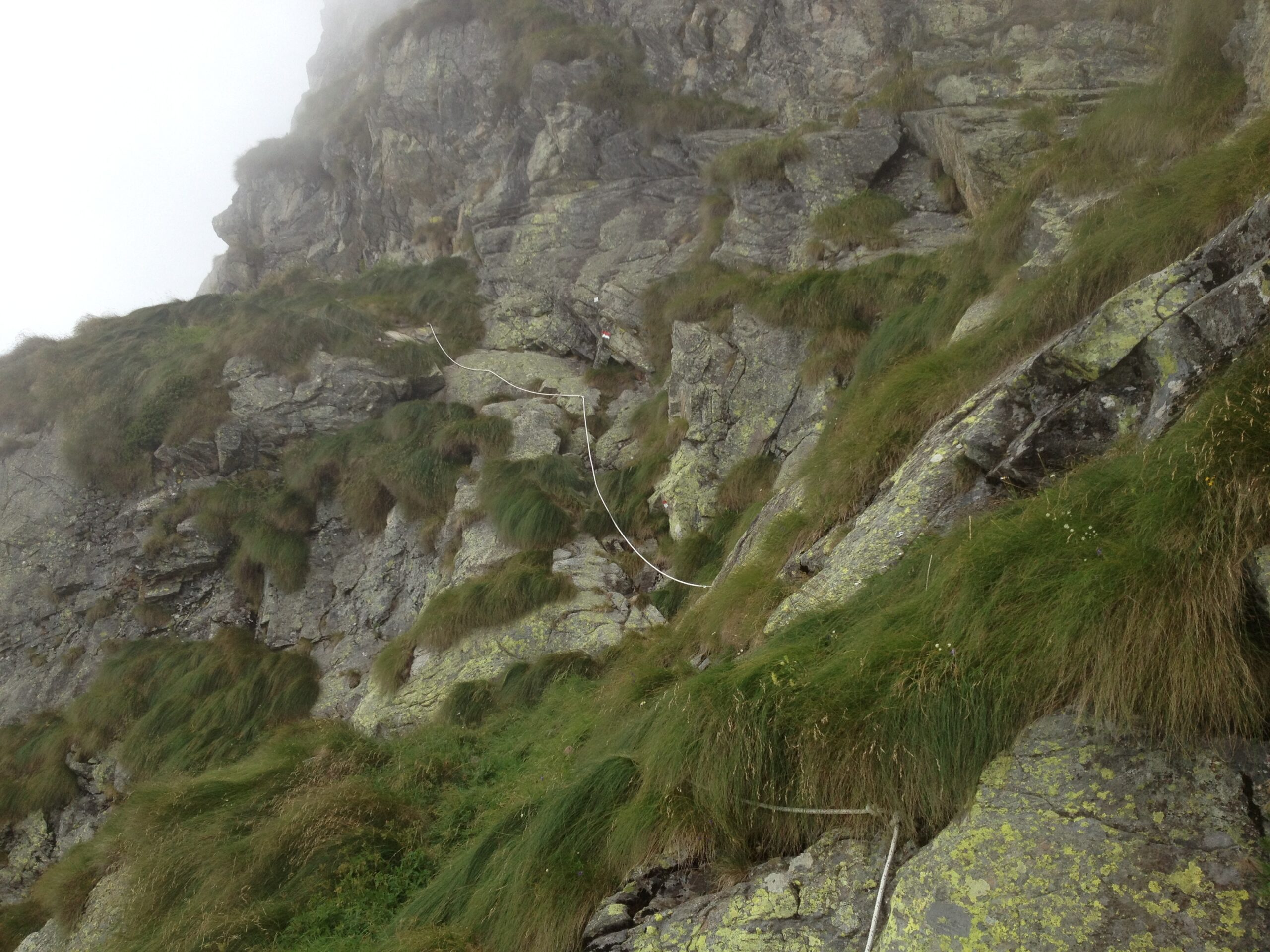 Da questo punto la traversata procede mantenendosi sostanzialmente alla medesima quota. Il sentiero è intuibile anche se abbondantemente inerbito (occhio alle scivolate se umido) ma sono sempre ben evidenti i segni rossi e bianchi rifatti di recente. Attraversando cenge e canaloni (con l’aiuto talvolta di corde fisse – tuttavia solo un passaggio un po’ delicato) si raggiunge l’altro lato del versante sud del Mucrone.