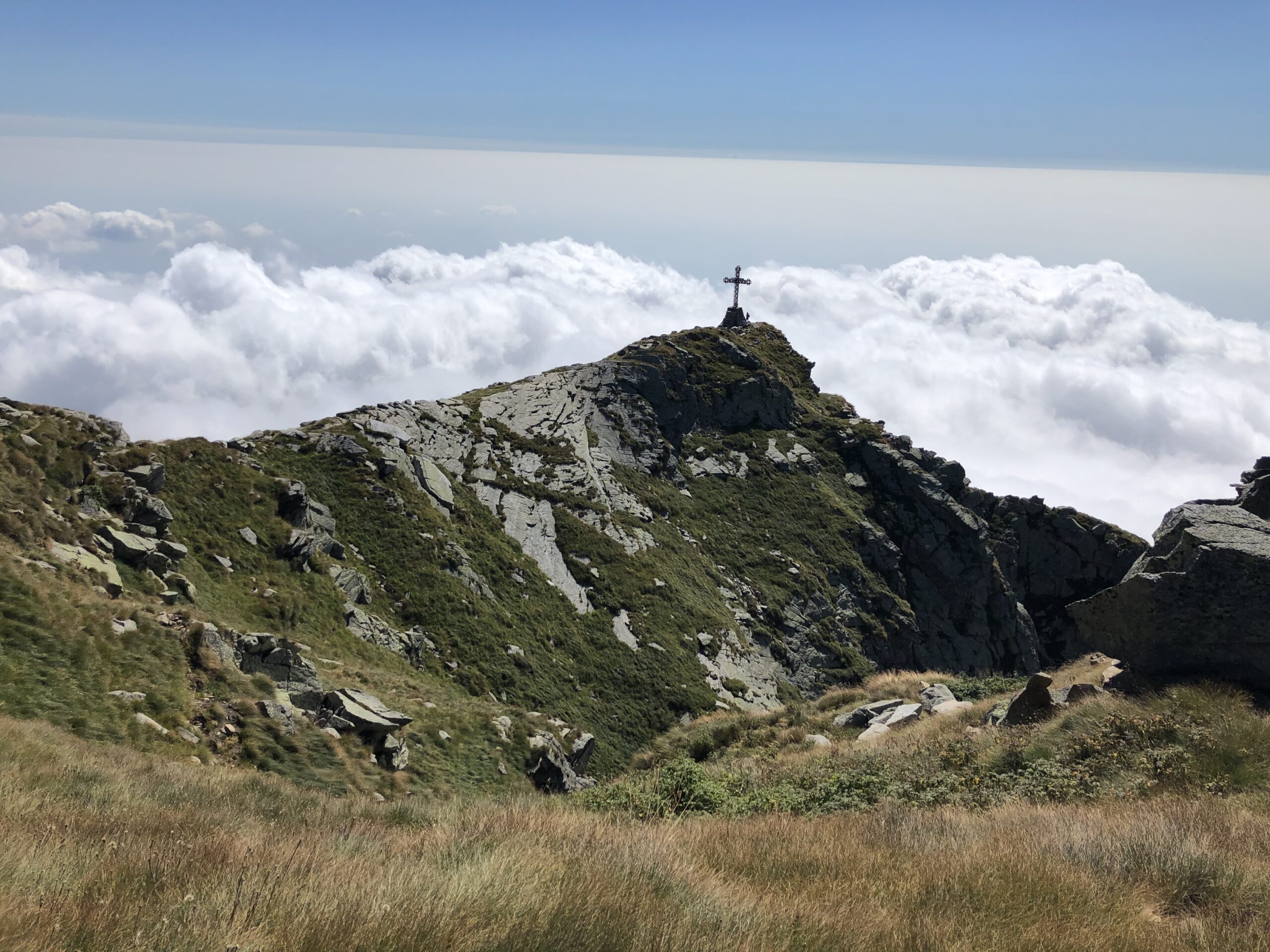 Qui la traccia si innalza a zig-zag fino a raggiungere il filo di una crestina rocciosa giunti alla quale si deve salire a destra (scritta Mucrone con freccia rossa su di una roccia – sentiero C19).