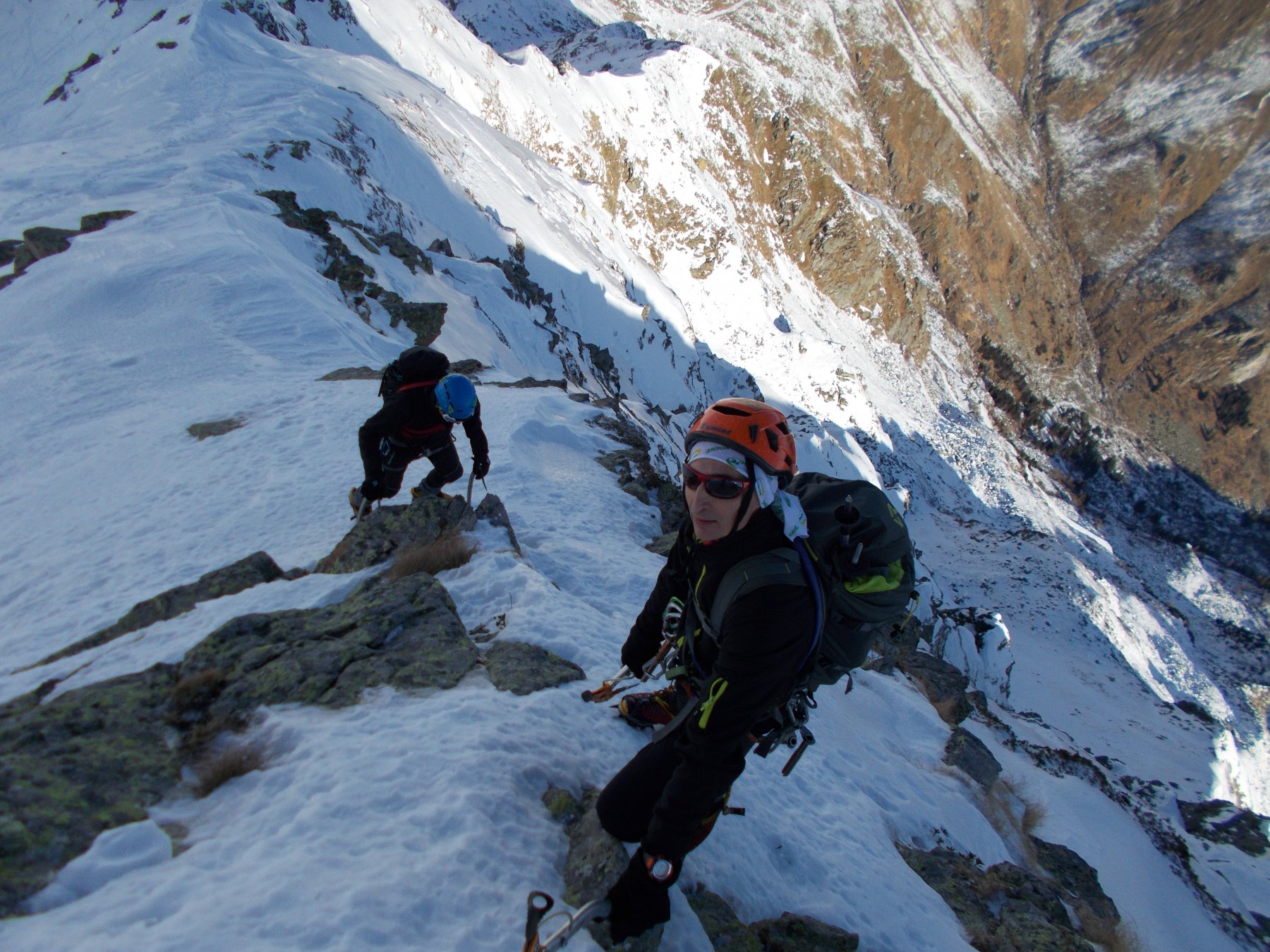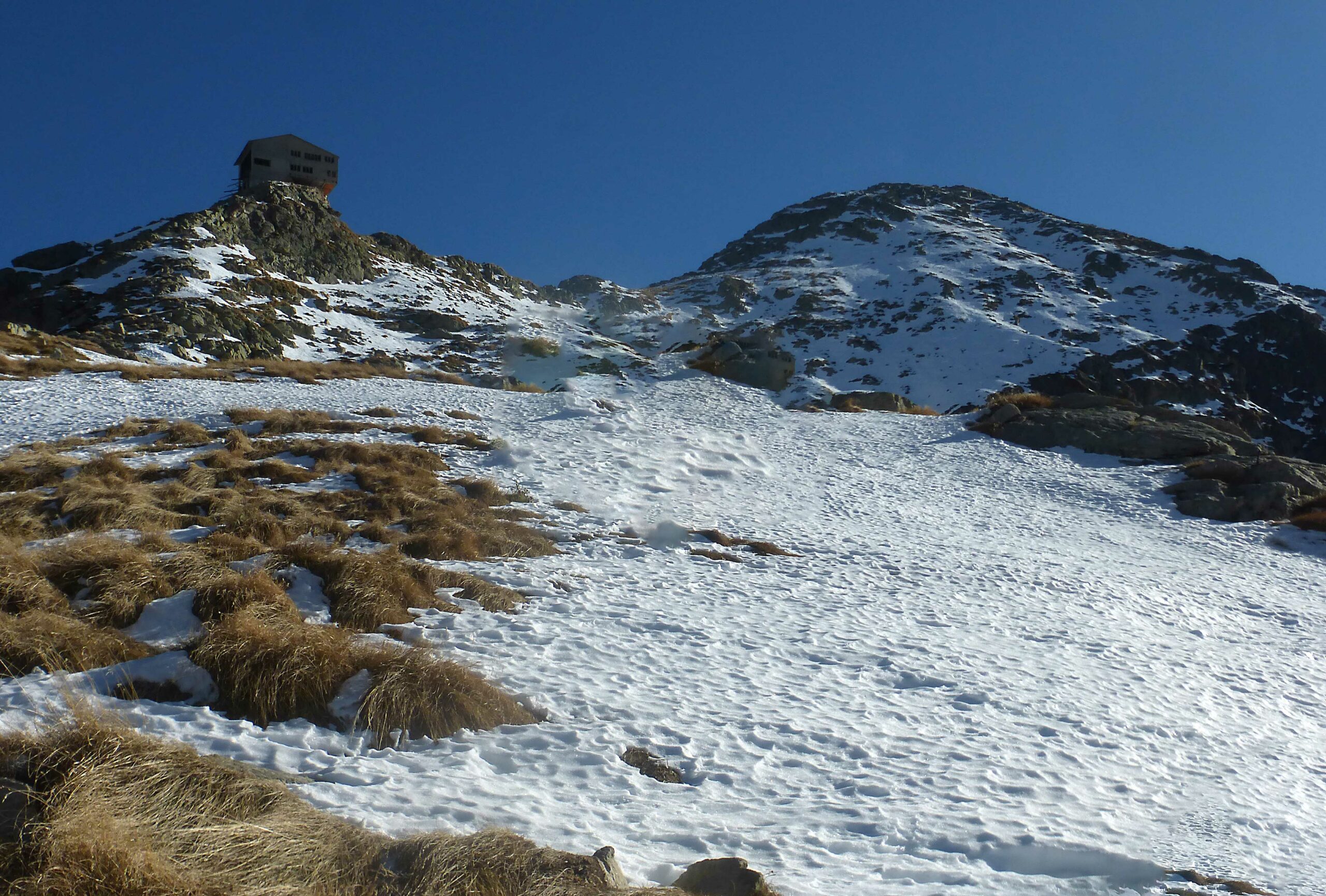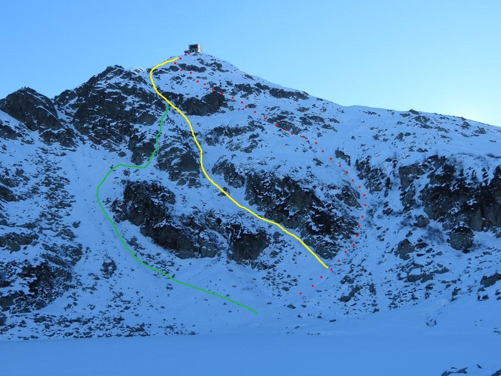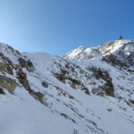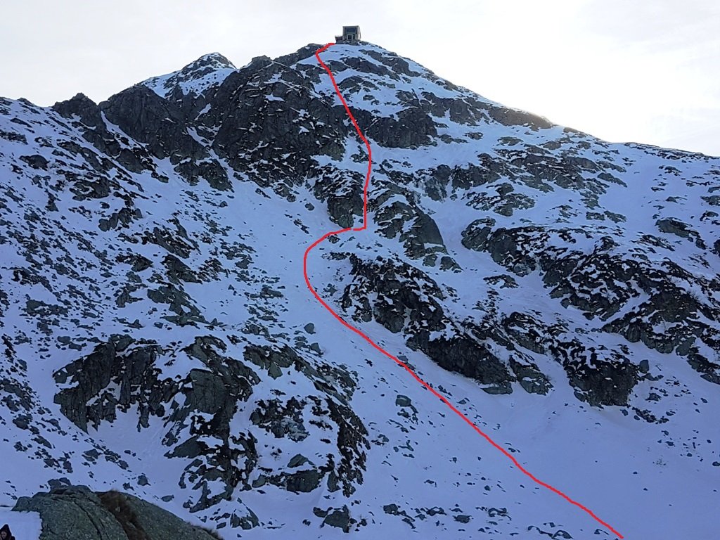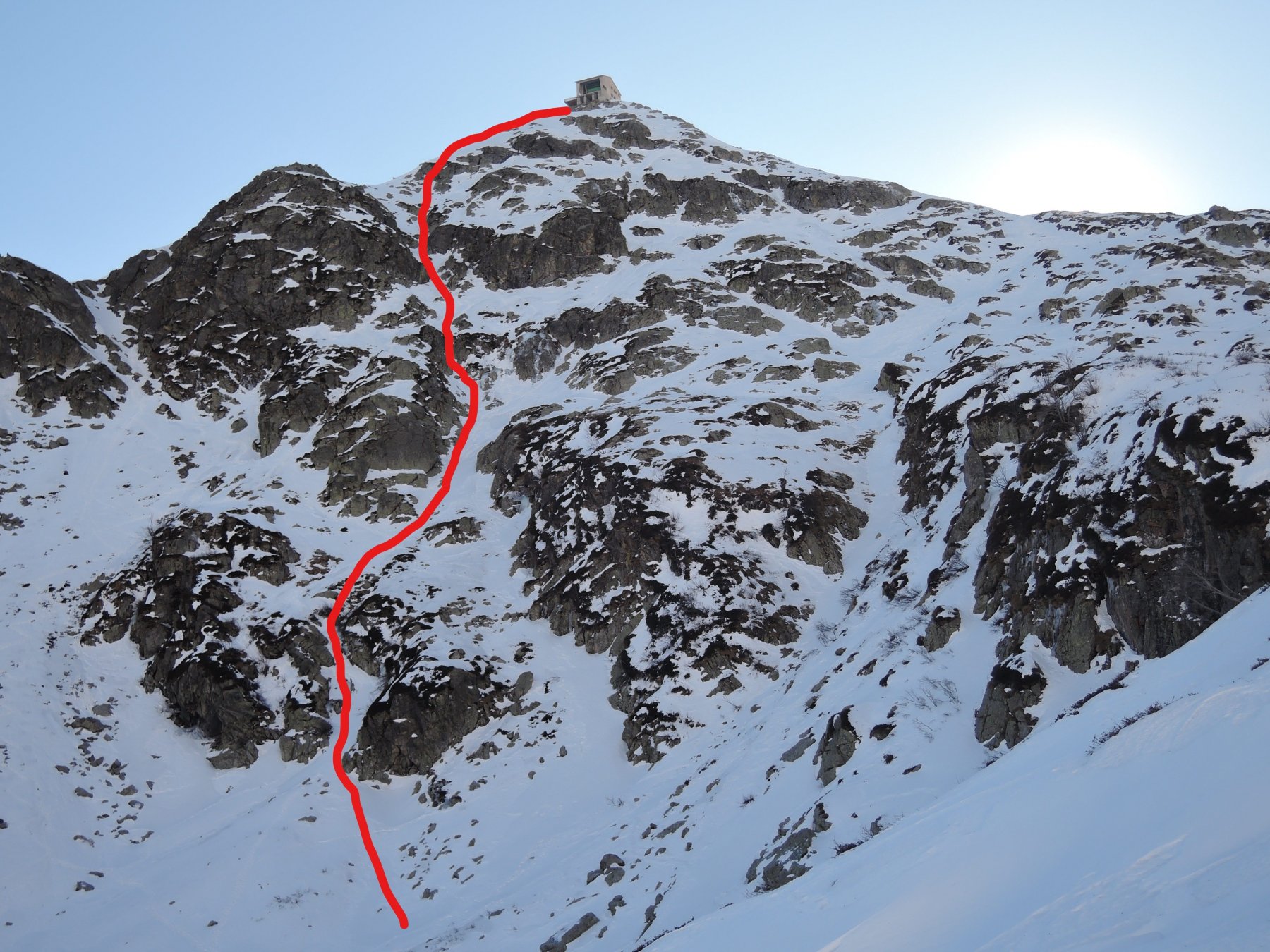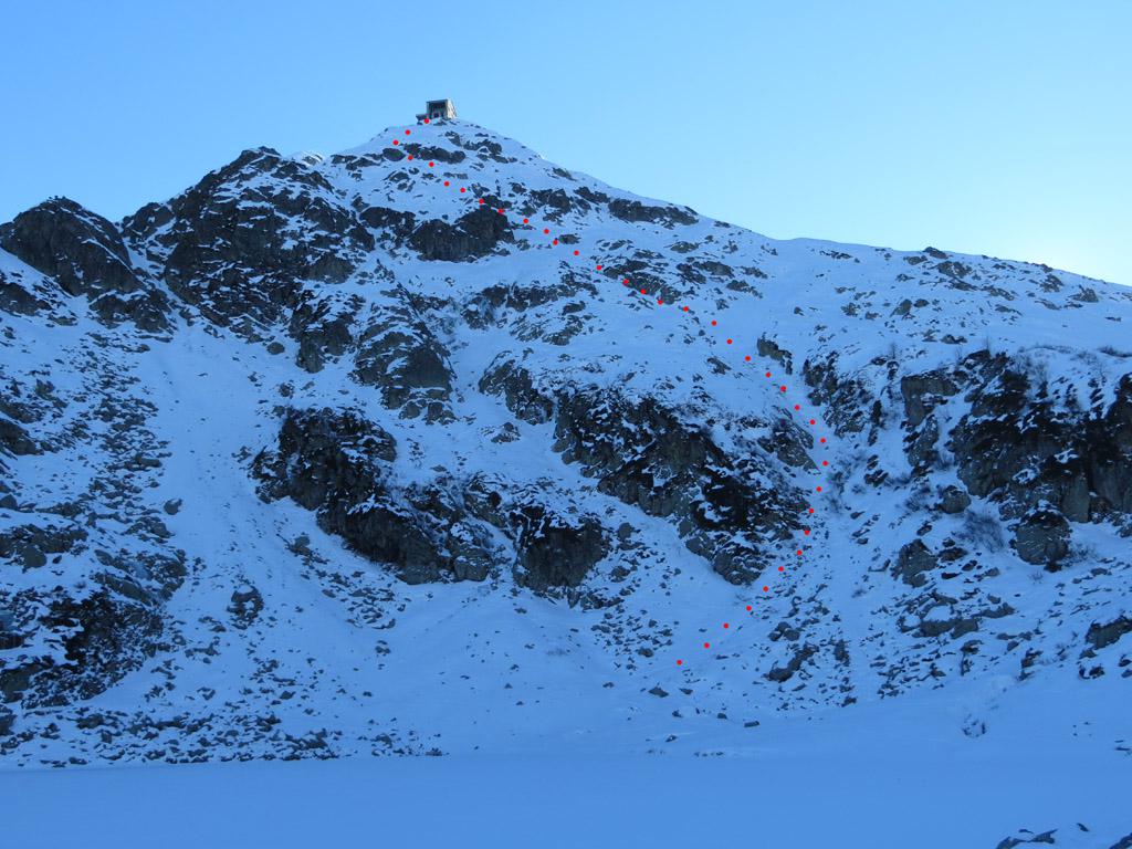 Ancora in diagonale ascendente verso sx di raggiunge l’ultimo risalto un po’ più delicato (misto o ghiaccio), che conduce al ripido pendio finale sotto la costruzione della vecchia seggiovia. Da qui si prosegue verso la cima seguendo la cresta NO.