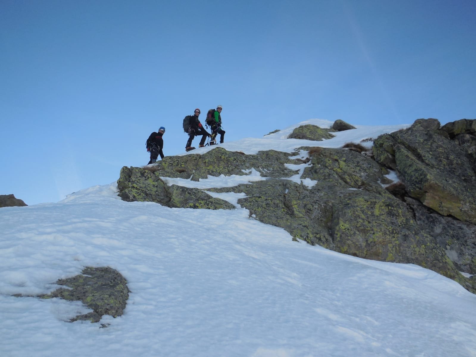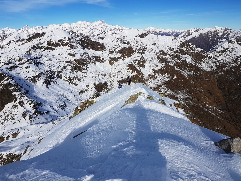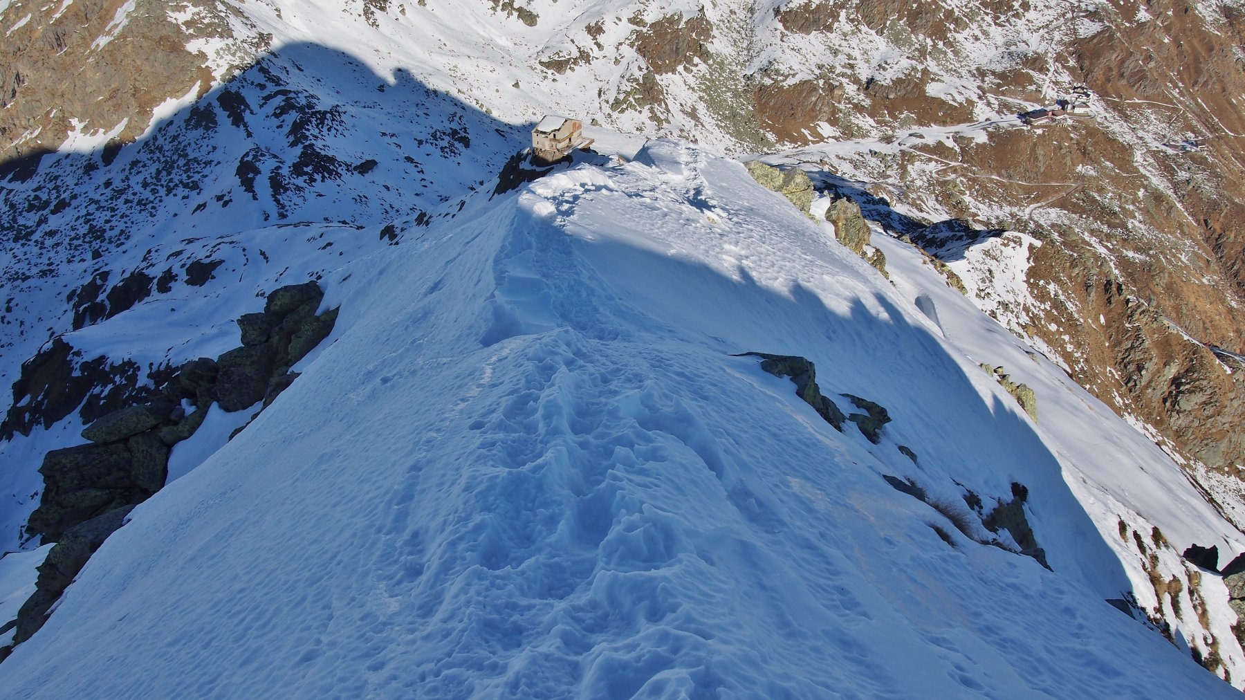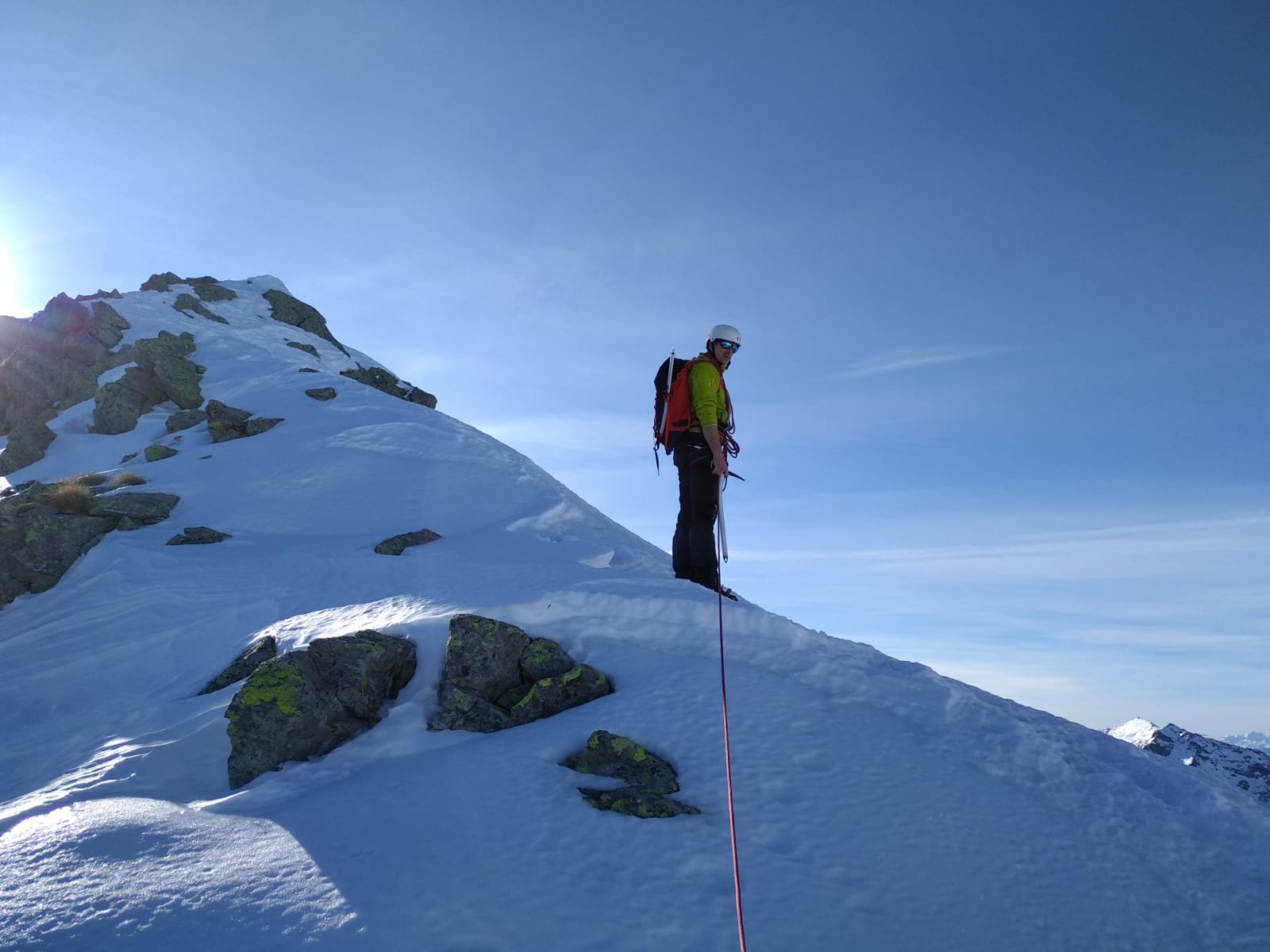 Ancora in diagonale ascendente verso sx di raggiunge l’ultimo risalto un po’ più delicato (misto o ghiaccio), che conduce al ripido pendio finale sotto la costruzione della vecchia seggiovia. Da qui si prosegue verso la cima seguendo la cresta NO.