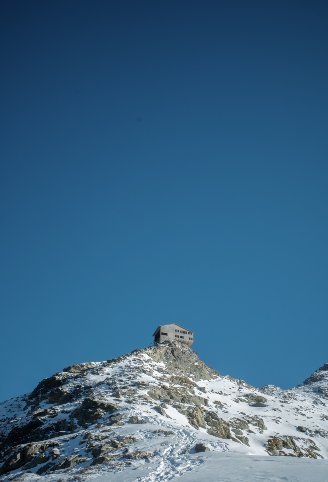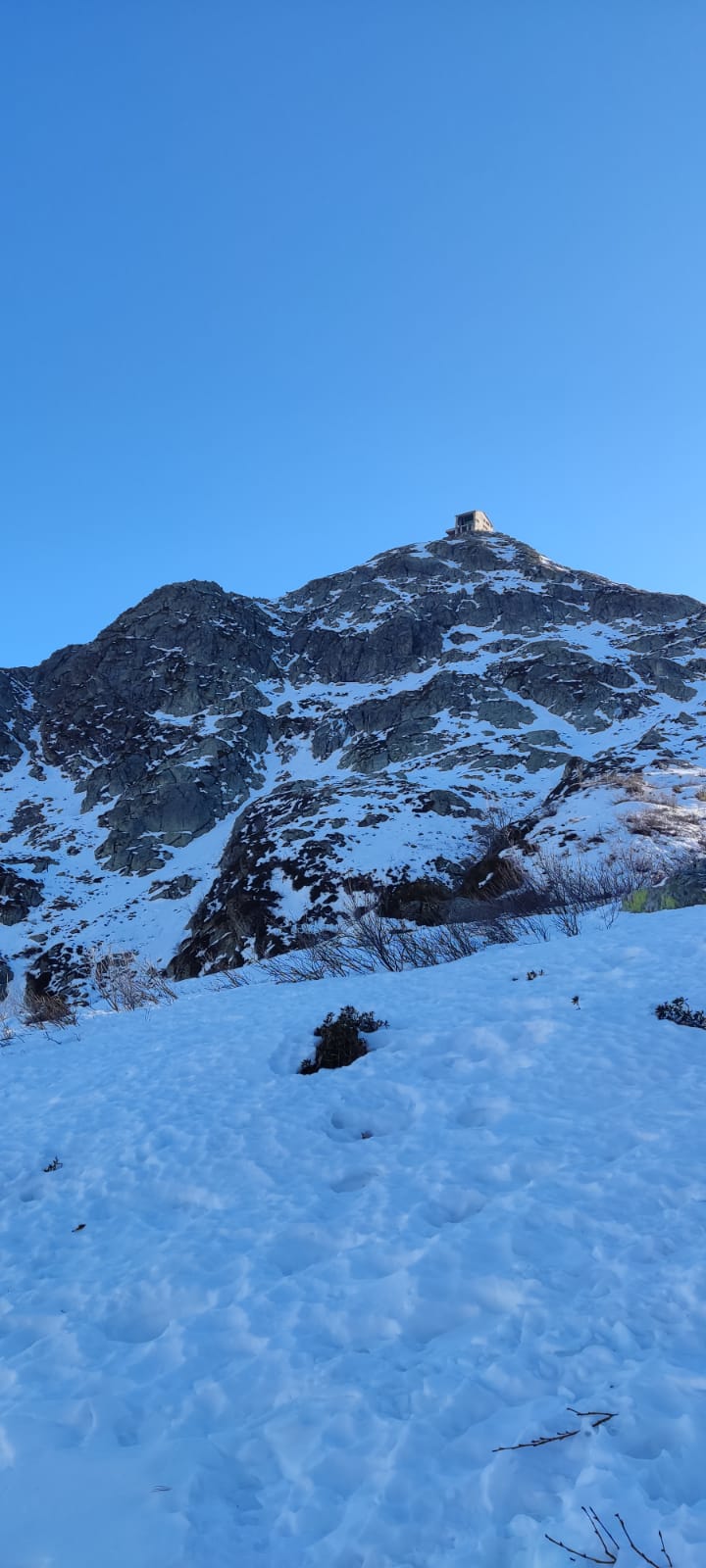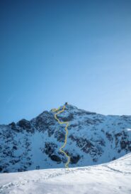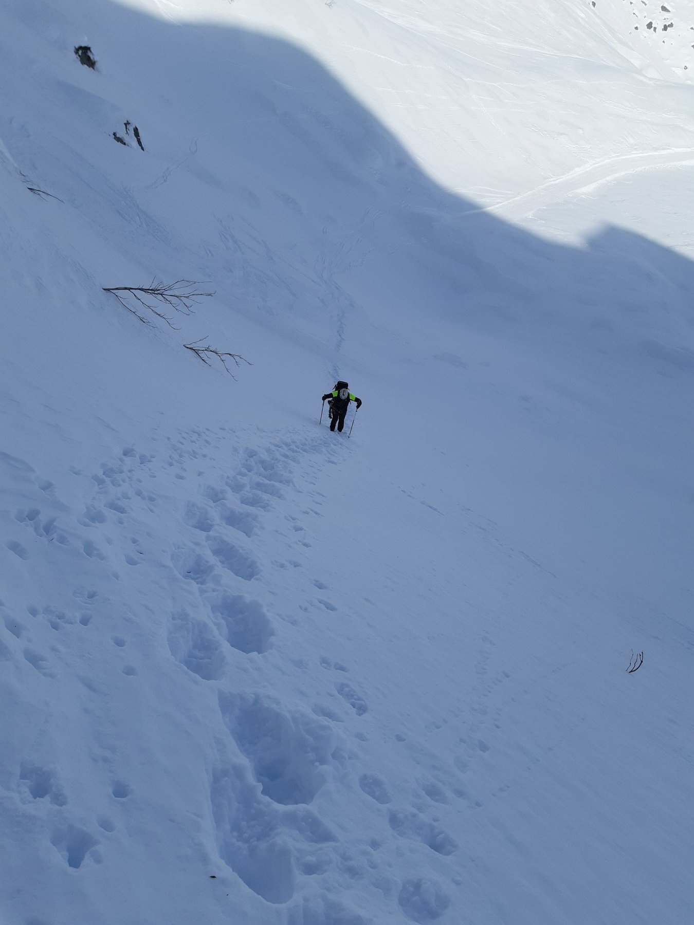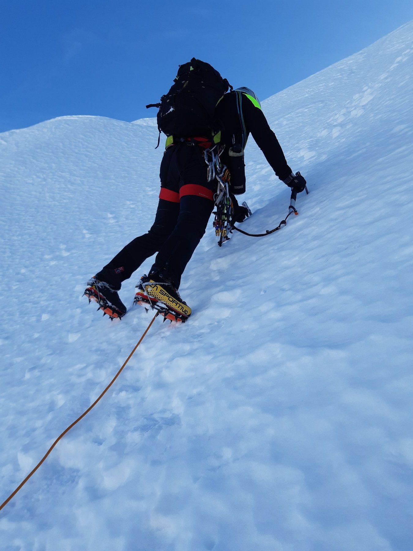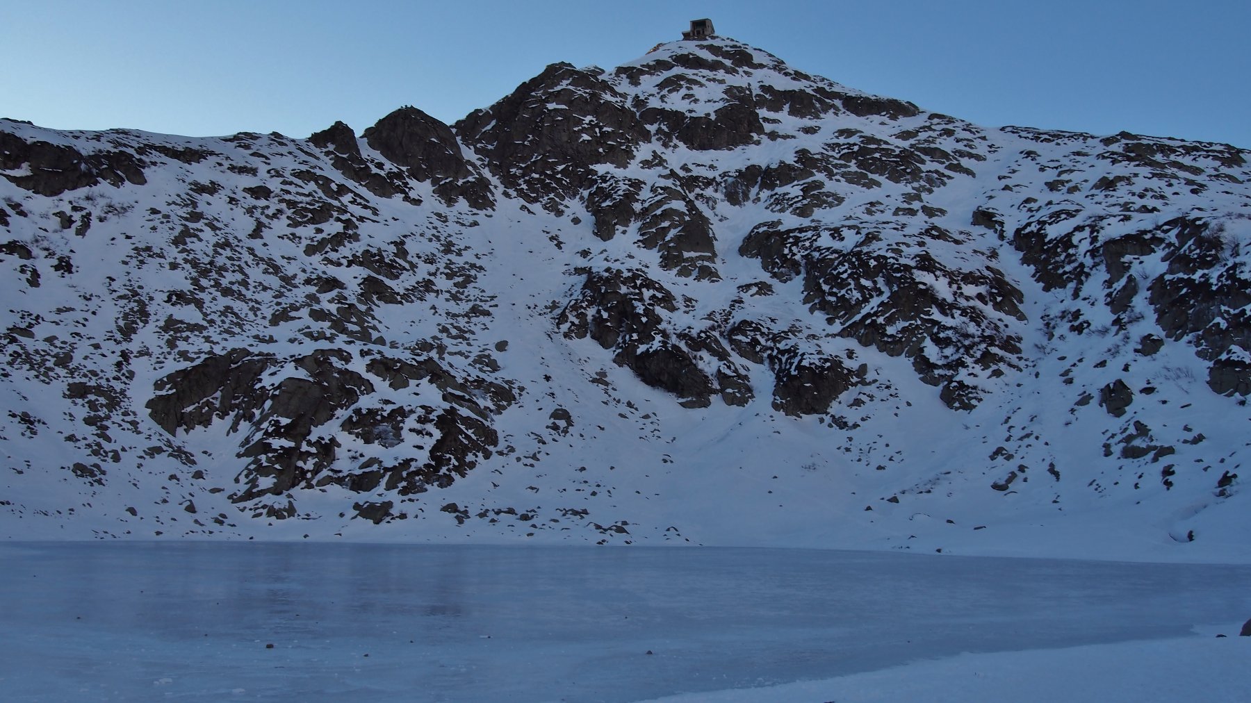 Ancora in diagonale ascendente verso sx di raggiunge l’ultimo risalto un po’ più delicato (misto o ghiaccio), che conduce al ripido pendio finale sotto la costruzione della vecchia seggiovia. Da qui si prosegue verso la cima seguendo la cresta NO.