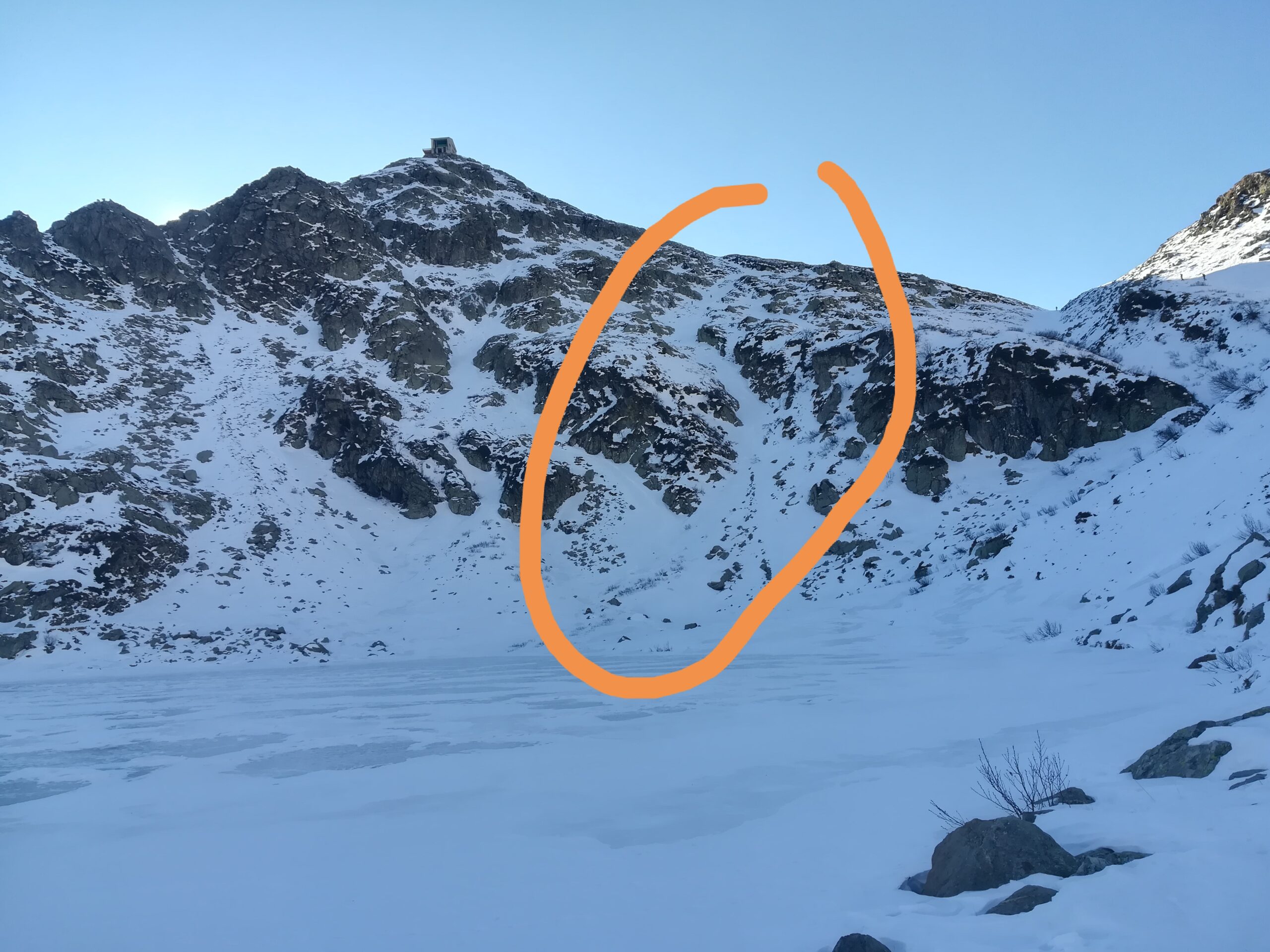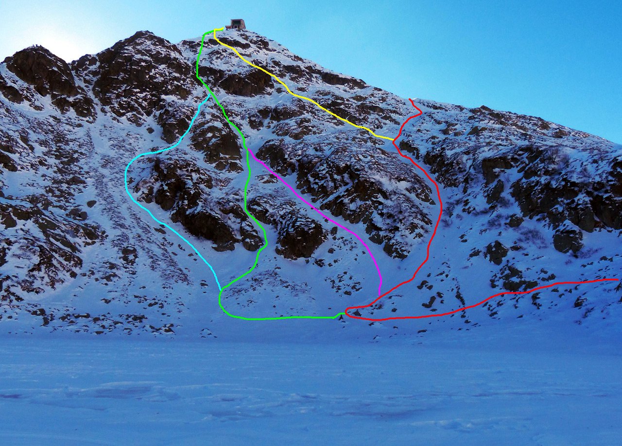 Dal lago sono possibili altre linee di salita più a sx (est), leggermente più impegnative anche a seconda delle condizioni (ghiaccio o misto) del momento, fra le quali si segnala il “canale nord”, immediatamente a dx della via “Aspettando Nessi”, oppure il canalino fra questa e la recente “Topovia” che interseca Nessi e si unisce al precedente.