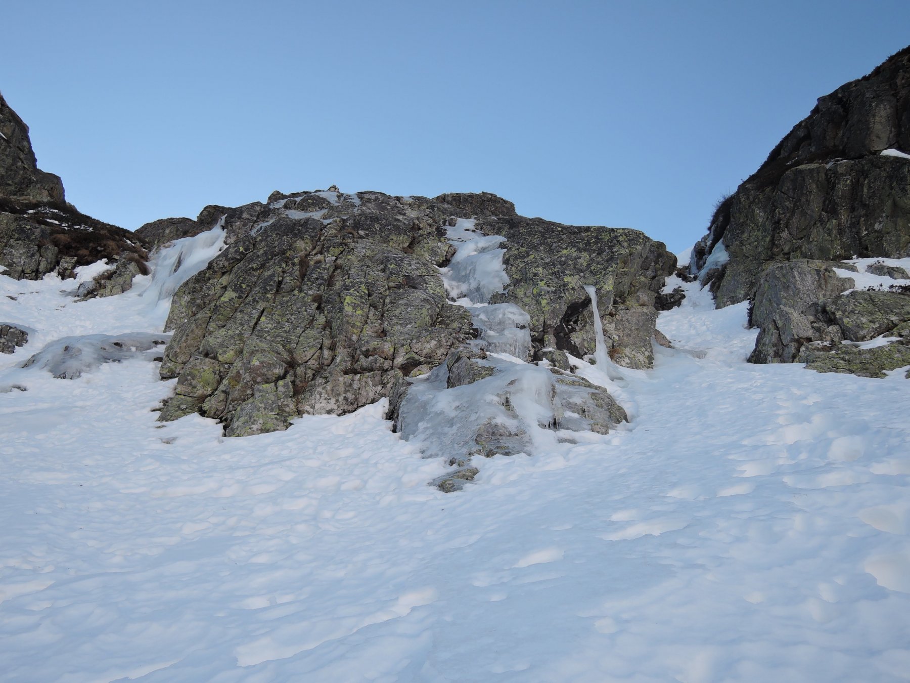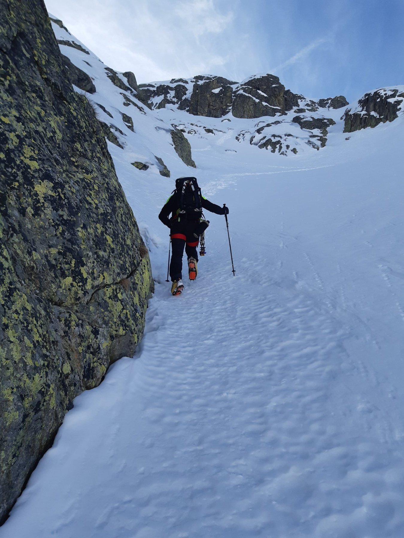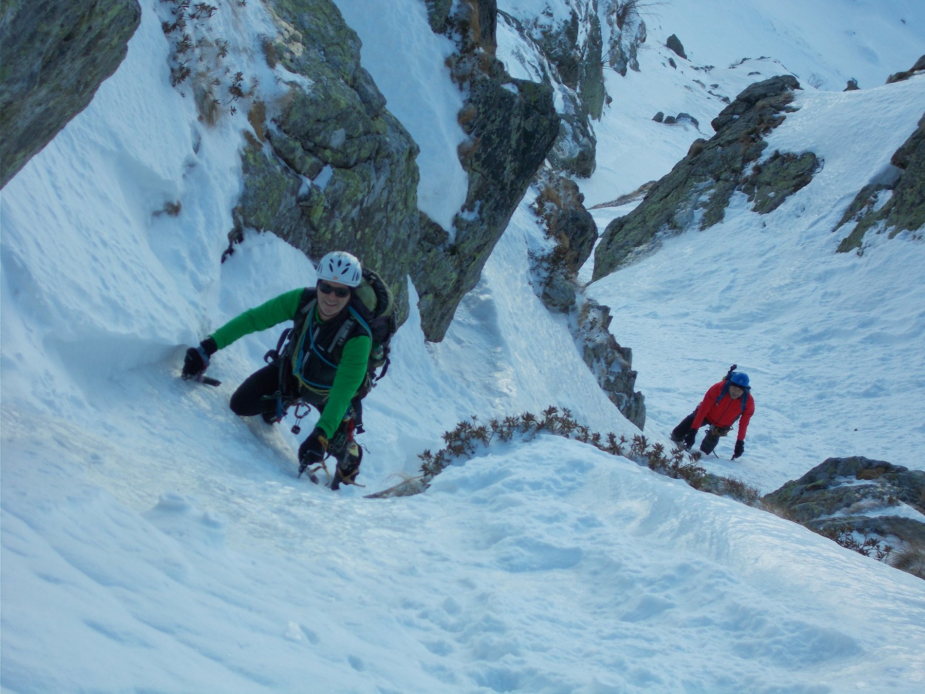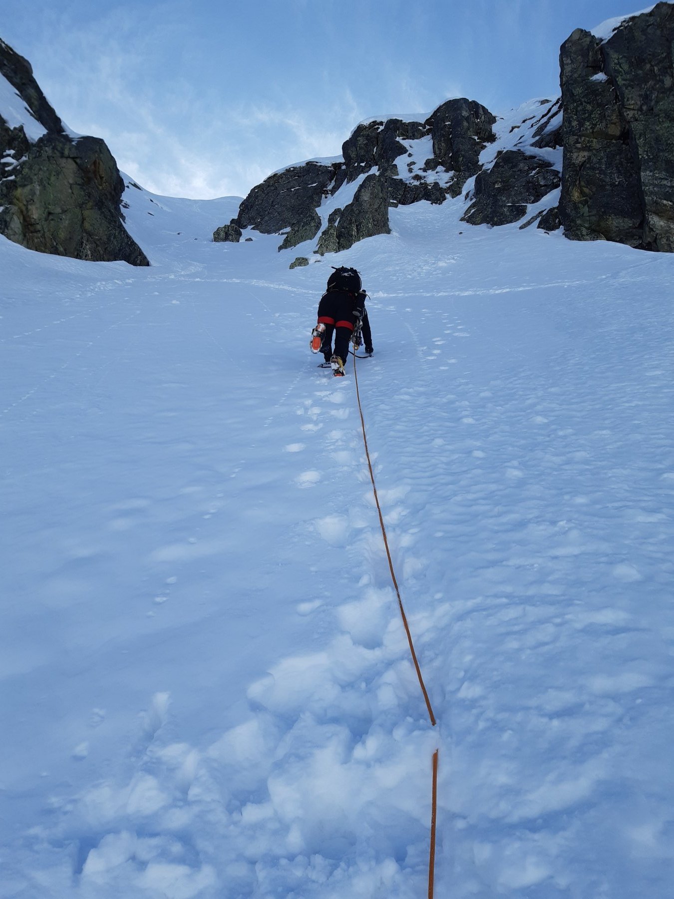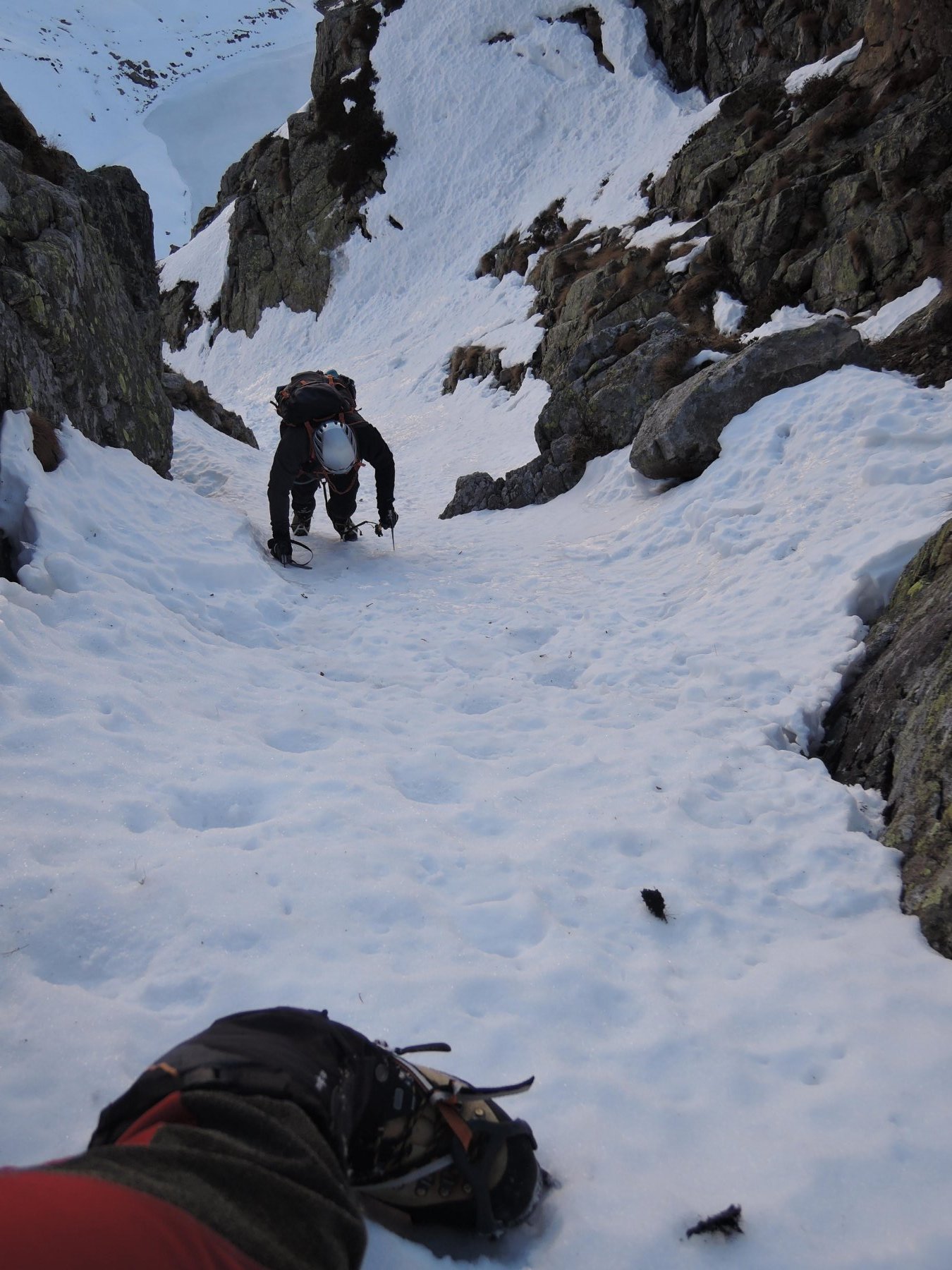 Risalirlo per metà della sua lunghezza (30-35°, max 40), quindi, dopo un restringimento, abbandonarlo e piegare a sx per imboccare una rampa che porta ad una strettoia dove si trova un salto roccioso (misto o ghiaccio). Si esce su un lenzuolo, si prosegue in diagonale verso sx verso un secondo risalto (45°) e, successivamente, ad un secondo pendio.