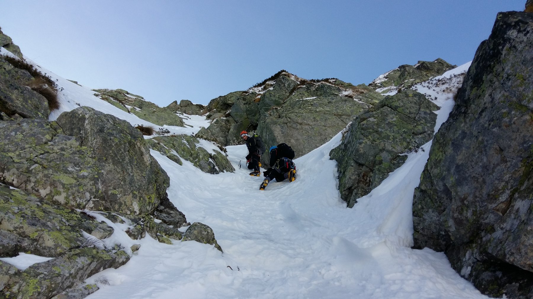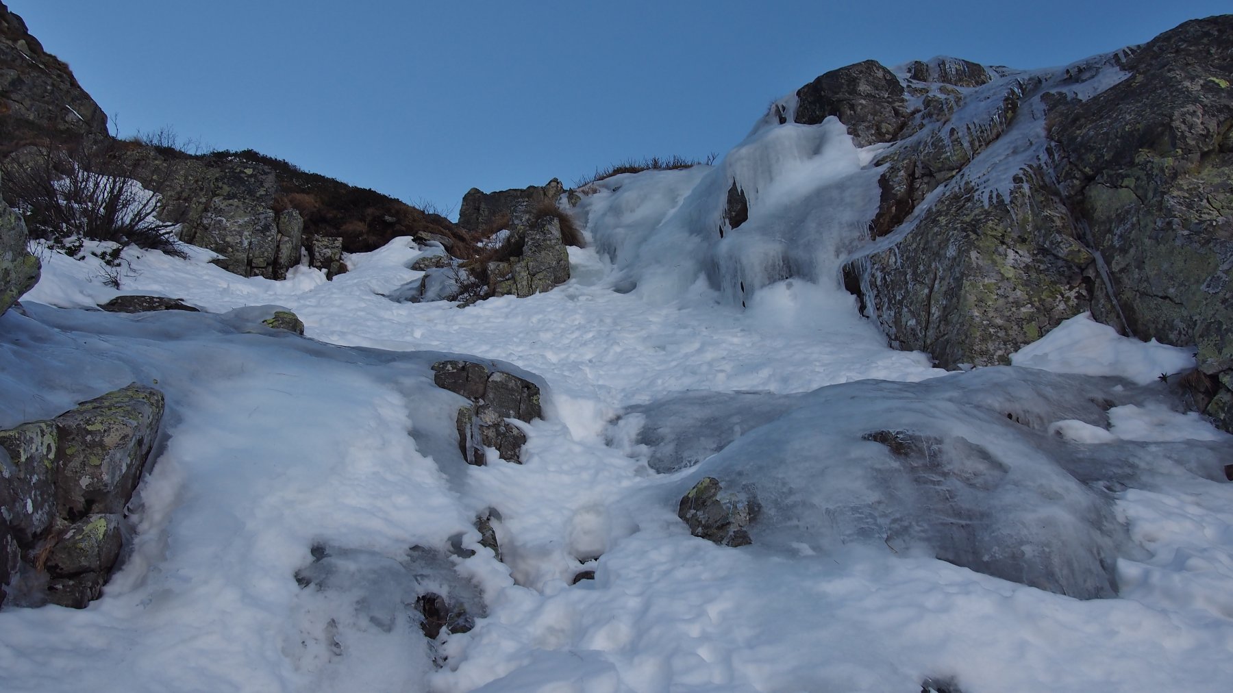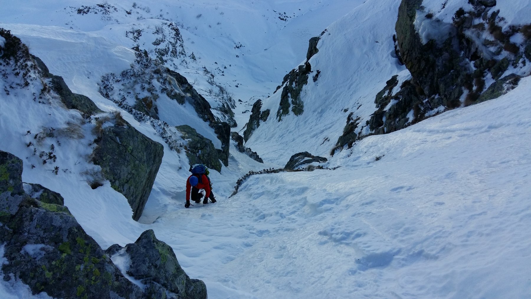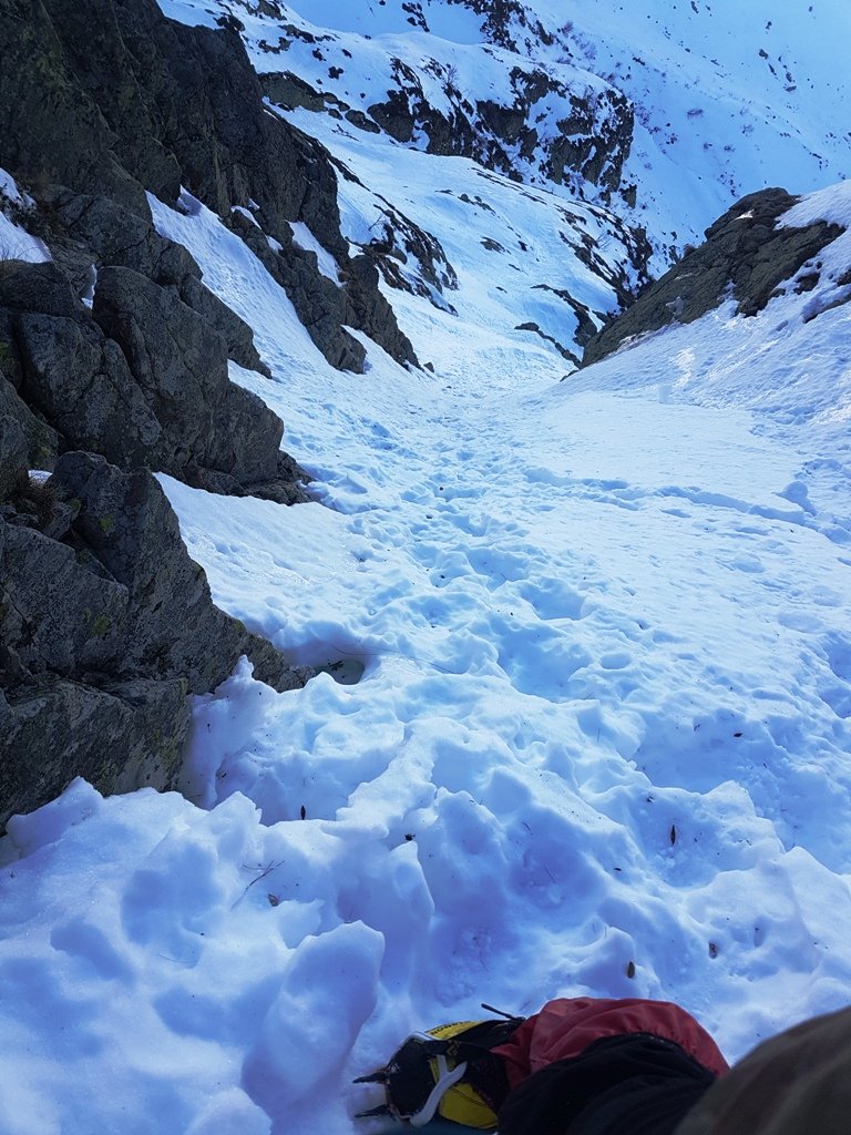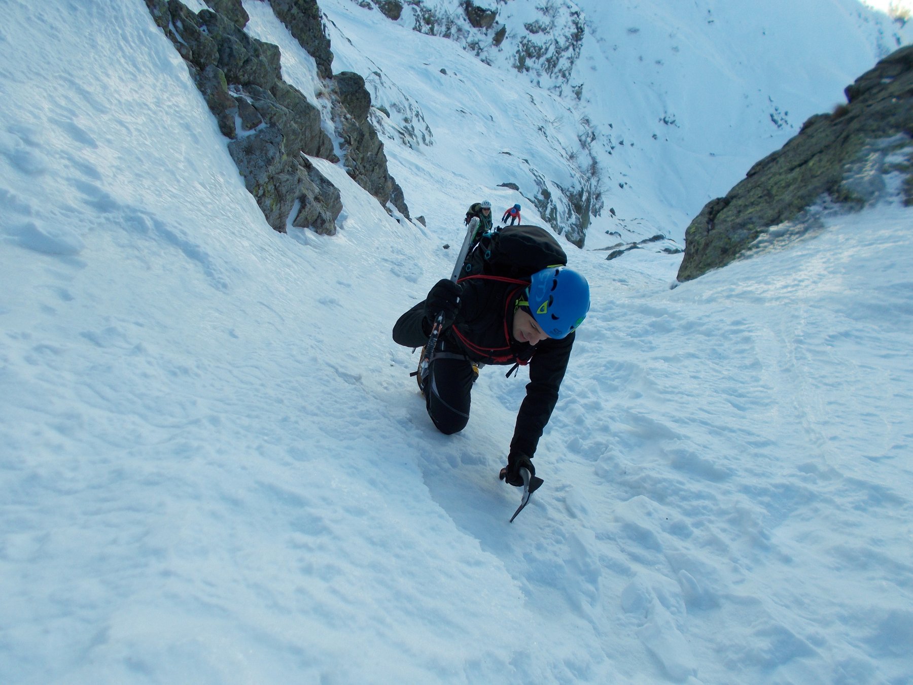 Risalirlo per metà della sua lunghezza (30-35°, max 40), quindi, dopo un restringimento, abbandonarlo e piegare a sx per imboccare una rampa che porta ad una strettoia dove si trova un salto roccioso (misto o ghiaccio). Si esce su un lenzuolo, si prosegue in diagonale verso sx verso un secondo risalto (45°) e, successivamente, ad un secondo pendio.