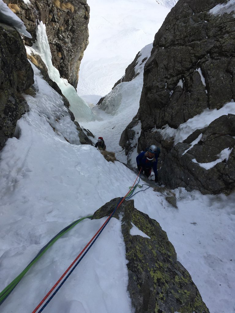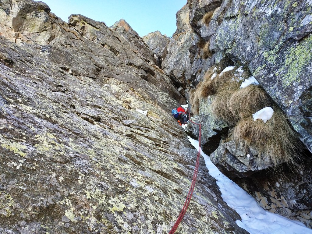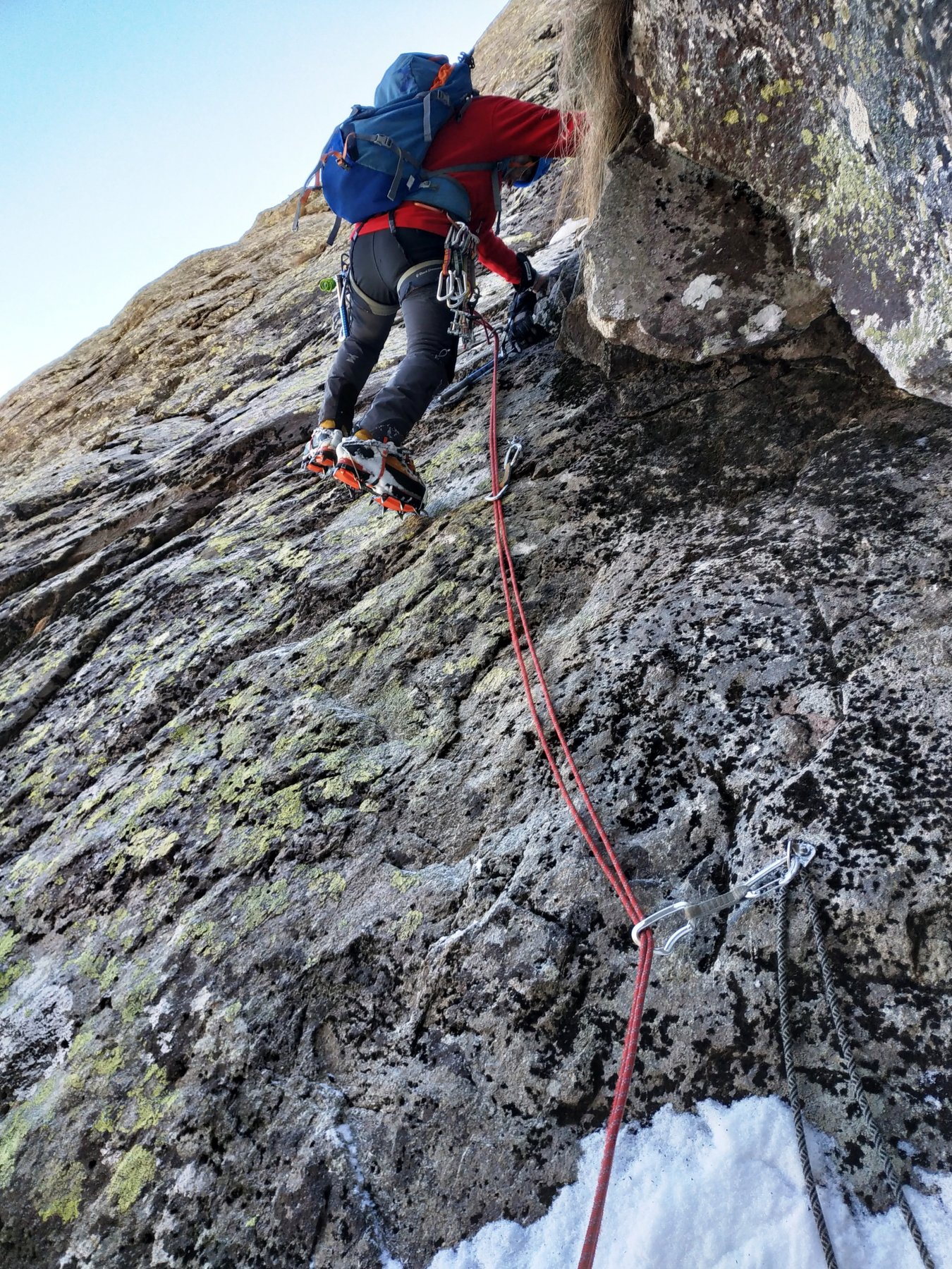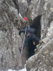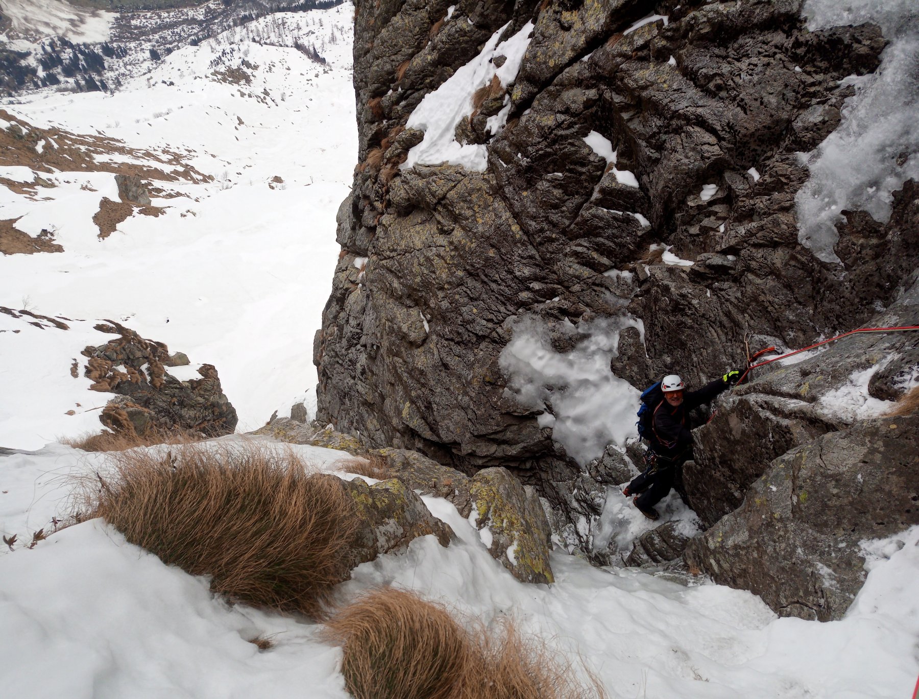 - L4, M5, neve 50°-60°, 50 metri: su per tratto subito leggermente strapiombante, e altro tratto verticale. Si continua per canale più appoggiato ma incassato e con roccia lisciata. E’ possibile evitare una sosta e proseguire alla successiva.