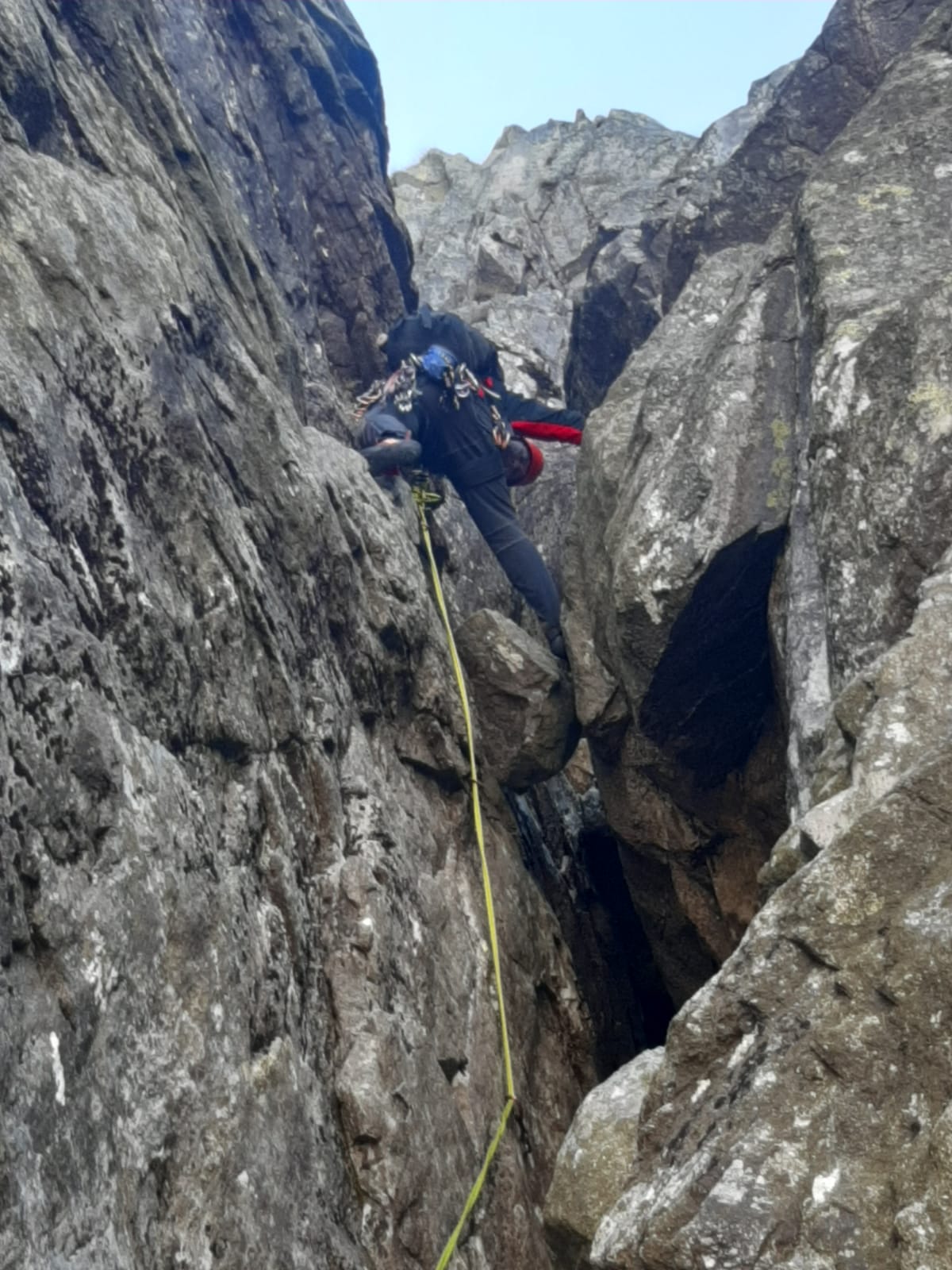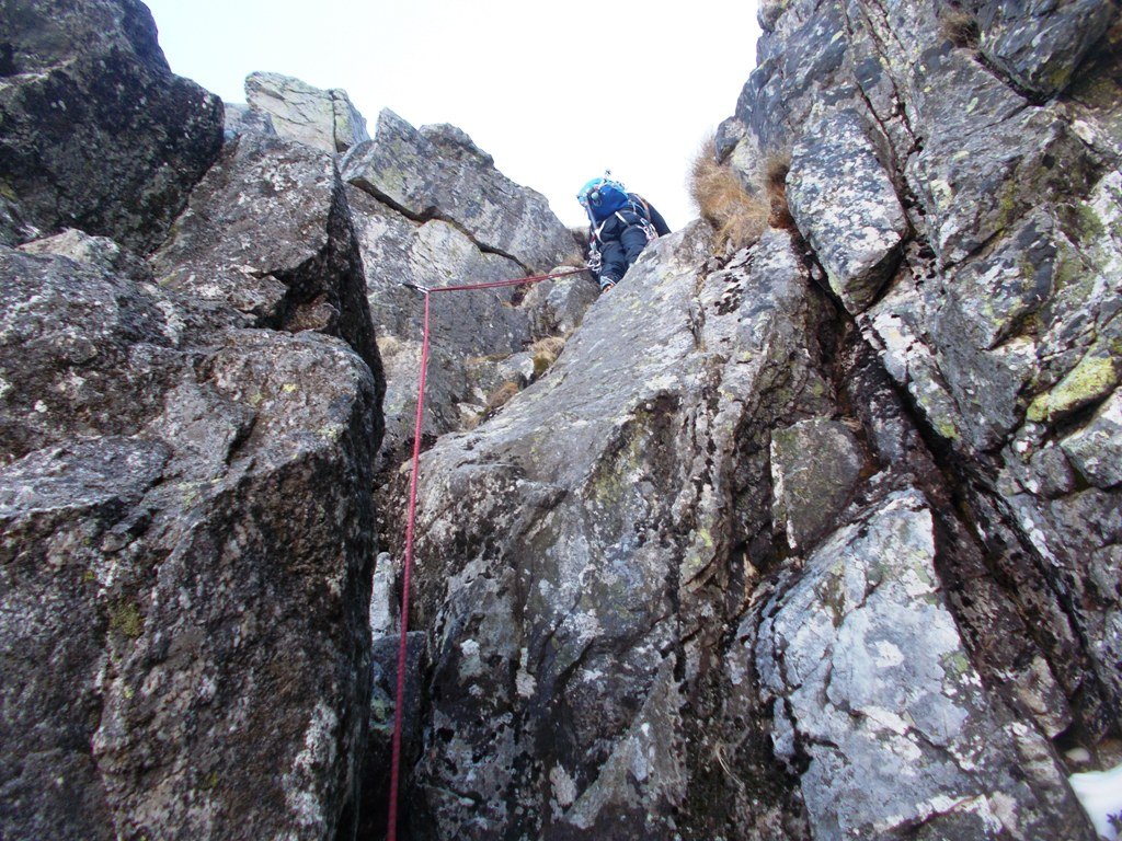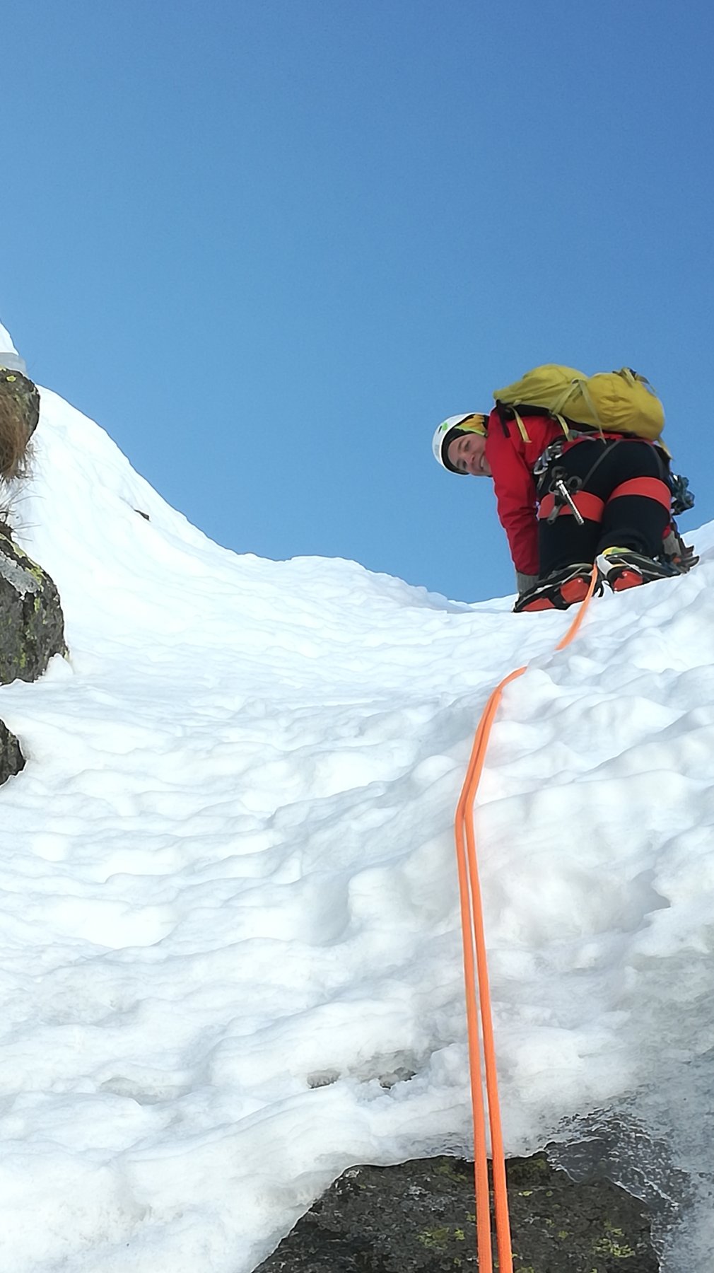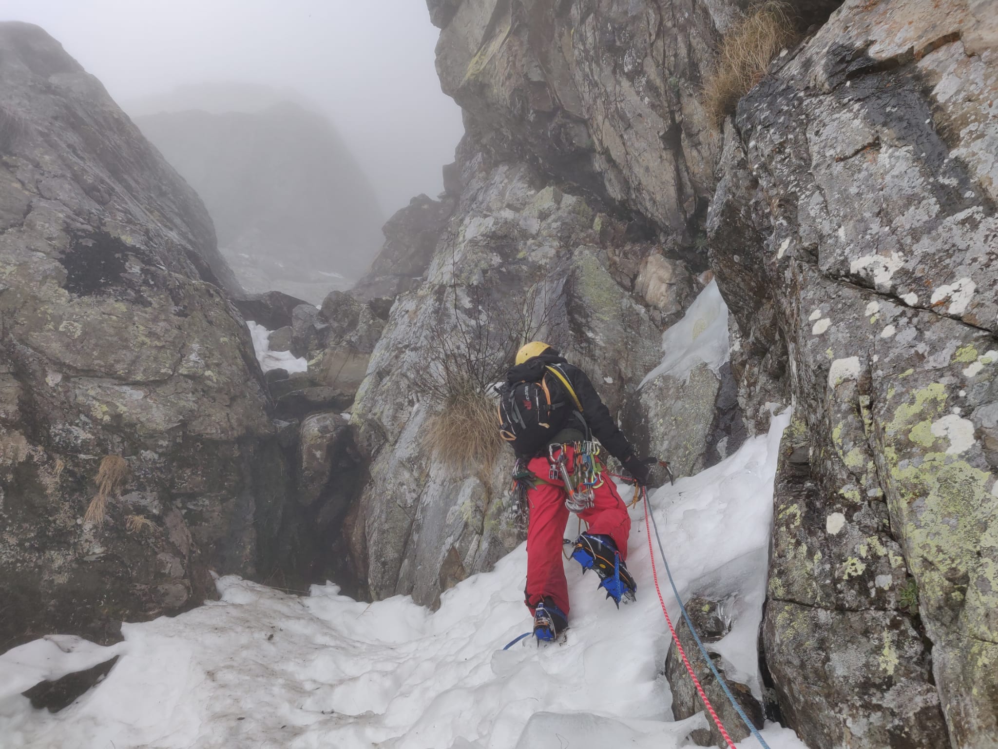- L4, M5, neve 50°-60°, 50 metri: su per tratto subito leggermente strapiombante, e altro tratto verticale. Si continua per canale più appoggiato ma incassato e con roccia lisciata. E’ possibile evitare una sosta e proseguire alla successiva.