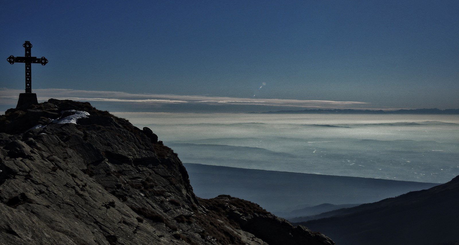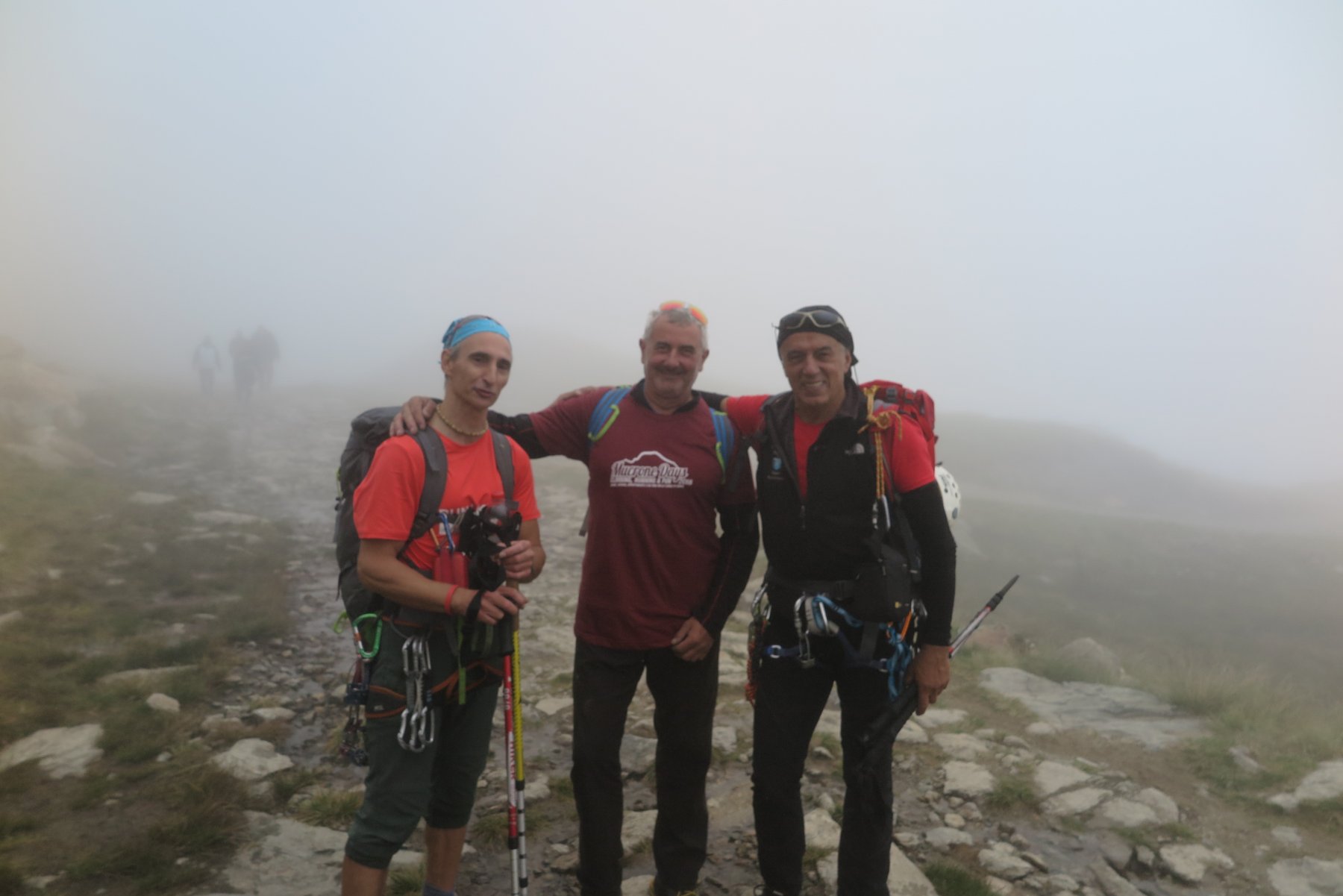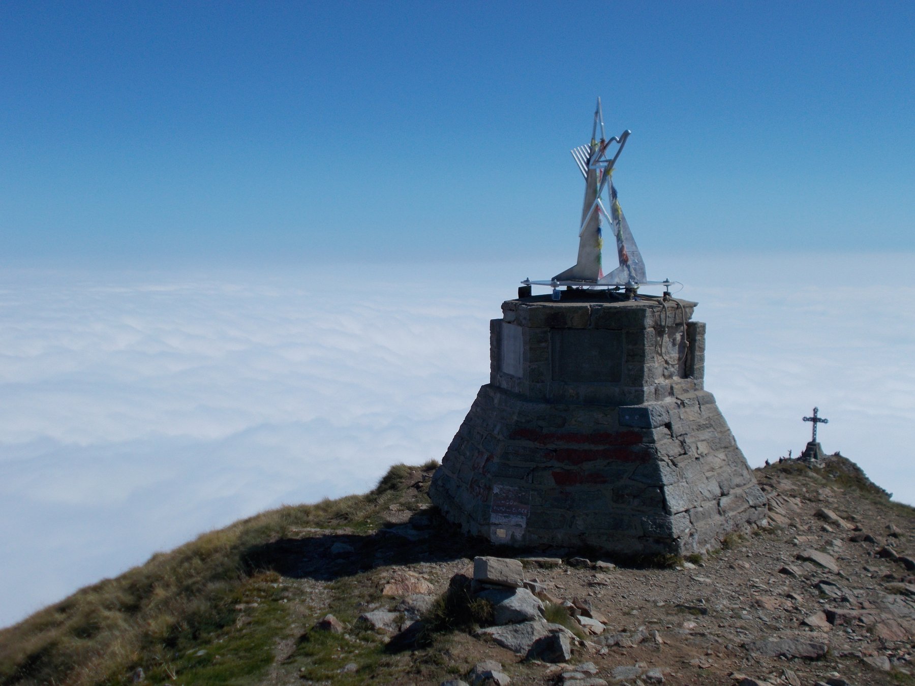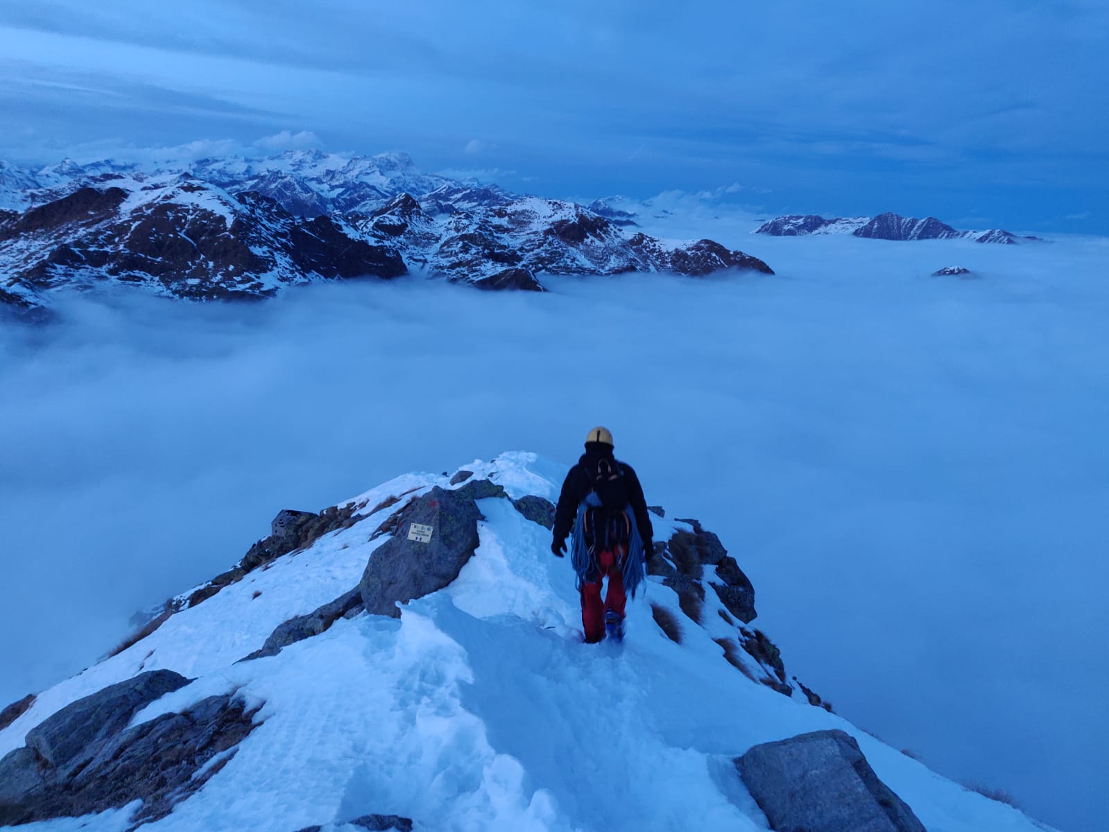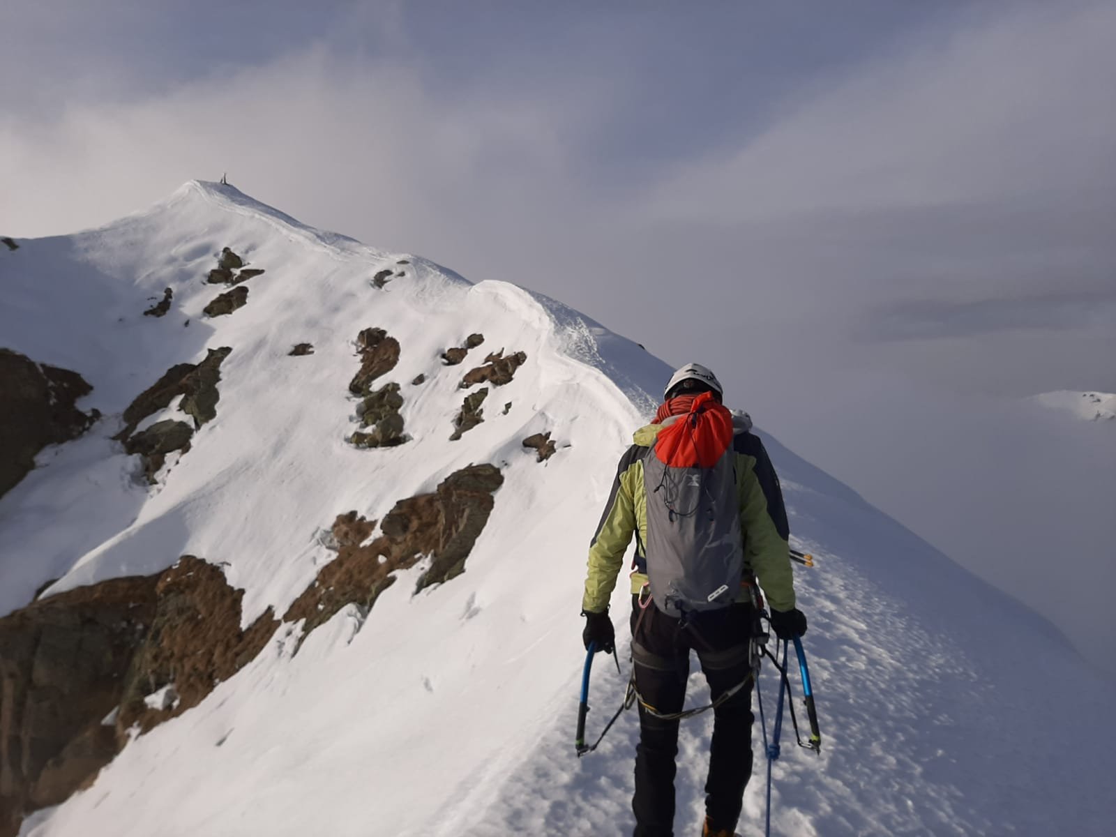 - L8, pendii 40°-50°, circa 150 metri: continuare sul terreno nevoso dei pendii sommitali, verso sinistra a doppiare un roccione, e poi dritto e ancora in obliquo verso sinistra fino a sbucare sul crestone poco prima della croce di vetta, che si trova a destra. Continuando per crestone si arriva alla vetta principale, con altra croce.