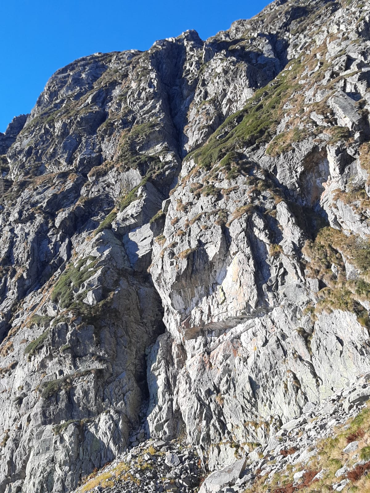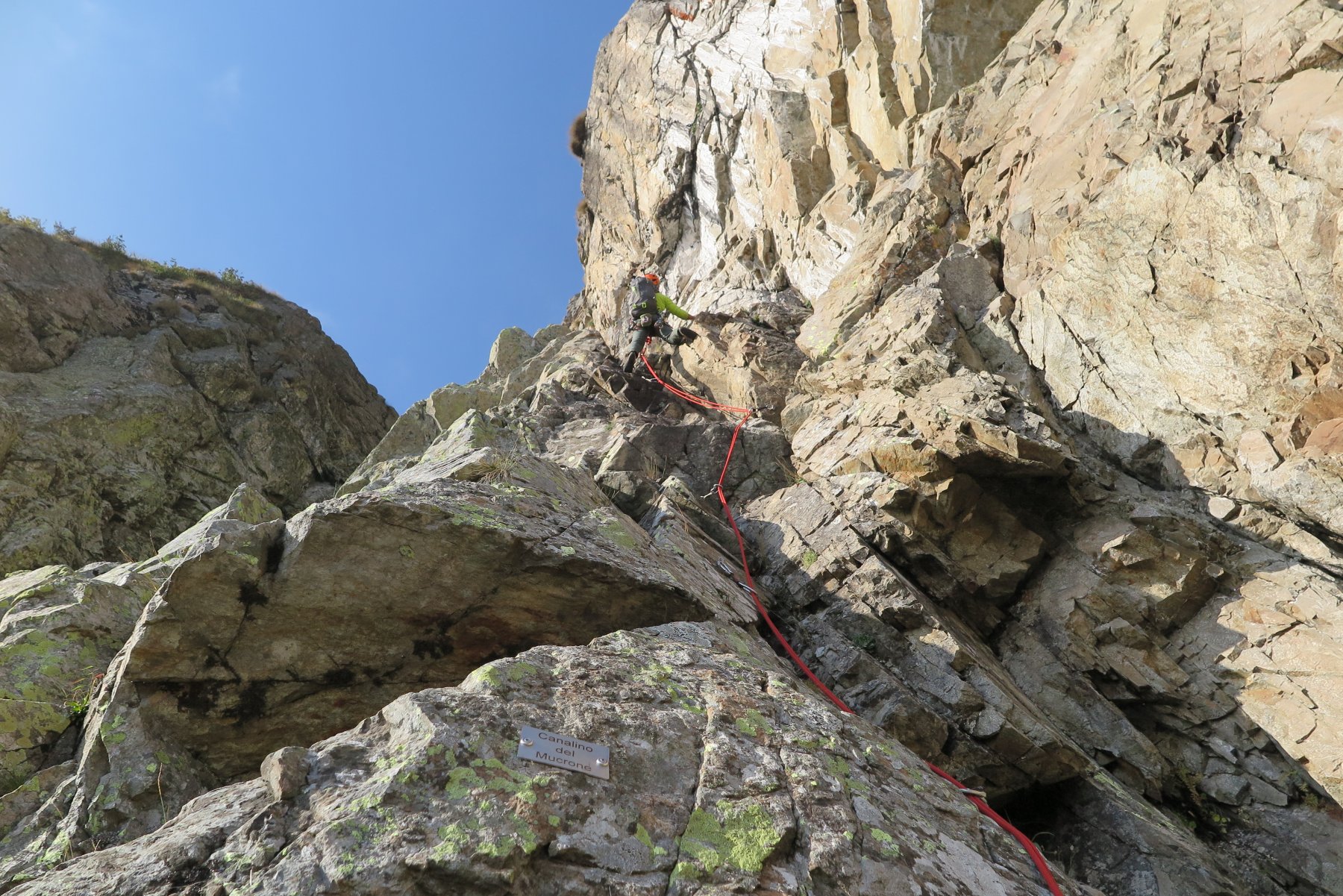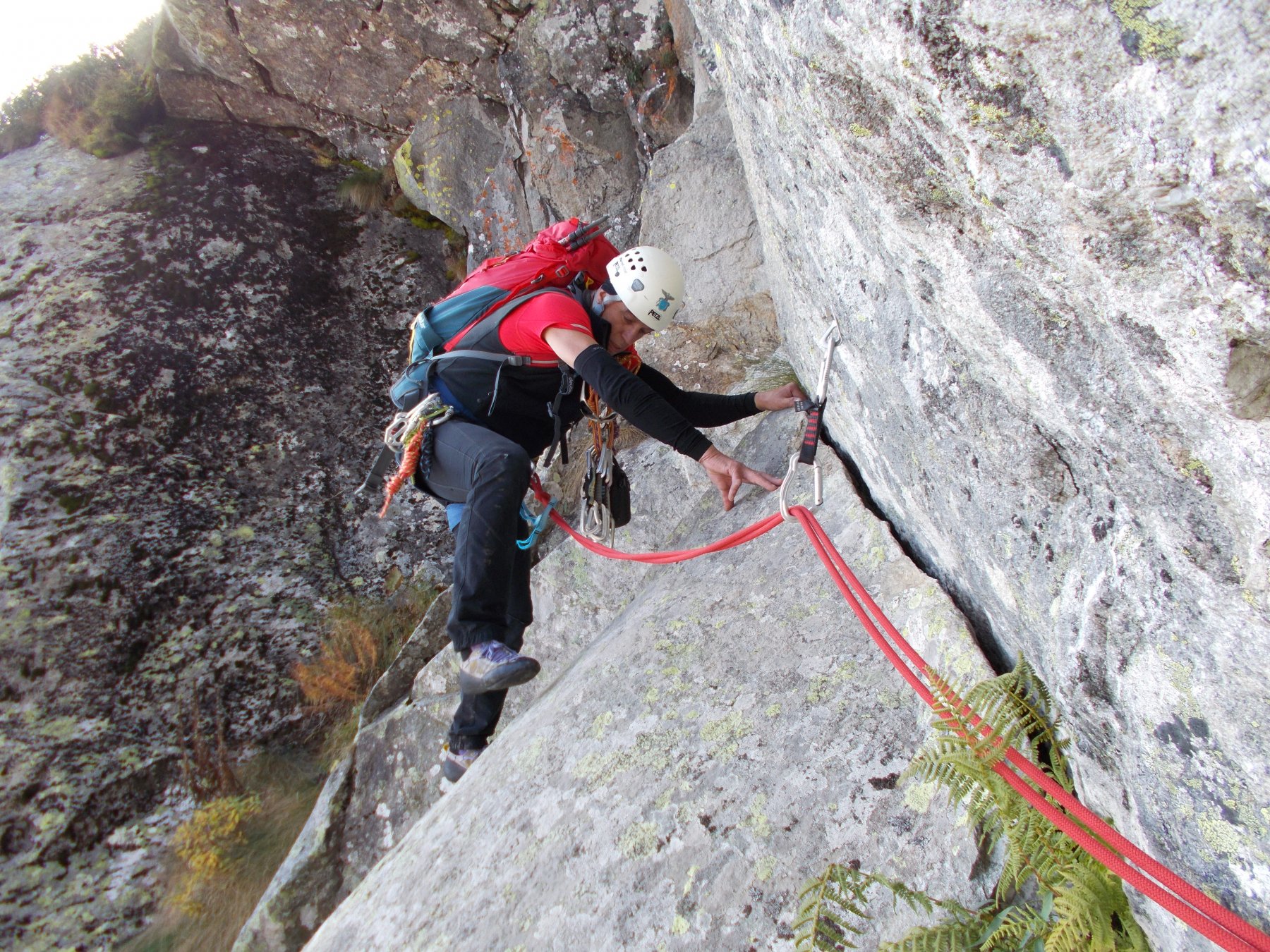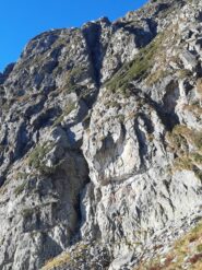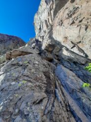 - L6, M5, M4, 45 metri: un altro breve tratto porta a sinistra ad un muro non facile, e poi ad un traverso a destra impegnativo. Si arriva ad una zona adagiata a cui segue un altro tratto verticale su liste-diedrini. Si evita una sosta e si prosegue verso sinistra e poi per zona a gradoni.